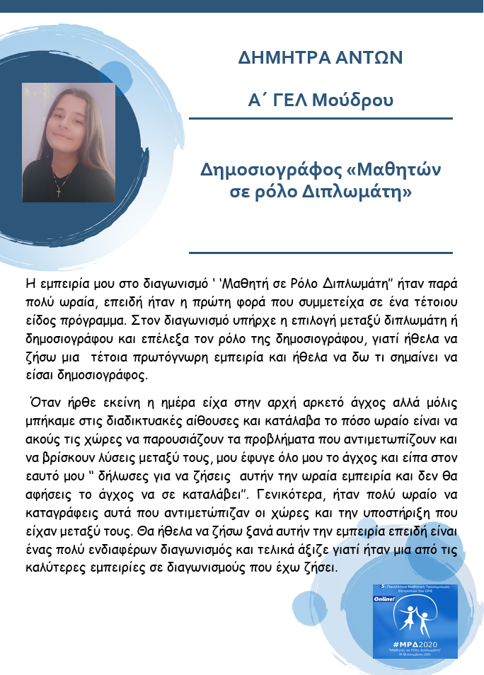 Οι μαθήτριες Νικολέττα Δήμου ως Διπλωμάτης της Τυνησίας στην Επιτροπή για την Ελευθερία Σκέψης, Συνείδησης και Θρησκείας και οι Δήμητρα Άντων και Αποστολία Ειρήνη Λαγού ως Δημοσιογράφοι των Διπλωματικών συζητήσεων για την Ελευθερία της Έκφρασης και το Δικαίωμα στη Ζωή εκπροσώπησαν το σχολείο μας και τη Λήμνο. Οι μαθήτριες δήλωσαν ενθουσιασμένες από το Πρόγραμμα και μοιράζονται τις εμπειρίες τους.