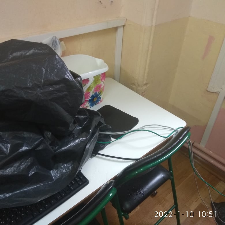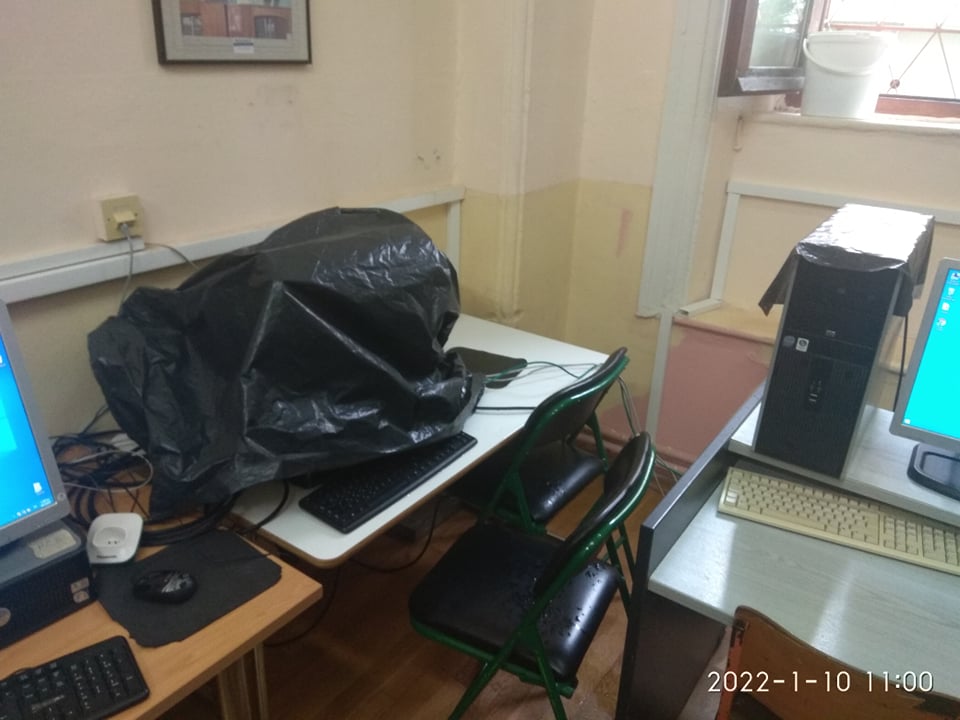 "Εργαστήριο Πληροφορικής 1ου Δημοτικού Μύρινας. Στάζει η οροφή από πέρσι. Η υπόσχεση του Δήμου ήταν ότι θα είχε φτιαχτεί μέχρι τα Χριστούγεννα.