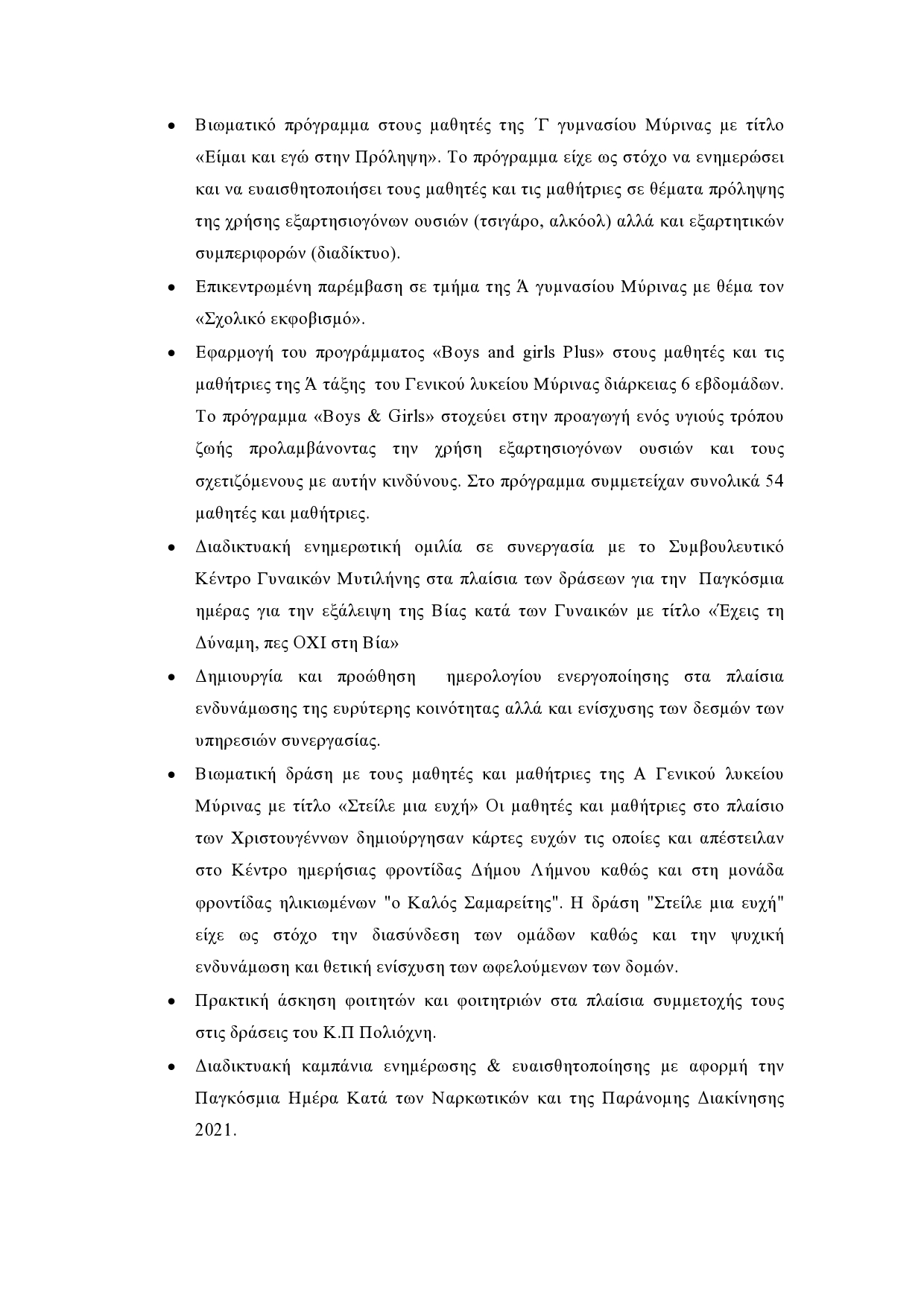 - Εφαρμογή του προγράμματος «Boys and girls Plus» στους μαθητές και τις μαθήτριες της Ά τάξης του Γενικού λυκείου Μύρινας διάρκειας 6 εβδομάδων. Το πρόγραμμα «Boys & Girls» στοχεύει στην προαγωγή ενός υγιούς τρόπου ζωής προλαμβάνοντας την χρήση εξαρτησιογόνων ουσιών και τους σχετιζόμενους με αυτήν κινδύνους. Στο πρόγραμμα συμμετείχαν συνολικά 54 μαθητές και μαθήτριες.