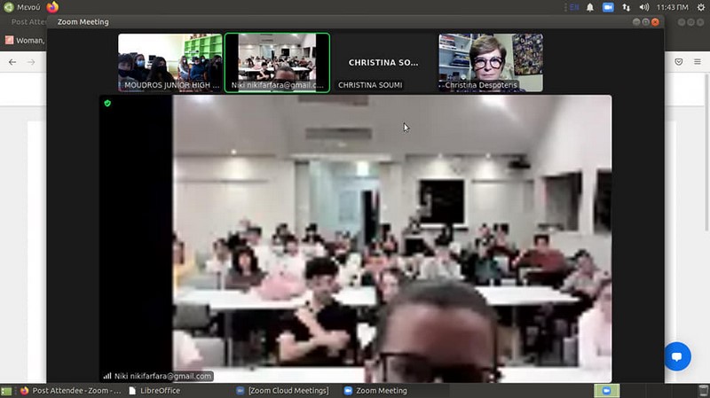 Ακολούθησε απαγγελία του "Σημείου Αναγνωρίσεως" της Κικής Δημουλά από μαθήτριες του Γυμνασίου Μούδρου, παρουσιάσεις σπουδαίων γυναικών από τους μαθητές του Dandenong, ένα καταπληκτικό padlet, συνεργατικό από τους μαθητές και τους εκπαιδευτικούς των δύο ηπείρων και ένα πρωτότυπο κι ιδιαίτερα ενδιαφέρον quiz γνώσεων, δημιουργημένο από την εκπαιδευτικό του σχολείου μας κ. Μέρμηγκα Χρυσούλα στα αγγλικά για αλληλεπίδραση και ενδιαφέρον για τη σύγχρονη γυναίκα της Αυστραλίας και της Ελλάδας.