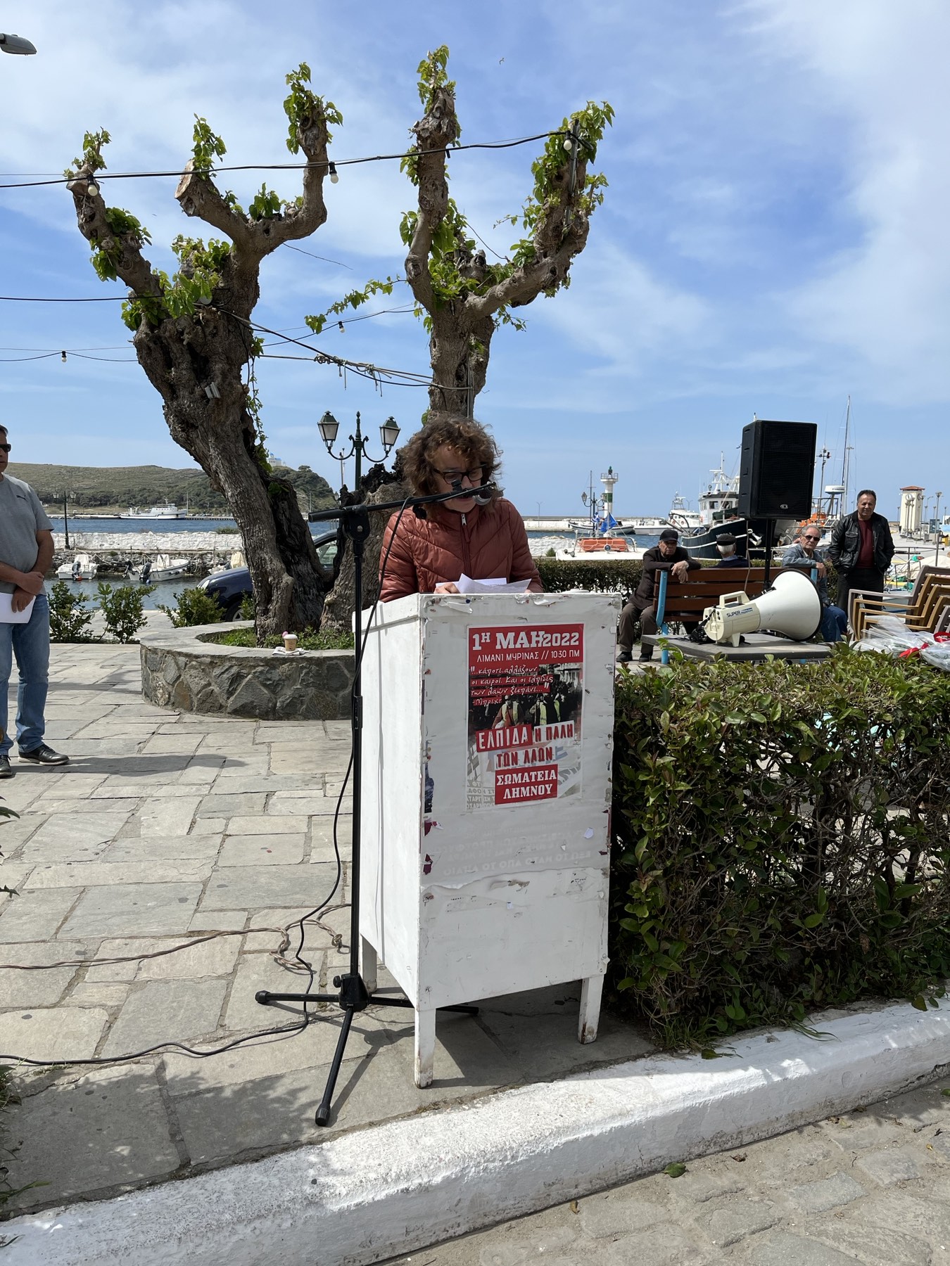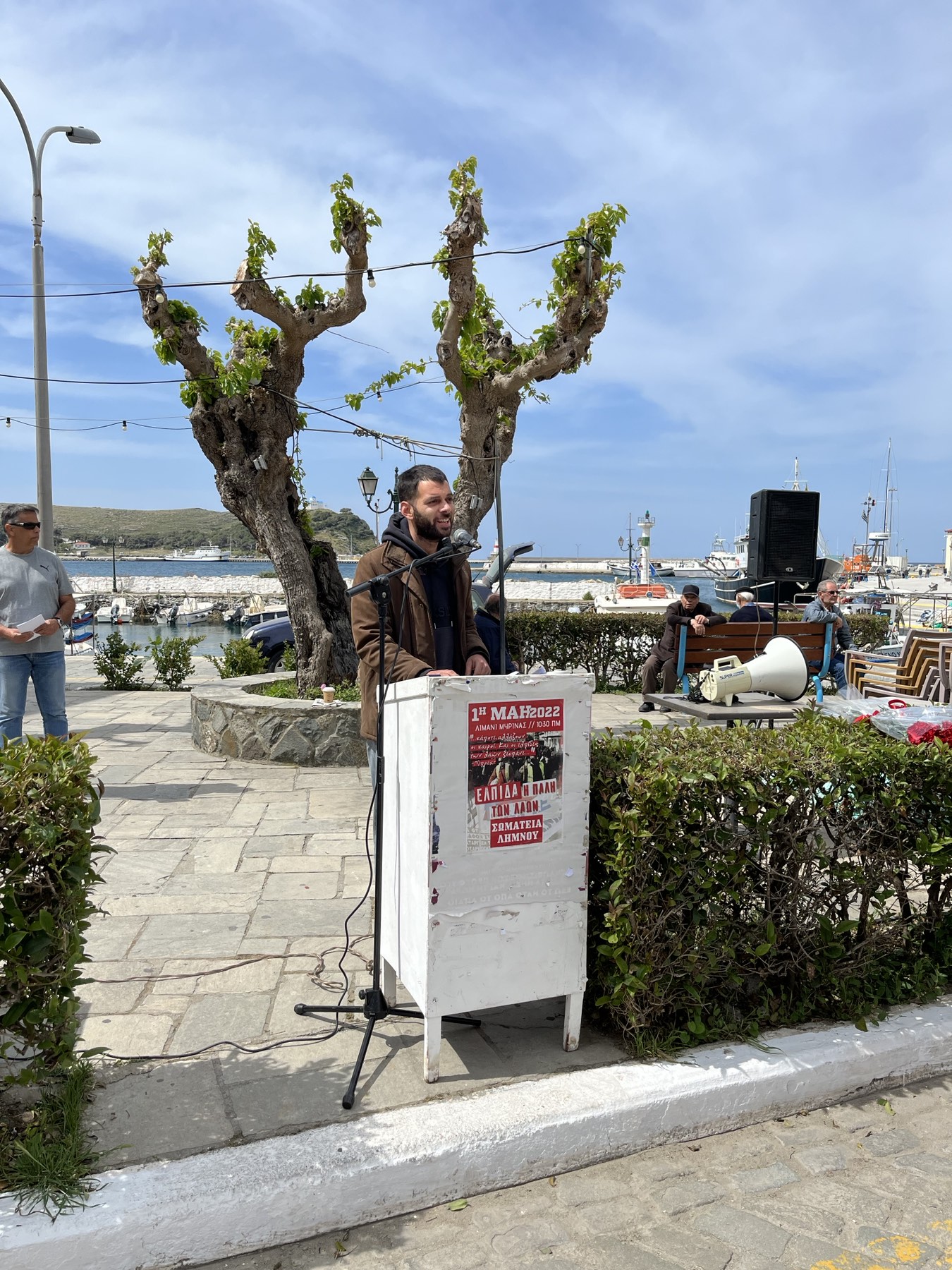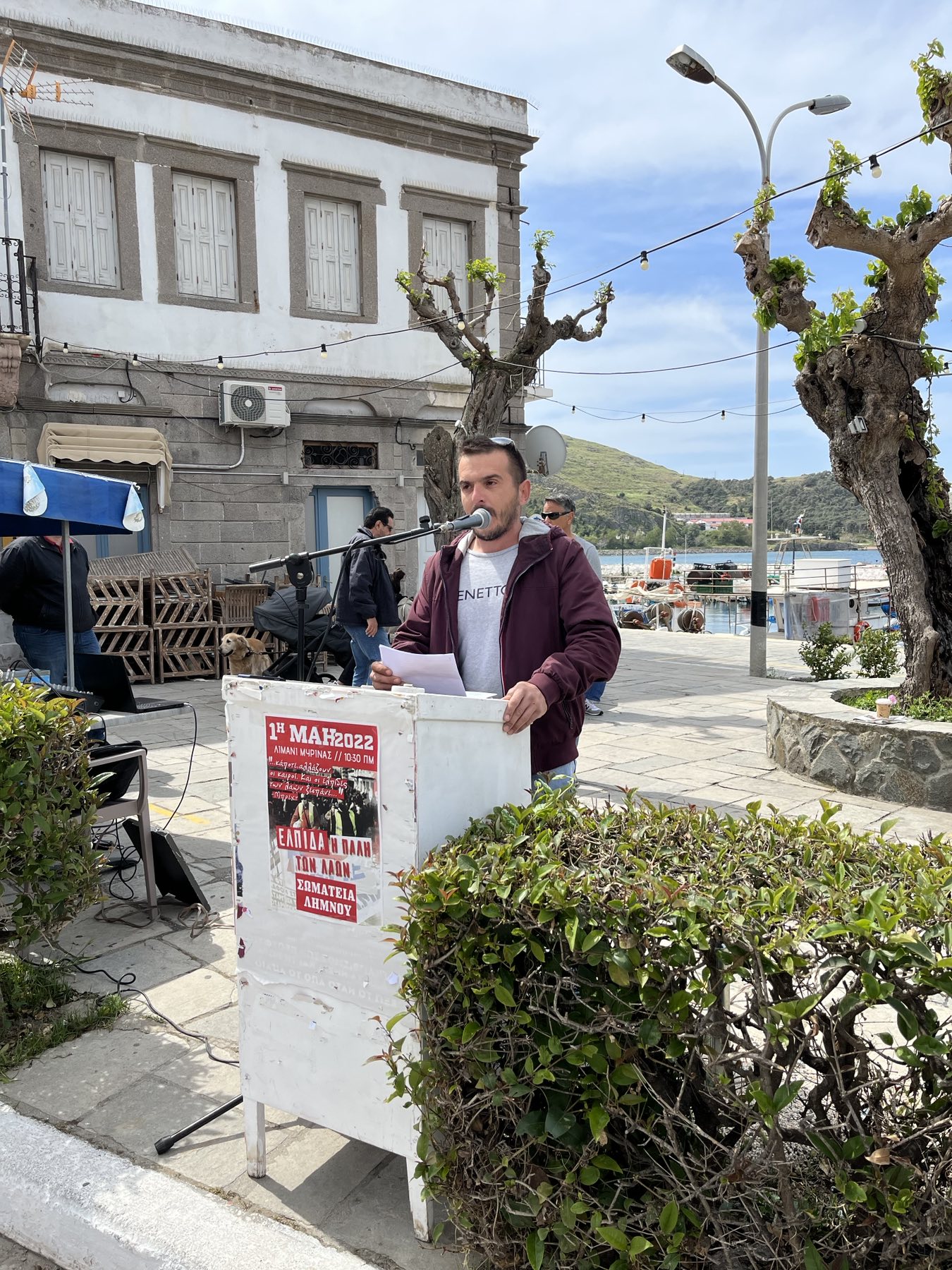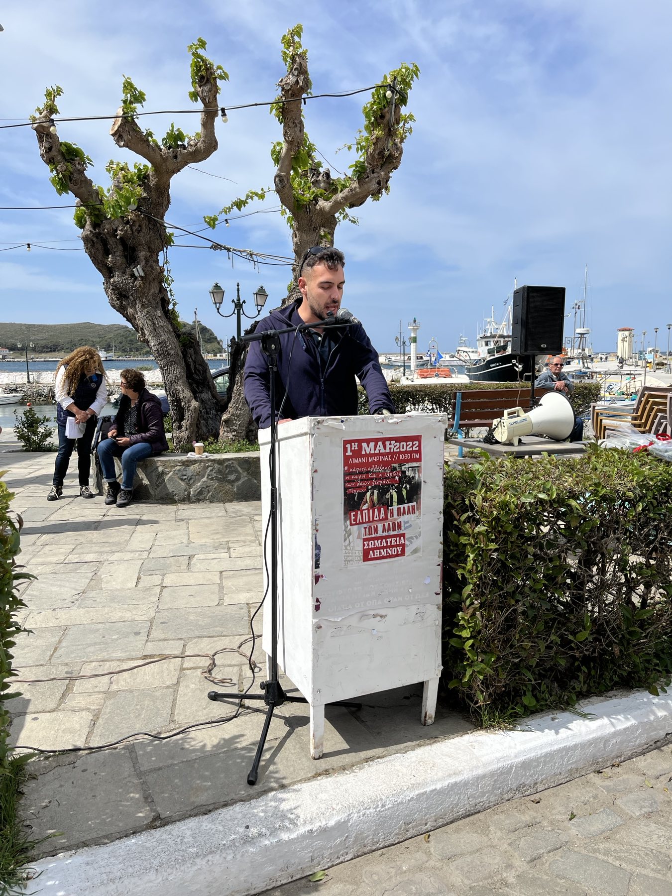 Οι εργαζόμενοι και οι κάτοικοι της Λήμνου που συγκεντρωθήκαμε σήμερα Κυριακή 1η Μαΐου 2022 στο λιμάνι της Μύρινας, τιμούμε την εργατική Πρωτομαγιά με τη συνέχιση των αγώνων μας για να ικανοποιηθούν τα δίκαια αιτήματα των εργαζόμενων και των λαϊκών στρωμάτων στη Λήμνο, αλλά και σε όλη την Ελλάδα.