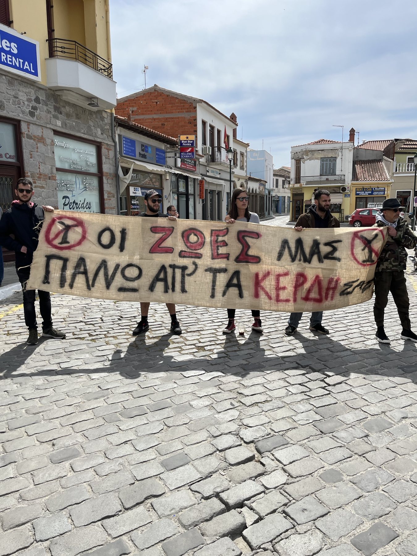Στη συγκέντρωση απηύθυναν χαιρετισμούς ο Γιάννης Πλάντζος, πρόεδρος του Σωματείου Συνταξιούχων Λήμνου, η Άννα Ταμβάκη , μέλος του ΔΣ του Σωματείου Ξενοδοχοϋπαλλήλων Λήμνου, ο Θανάσης Γεωργαντής, μέλος της επιτροπής αγώνα του υπό σύσταση Σωματείου Ιδιωτικών Υπαλλήλων Λήμνου και ο Γιάννης Χατζηχαραλάμπους, μέλος της επιτροπής αγώνα ενάντια στην καταστροφική για το νησί επένδυση υπεράκτιου αιολικού πάρκου, από επιχειρηματικό όμιλο.