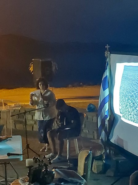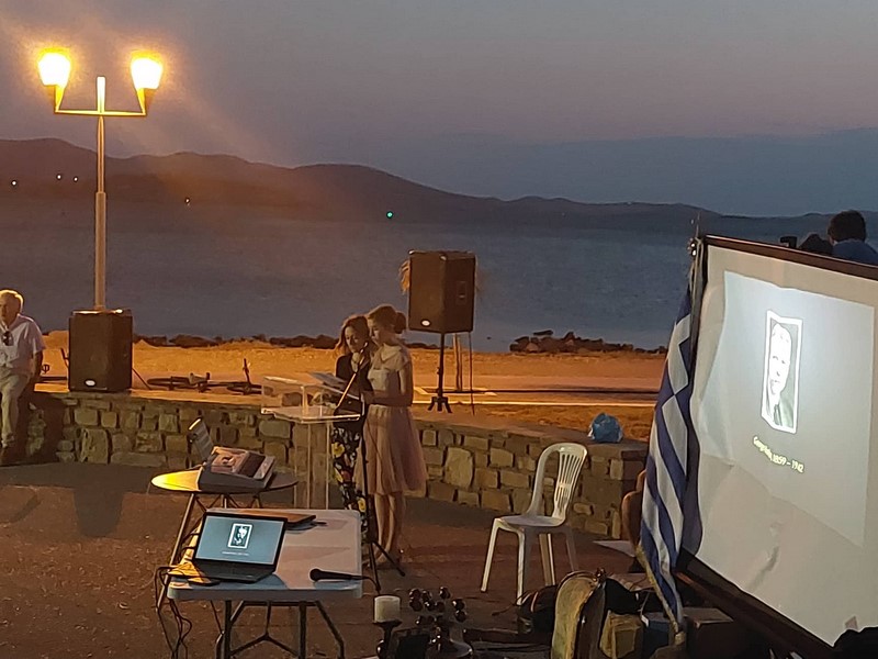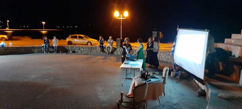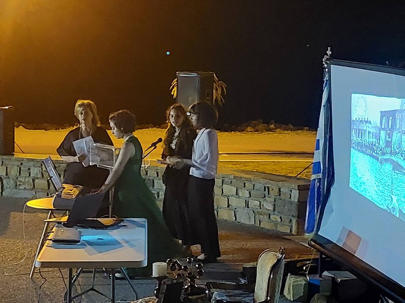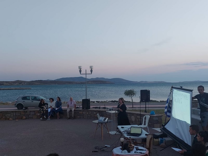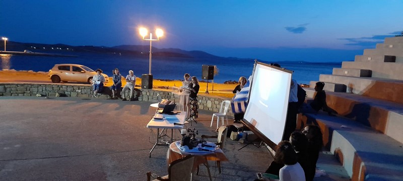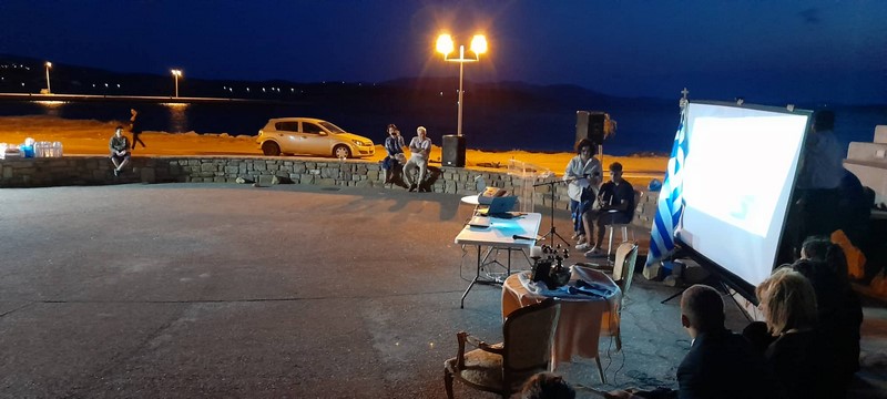 Ακολούθησε η προβολή του ντοκυμαντέρ «Με το χέρι στην καρδία» το οποίο δημιουργήθηκε με τη συνεργασία των δύο σχολείων και θα παρουσιαστεί στο Διανησιωτικό Φεστιβάλ Μαθητικών Ταινιών Cineμάθεια στη Χίο το επόμενο Σαββατοκύριακο. Οι μαθήτριες του ΓΕ.Λ. Μούδρου Σέχου Κριστιάνα και Στενού Σταυρούλα παρουσίασαν την αναφορά του Αμερικανού προξένου Σμύρνης Τζωρτζ Χόρτον προς το Στέητ Ντηπάρτμεντ «Ποιος τελικά φταίει για την Καταστροφή;» και απαγγέλθηκε η «Μικρή πράσινη θάλασσα» του Οδυσσέα Ελύτη από τη μαθήτρια του ΓΕ.Λ. Μούδρου Κοτσιλίτη Παναγιώτα. Στη συνέχεια προβλήθηκε το ντοκυμαντέρ «Φώτης Κόντογλου, από Αϊβαλί Μικράς Ασίας» που δημιουργήθηκε από μαθήτριες του Γυμνασίου Μούδρου στα πλαίσια διαγωνισμού της Εκκλησίας της Ελλάδας και του Υπουργείου Παιδείας και Θρησκευμάτων.