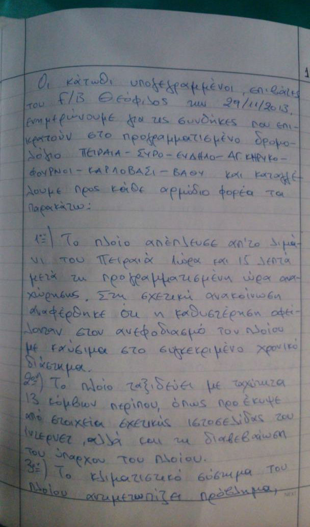 Δηλώνουν ότι οι αξιωματικοί του πλοίου, απάντησαν στα παράπονά τους, ότι το πλοίο άργησε να φύγει γιατί ανεφοδιάζονταν, ότι δεν πηγαίνει αργά, αλλά τους φαίνεται, ότι φταίνε οι ίδιοι για τη μη λειτουργία των WC, καθώς και άλλες δικαιολογίες. Εν πλω συγκεντρώθηκαν υπογραφές επιβατών και όταν το πλοίο έπιασε το πρώτο λιμάνι (Σύρος) έκαναν καταγγελία στο τοπικό λιμεναρχείο, ενώ οι επόμενες ενέργειες θα γίνουν όταν φτάσουν στο νησί τους και φυσικά όταν συνέλθουν.