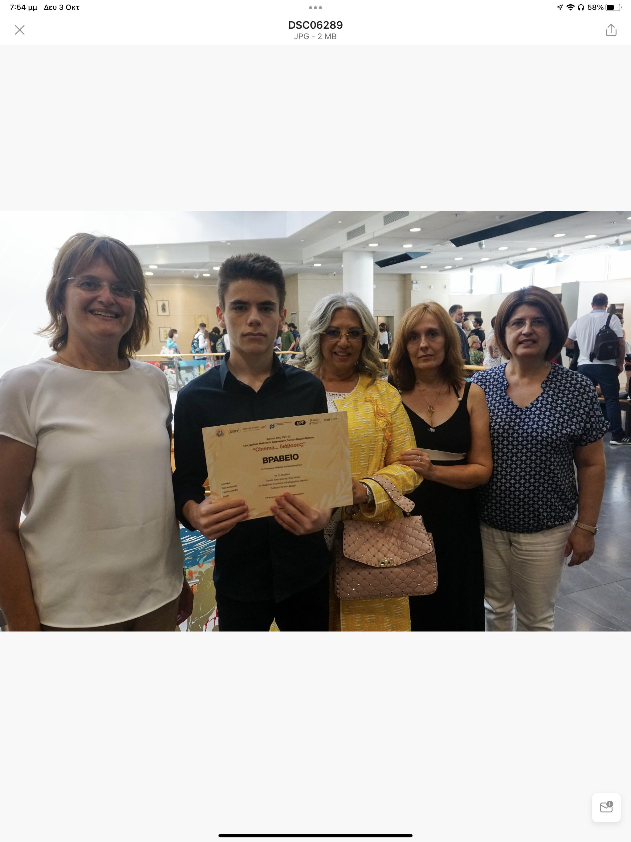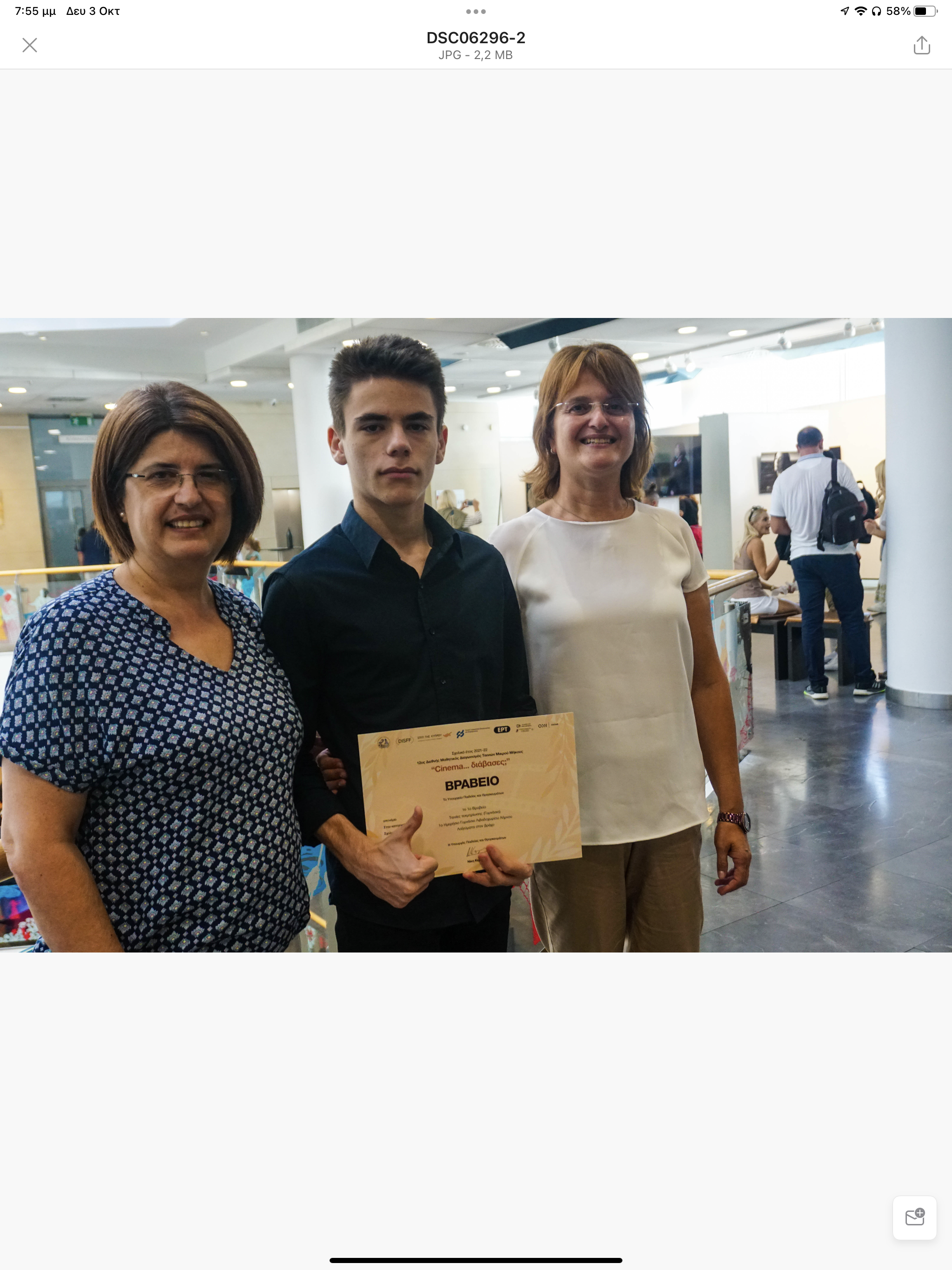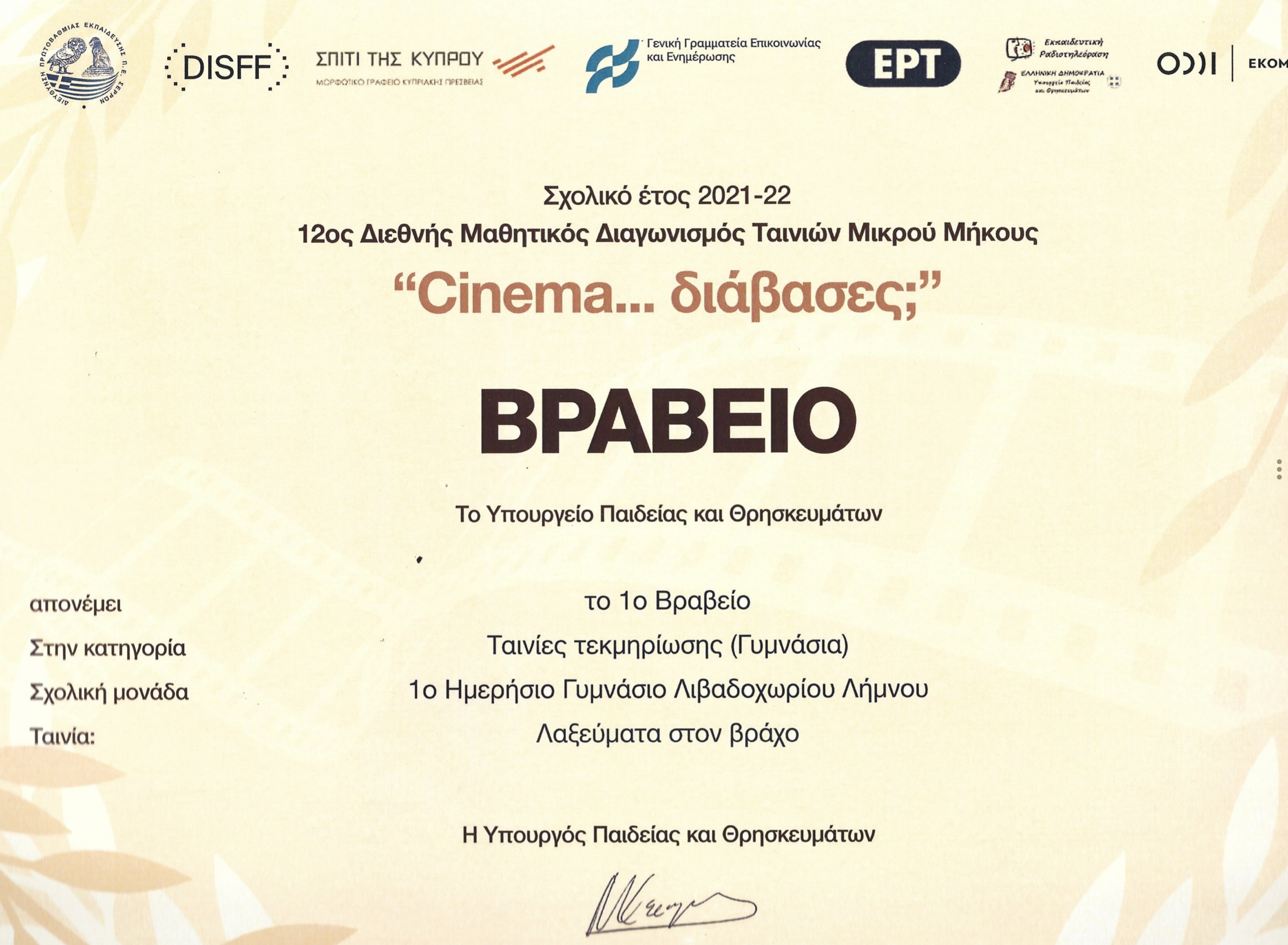 Την Παρασκευή 30 Σεπτεμβρίου πραγματοποιήθηκε στο Θέατρο του Ιδρύματος Μιχάλης Κακογιάννης στην Αθήνα, η εκδήλωση βράβευσης των μαθητικών ταινιών που διακρίθηκαν στον 12ο Διεθνή Μαθητικό Διαγωνισμό Ταινιών Μικρού Μήκους “Cinema… διάβασες;” και στον οποίο το Γυμνάσιο Λιβαδοχωρίου, απέσπασε το 1ο βραβείο Τεκμηρίωσης