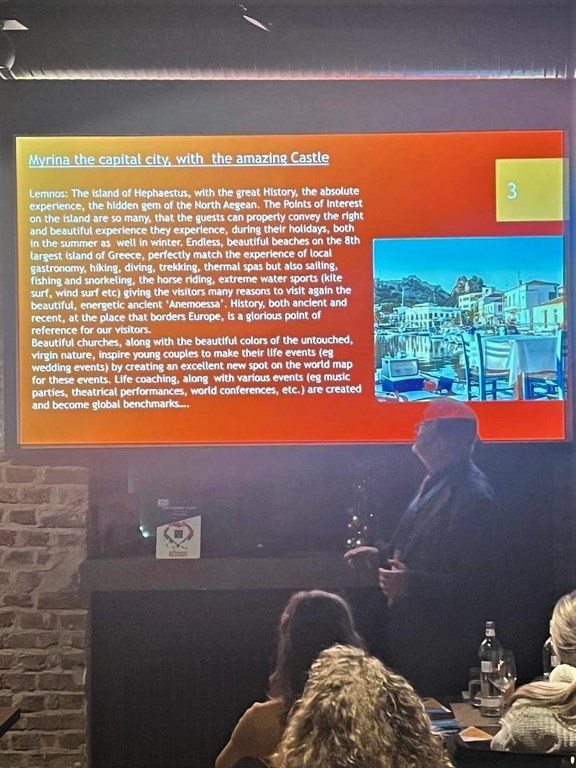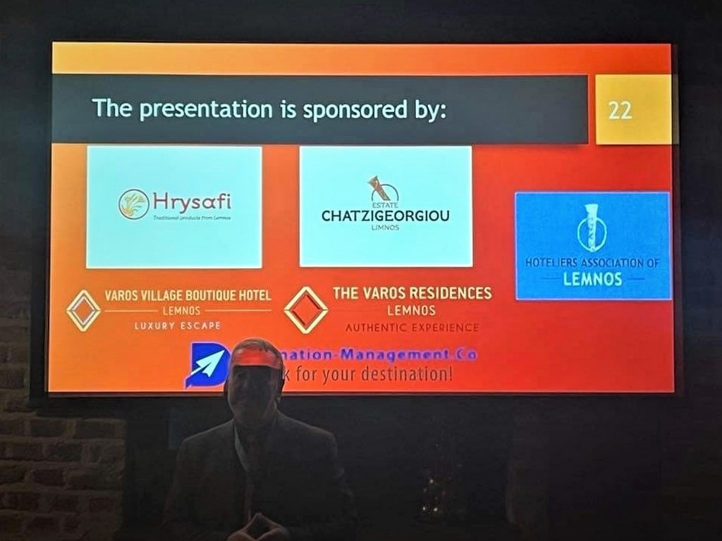 Η παρουσίαση έγινε από τον Πρόεδρο της Ένωσης Ξενοδόχων Λήμνου, Κο Στέλιο Μάντζαρη, κατόπιν της απο κοινού ομόφωνης απόφασης που είχε πάρει η Ενωση στις προηγούμενες ΔΣ του. Δημοσιογράφοι μέσων, ραδιοφωνικοί παραγωγοί μαζί με εξειδικευμένους Tour Operators σε ειδικές μορφές τουρισμού έμειναν ενθουσιασμένοι με τον πανέμορφο προορισμό μας. Η παρουσία της Αντι/ρχη Θεσσαλονίκης κας Βούλας Πατουλίδου με την διευθύντρια της Επιτροπής Τουρισμού Θεσ/νικης κας Μαρίας Πουλουκτσή, και η εξαίρετη παρουσίαση και της Θεσσαλονίκης, έδειξαν ακόμα περοσσότερο το πόσο σοβαρή κίνηση προώθησης των προορισμών μας ήταν αυτή.