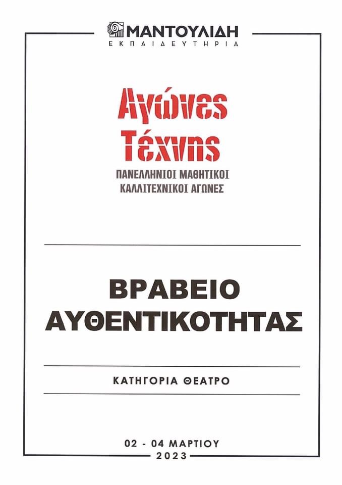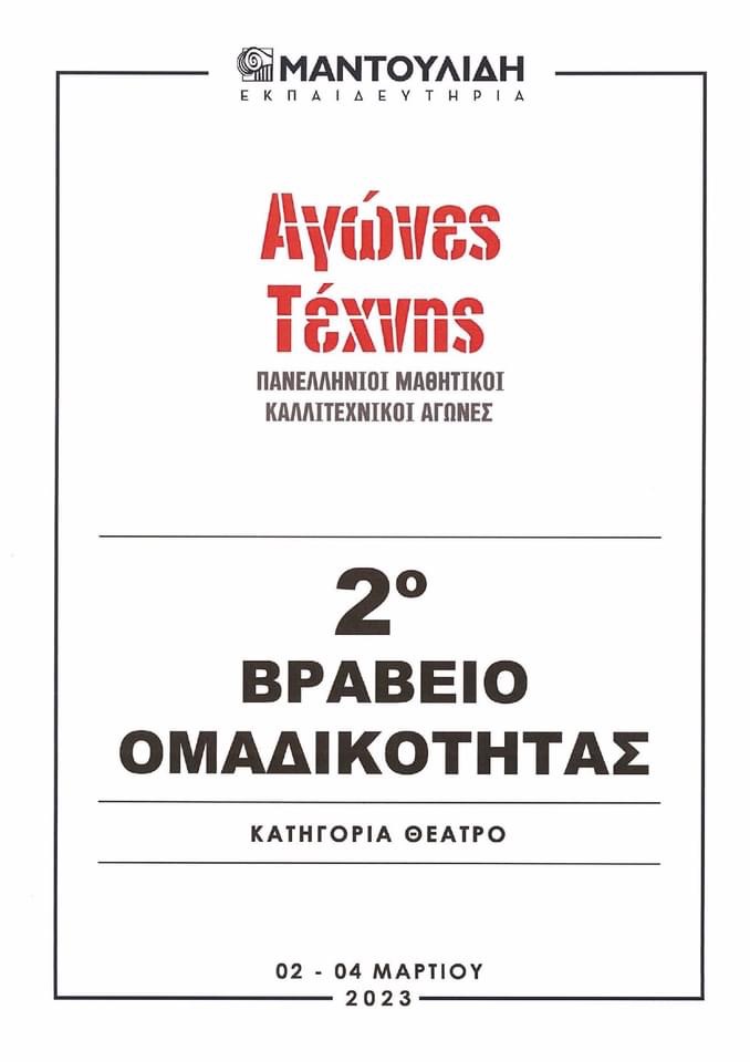 Μπορείτε να παρακολουθήσετε τη θεατρική μας παράσταση στους «Αγώνες Τέχνης» στην ιστοσελίδα: www.livemedia.gr/video/484153