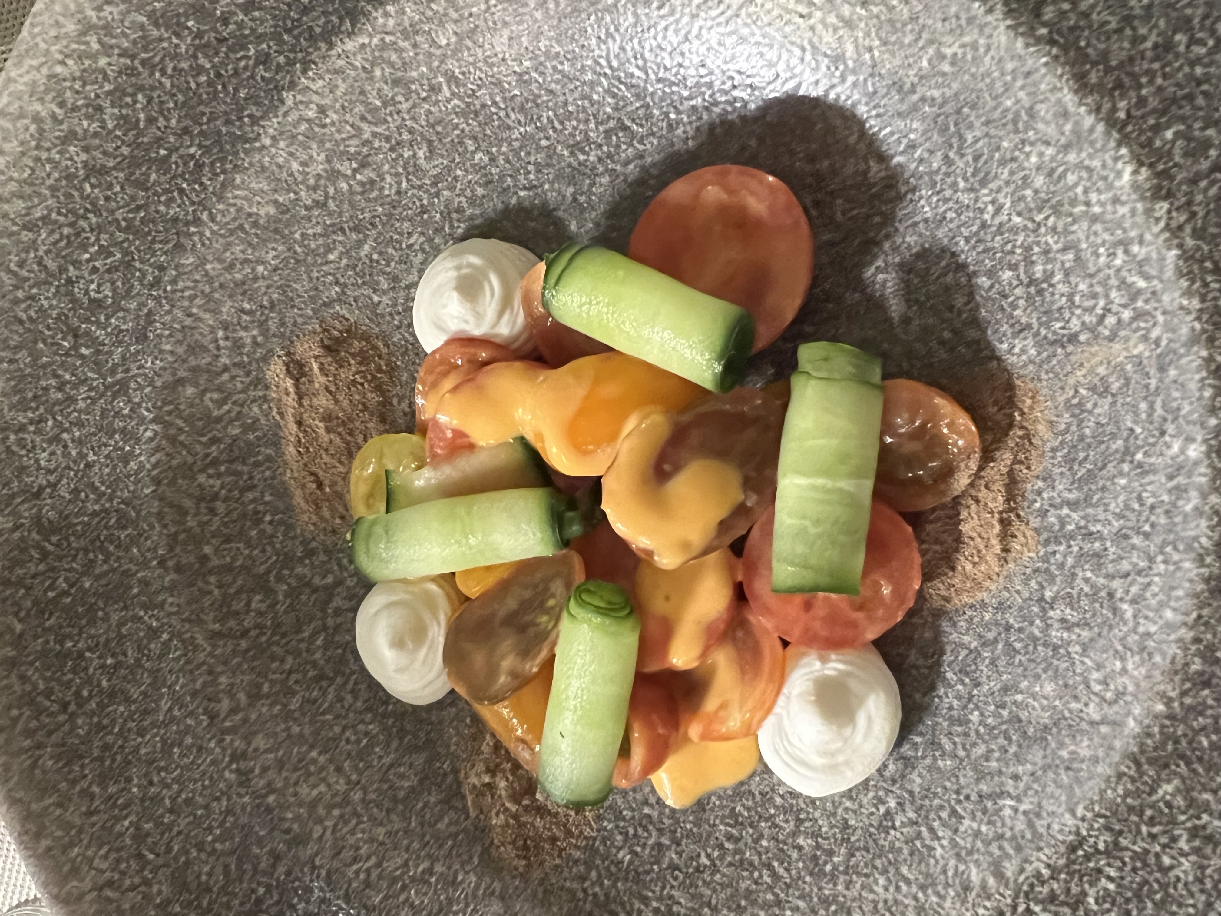Προηγήθηκε η σαλάτα με πολύχρωμα ντοματίνια, κρέμα φέτας, αγγούρι, κάπαρη και βινεγκρέτ ντομάτας. Σ αυτό το πιάτο, ταίριαξε απόλυτα το τρίμμα χαρουποπαξίμαδου, που το απογείωσε.