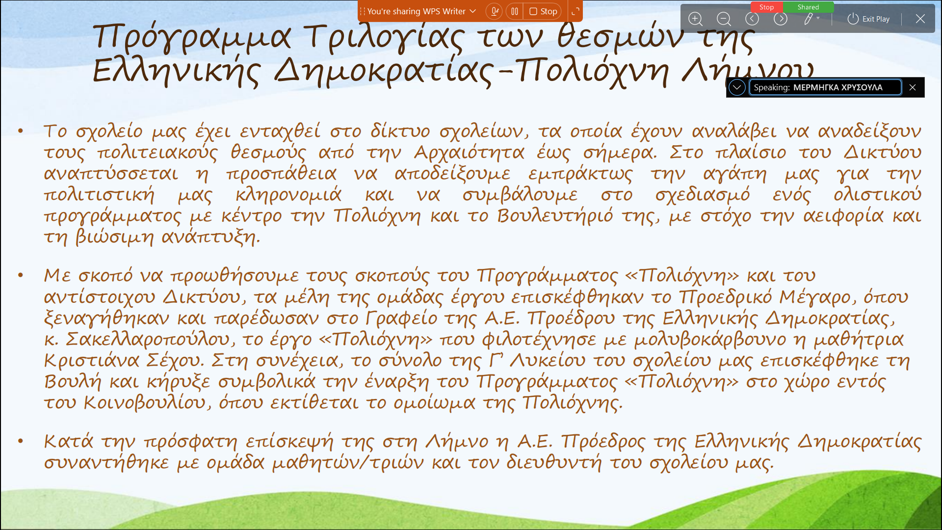 Η παρουσίαση του ΓΕΛ Μούδρου αφιερώνεται στη μνήμη της εξαιρετικής Λημνιάς συγγραφέως, Μαρίας Λαμπαδαρίδου-Πόθου, που από χτες δεν είναι πια μαζί μας, αλλά συνεχίζει να υπάρχει μέσα από το πλούσιο συγγραφικό έργο της. Δε θα ξεχάσουμε ποτέ τη διαρκή υποστήριξή της στα σχολεία του νησιού!