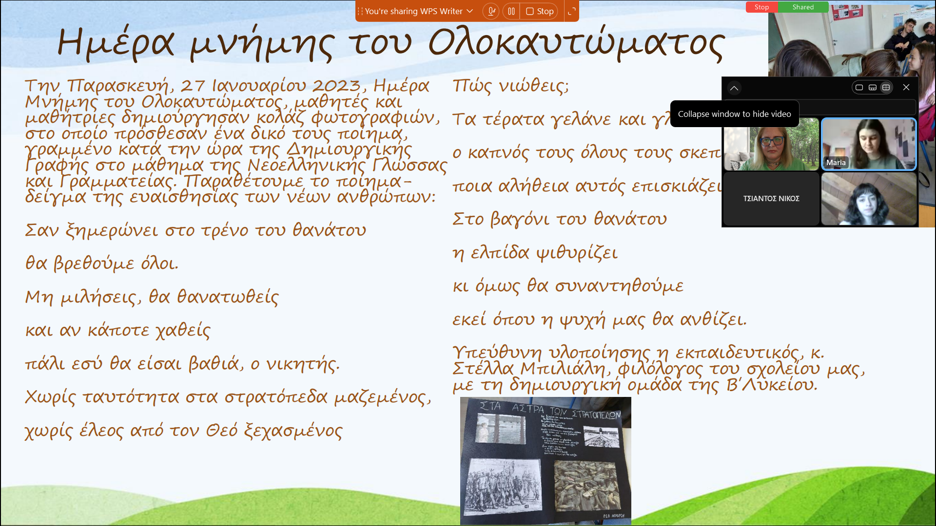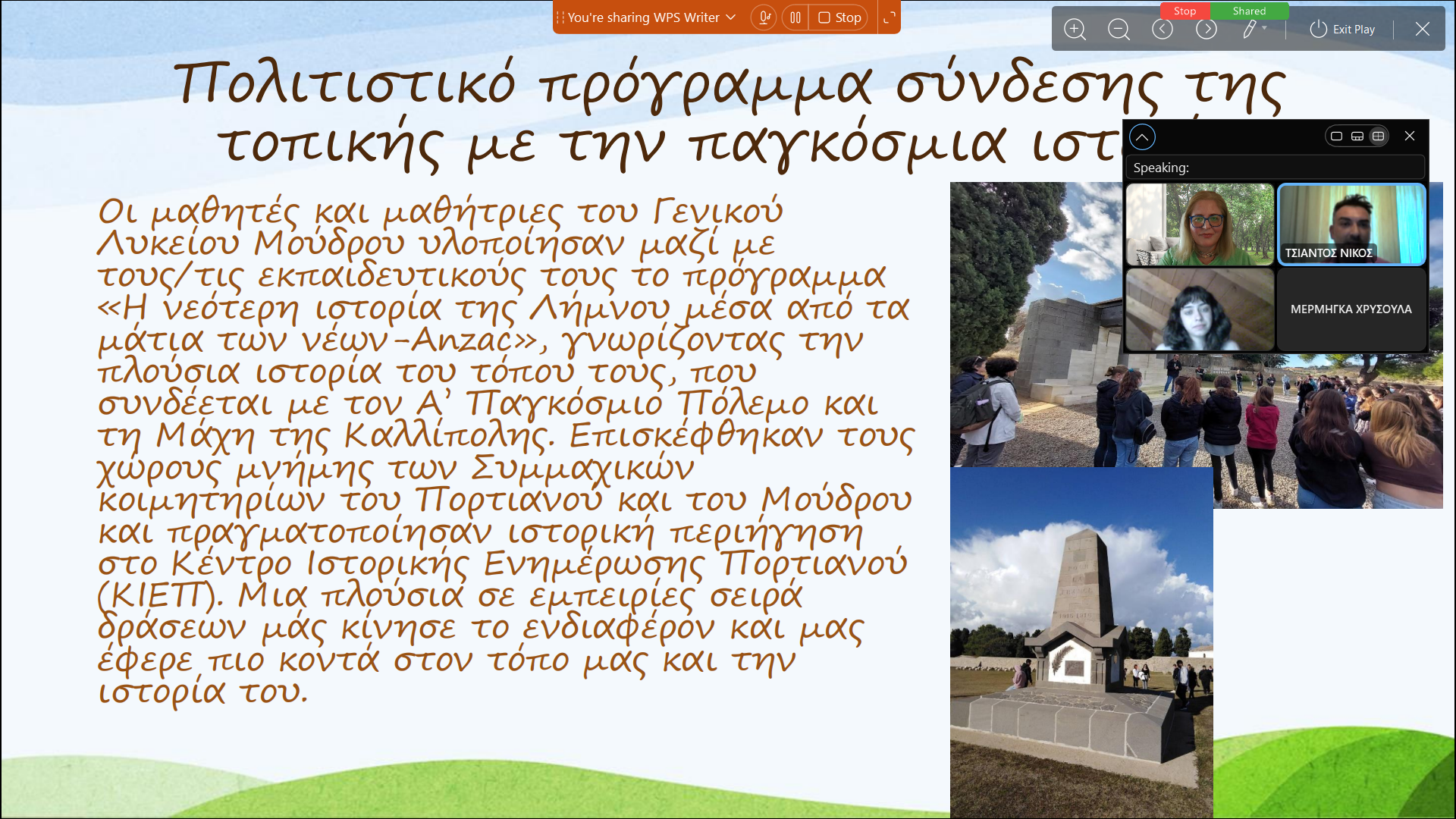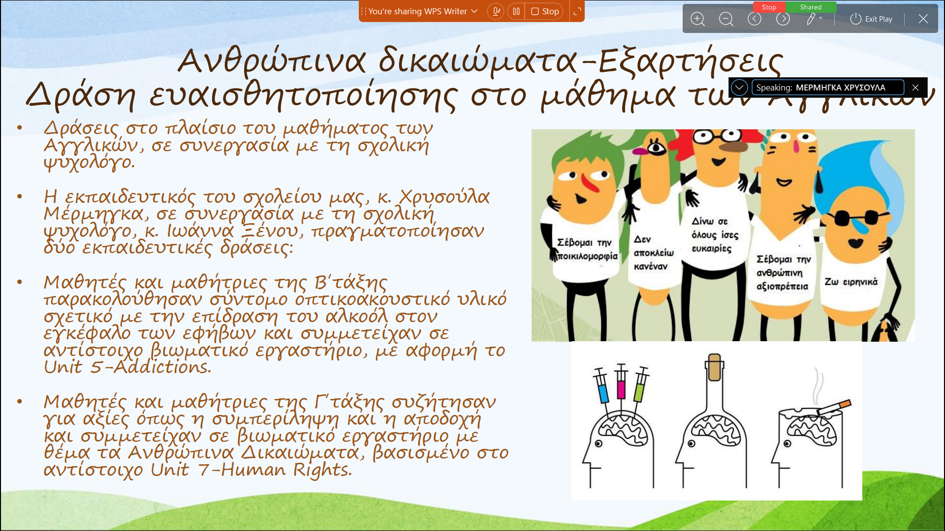 Την οργάνωση και παρουσίαση ανέλαβαν οι εκπαιδευτικοί: Χρυσούλα Μέρμηγκα, Κωνσταντίνος Παπαδόπουλος, Νικόλαος Τσιαντός και Θεοδώρα Λυμπέρη. Συμμετείχαν στην παρουσίαση οι μαθήτριες: Κυβέλη Κωνσταντίνου και Ειρήνη Ταρσή από την Α΄ Λυκείου και Μαρία Λυμπέρη από την Β΄ Λυκείου. Τις ευχαριστούμε θερμά για τη συμμετοχή τους!