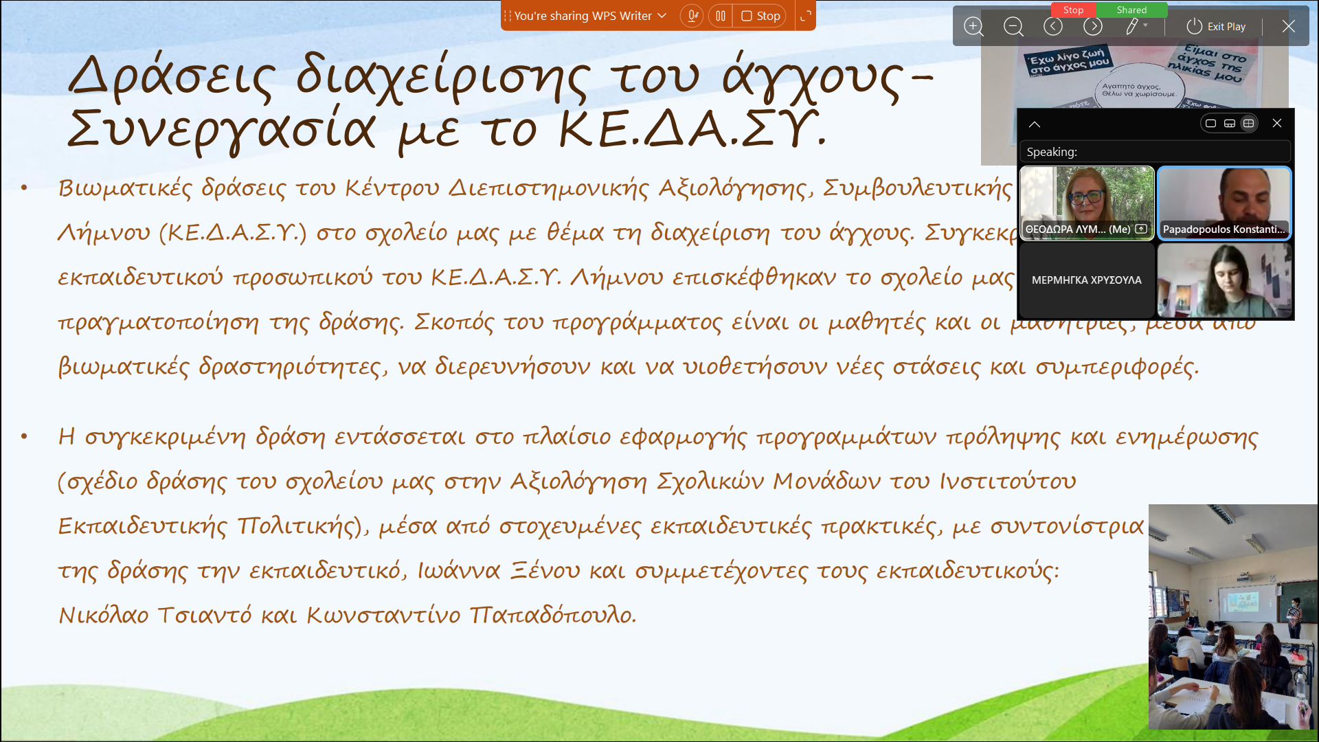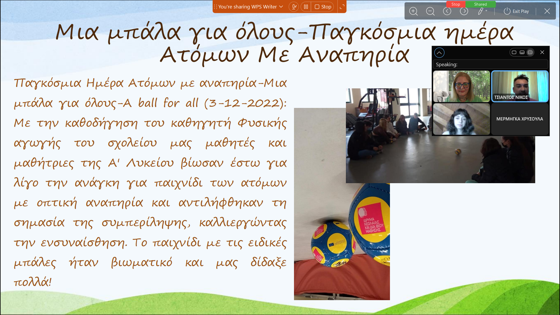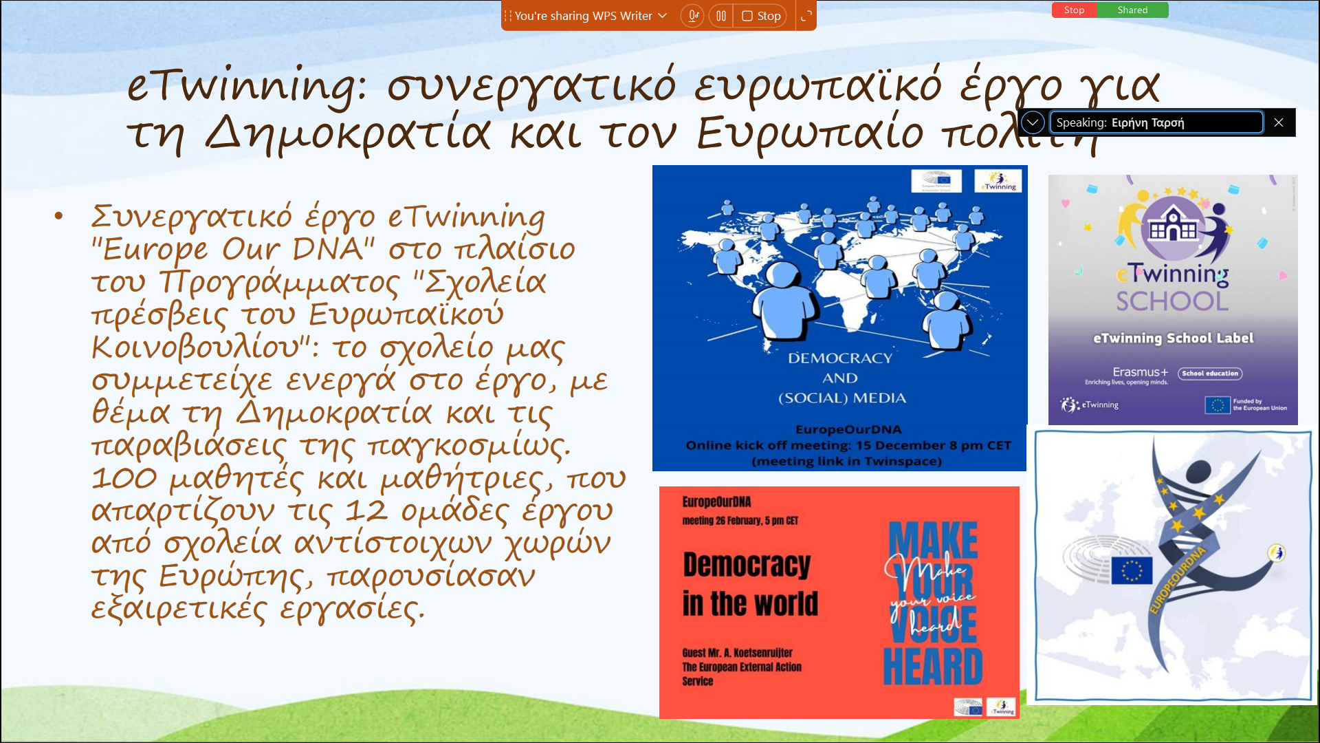 Την οργάνωση και παρουσίαση ανέλαβαν οι εκπαιδευτικοί: Χρυσούλα Μέρμηγκα, Κωνσταντίνος Παπαδόπουλος, Νικόλαος Τσιαντός και Θεοδώρα Λυμπέρη. Συμμετείχαν στην παρουσίαση οι μαθήτριες: Κυβέλη Κωνσταντίνου και Ειρήνη Ταρσή από την Α΄ Λυκείου και Μαρία Λυμπέρη από την Β΄ Λυκείου. Τις ευχαριστούμε θερμά για τη συμμετοχή τους!