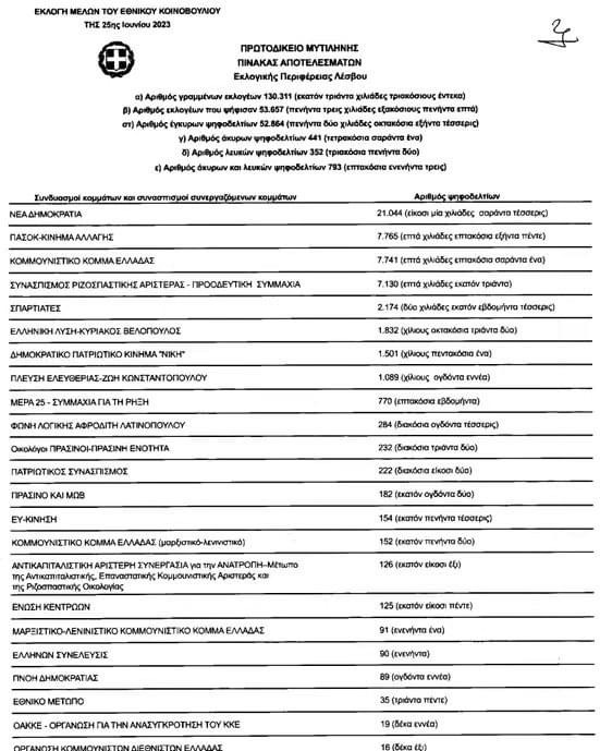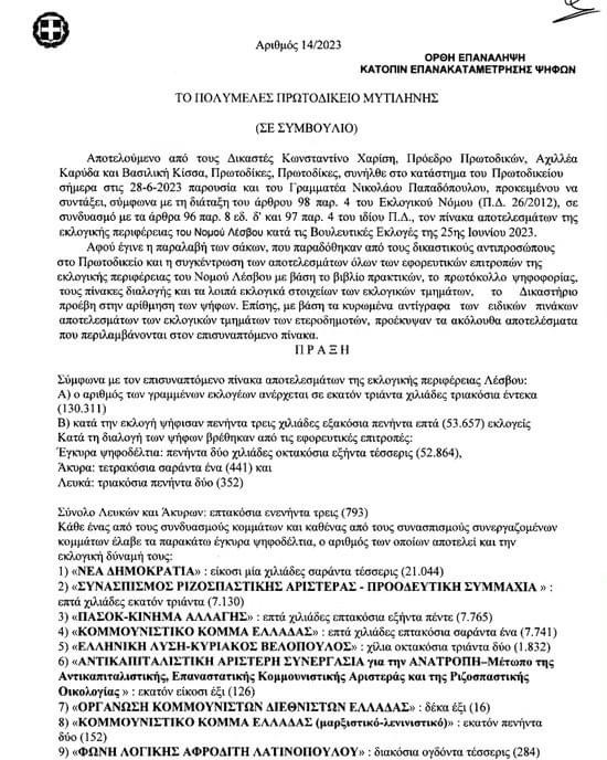 Για αποκατάσταση της αλήθειας, ωστόσο, σημειώνουμε πως σύμφωνα με την υπ’ αριθμόν 14/2023 απόφαση του Πολυμελούς Πρωτοδικείου Μυτιλήνης που ελήφθη στις 28 Ιουνίου 2023 κατόπιν επανακαταμέτρησης των ψήφων προκύπτει πως σε σύνολο 130.311 εγεγγραμμένων ψήφισαν 53.657 συμπολίτες μας, εκ των οποίων οι έγκυρες ψήφοι ήταν 52.864. Από αυτές έλαβαν: