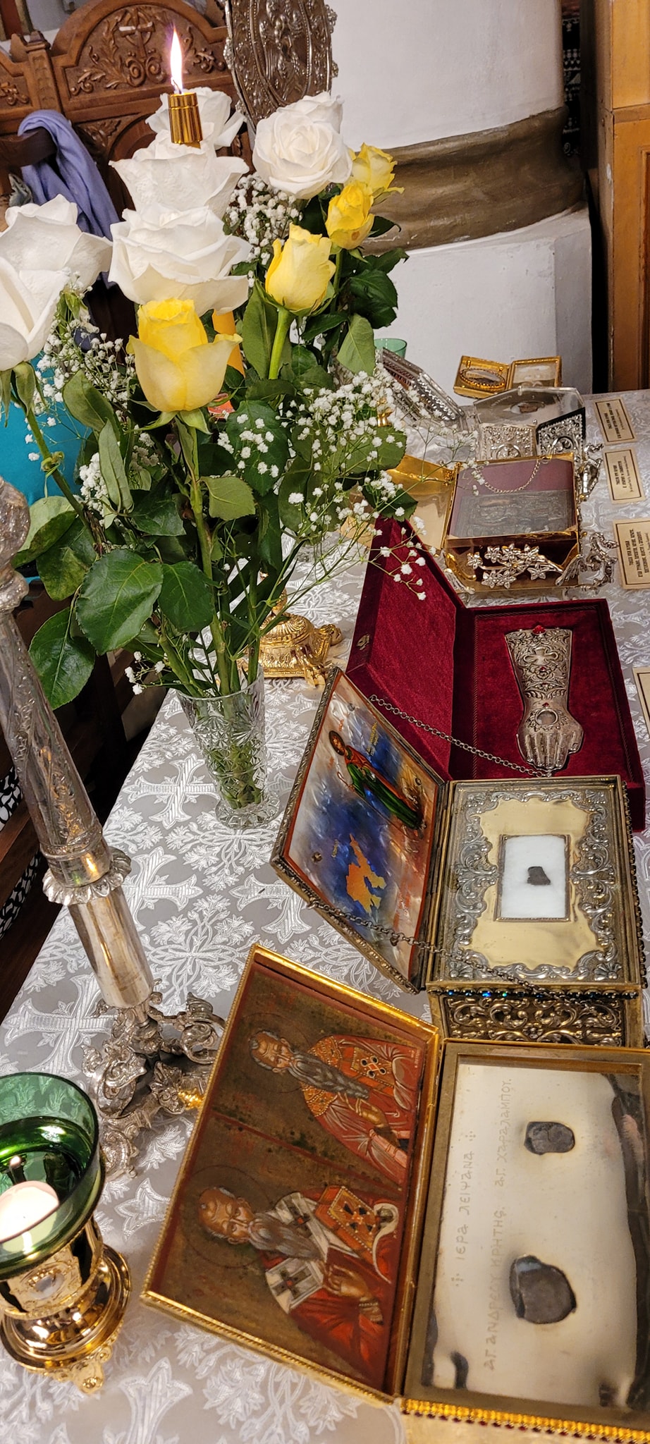 Στη συνέχεια από μέλη του ΧΟΛ "Ο Ήφαιστος", μεταφέρθηκε με λιτανευτική πομπή μέσα από την κεντρική αγορά της Μύρινας, προς τον Ιερό Ναό της Αγίας Τριάδας, όπου και θα παραμείνει μόνιμα.