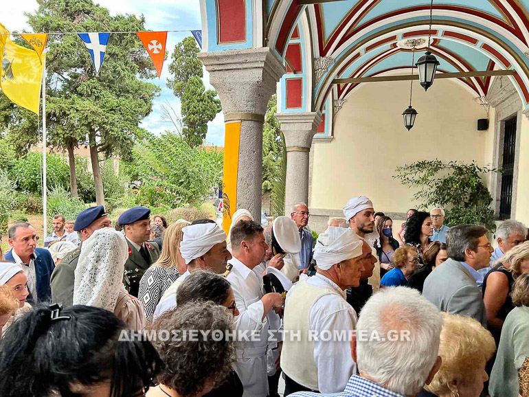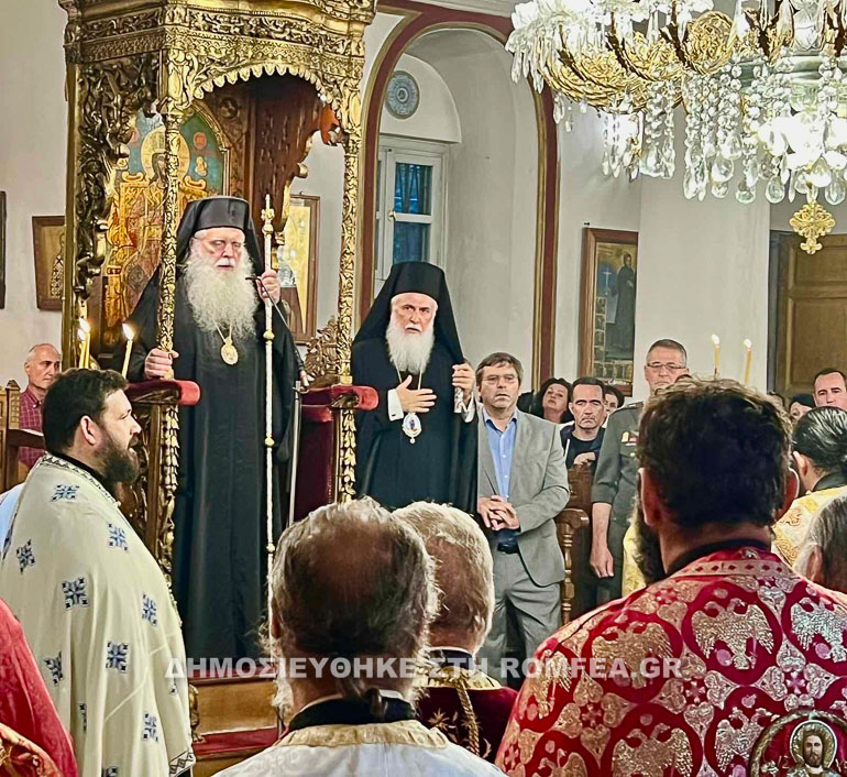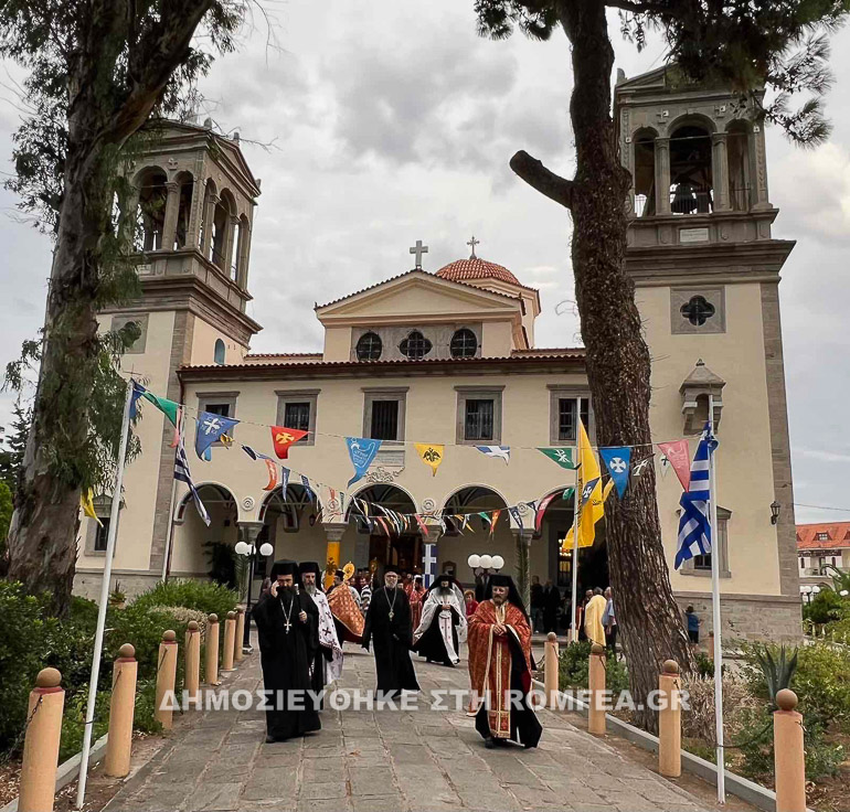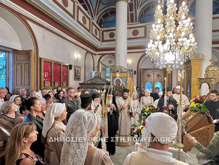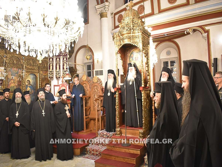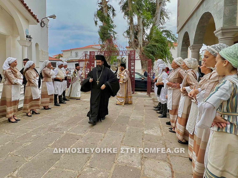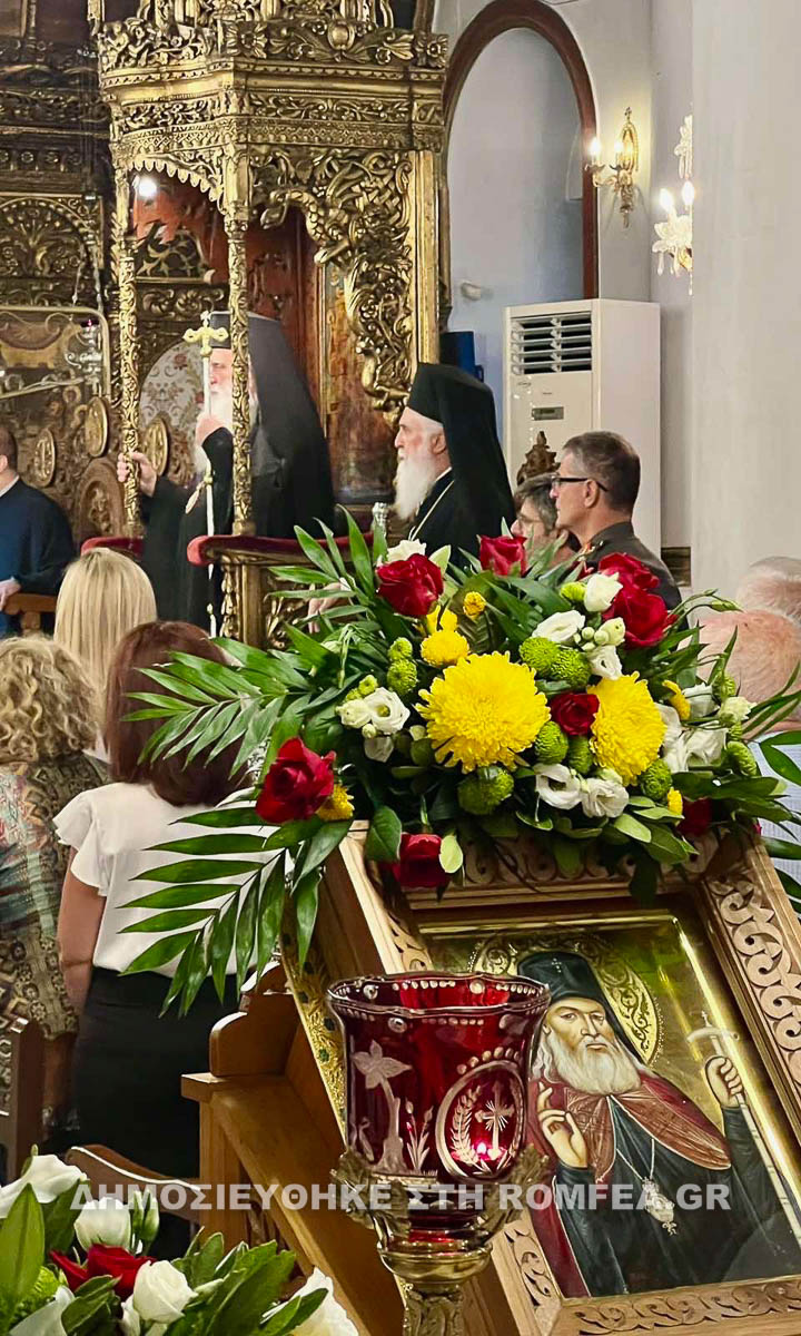 Εν συνεχεία, αναπέμφθηκε σύντομη δέηση ενώπιον του αγίου λειψάνου, το οποίο τιμητικά πλαισίωσαν με παραδοσιακές στολές τα μέλη του Πολιτιστικού Συλλόγου «Ήφαιστος», και αμέσως ακολούθησε ο Μέγας Πολυαρχιερατικός Εσπερινός, στον οποίο χοροστάτησε, ο Σεβ. Μητροπολίτης Αργολίδος κ. Νεκτάριος, συγχοροστατούντων του Σεβ. Μητροπολίτου Μεσογαίας και Λαυρεωτικής κ. Νικολάου και του οικείου Ποιμενάρχου, Σεβ. Μητροπολίτου Λήμνου και Αγίου Ευστρατίου κ. Ιεροθέου.