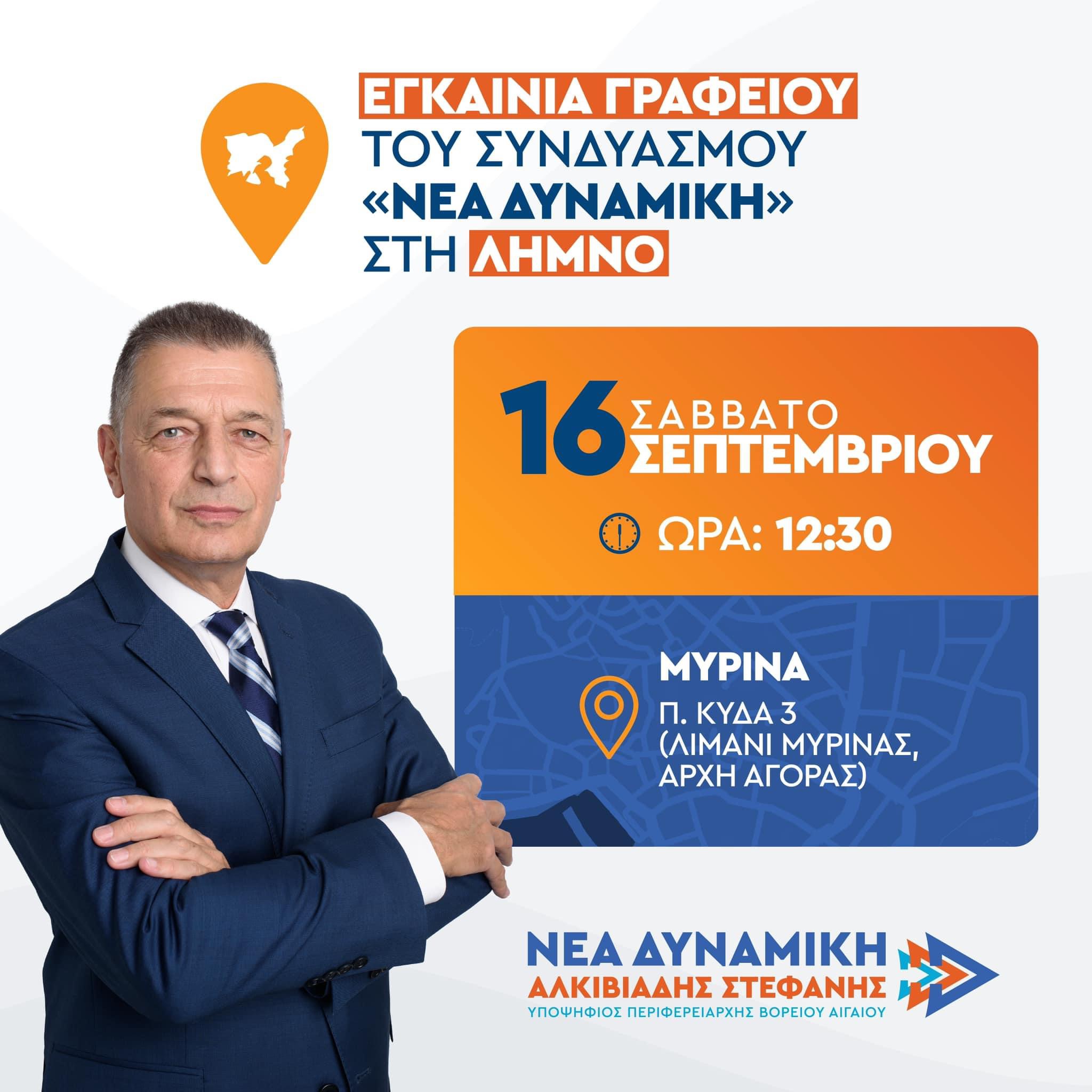 Τα εγκαίνια του εκλογικού κέντρου, το οποίο βρίσκεται στο λιμάνι της Μύρινας, στην αρχή της αγοράς (Π. Κυδά 3) θα πραγματοποιηθούν το Σάββατο 16 Σεπτεμβρίου, στις 12:30.