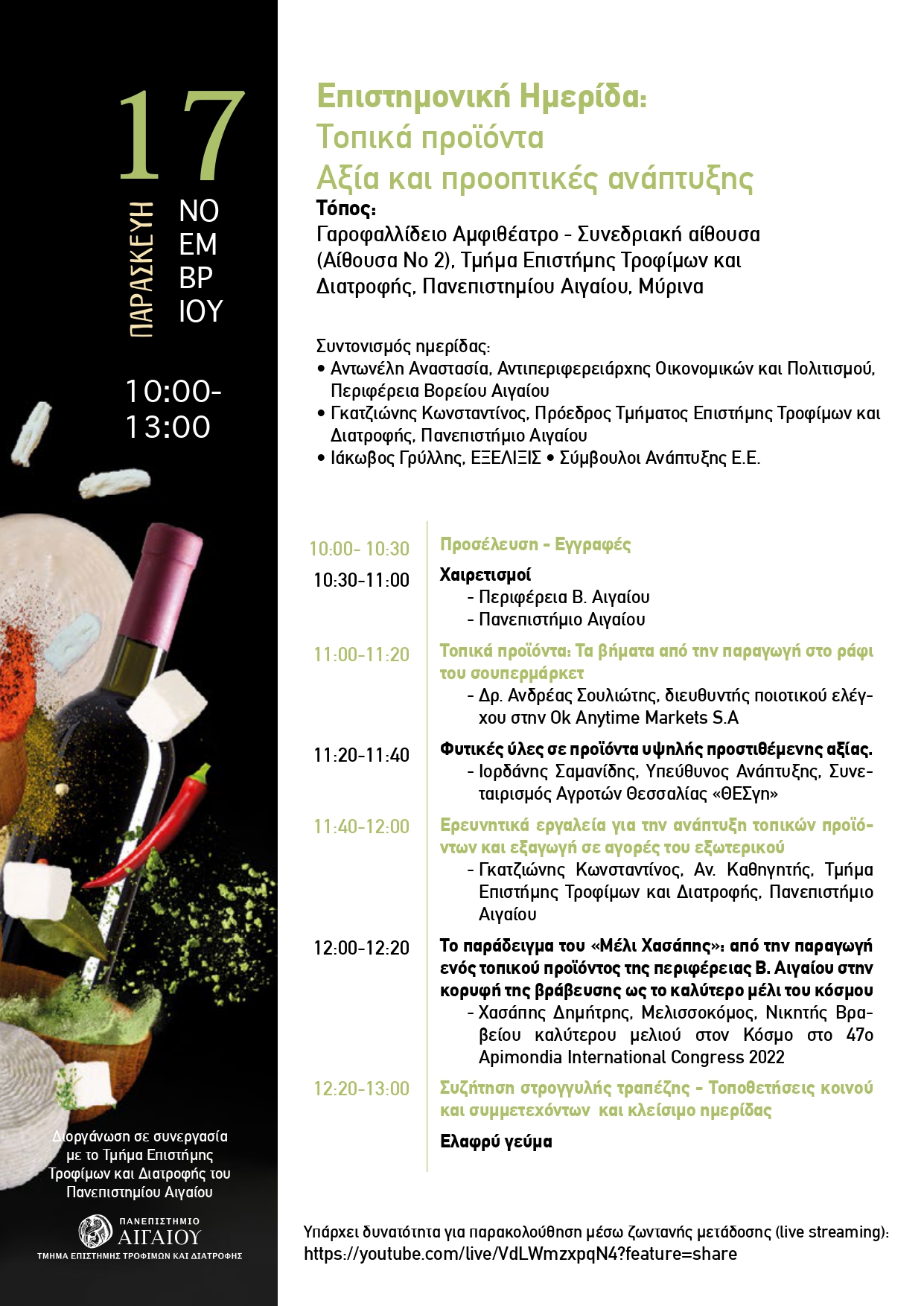 Την Παρασκευή 17 Νοεμβρίου και ώρα 10.00 θα πραγματοποιηθεί Επιστημονική Ημερίδα στην Μύρινα στο Γαροφαλλίδειο Αμφιθέατρο - Συνεδριακή αίθουσα (Αίθουσα Νο 2) με θέμα «Τοπικά προϊόντα –Αξία και προοπτικές ανάπτυξης» στην οποία θα συμμετέχουν διακεκριμένοι ομιλητές ο Δρ. Ανδρέας Σουλιώτης – διευθυντής ποιοτικού ελέγχου στην Ok Anytime Markets S.A, ο κ. Ιορδάνης Σαμανίδης - Υπεύθυνος Ανάπτυξης, Συνεταιρισμός Αγροτών Θεσσαλίας «ΘΕΣγη», ο κ. Γκατζιώνης Κωνσταντίνος- Αν. Καθηγητής, Πρόεδρος του Τμήματος Επιστήμης Τροφίμων και Διατροφής, Πανεπιστήμιο Αιγαίου και ο κ Χασάπης Δημήτρης- Μελισσοκόμος, Νικητής Βραβείου καλύτερου μελιού στον Κόσμο στο 47ο Apimondia International Congress 2022.