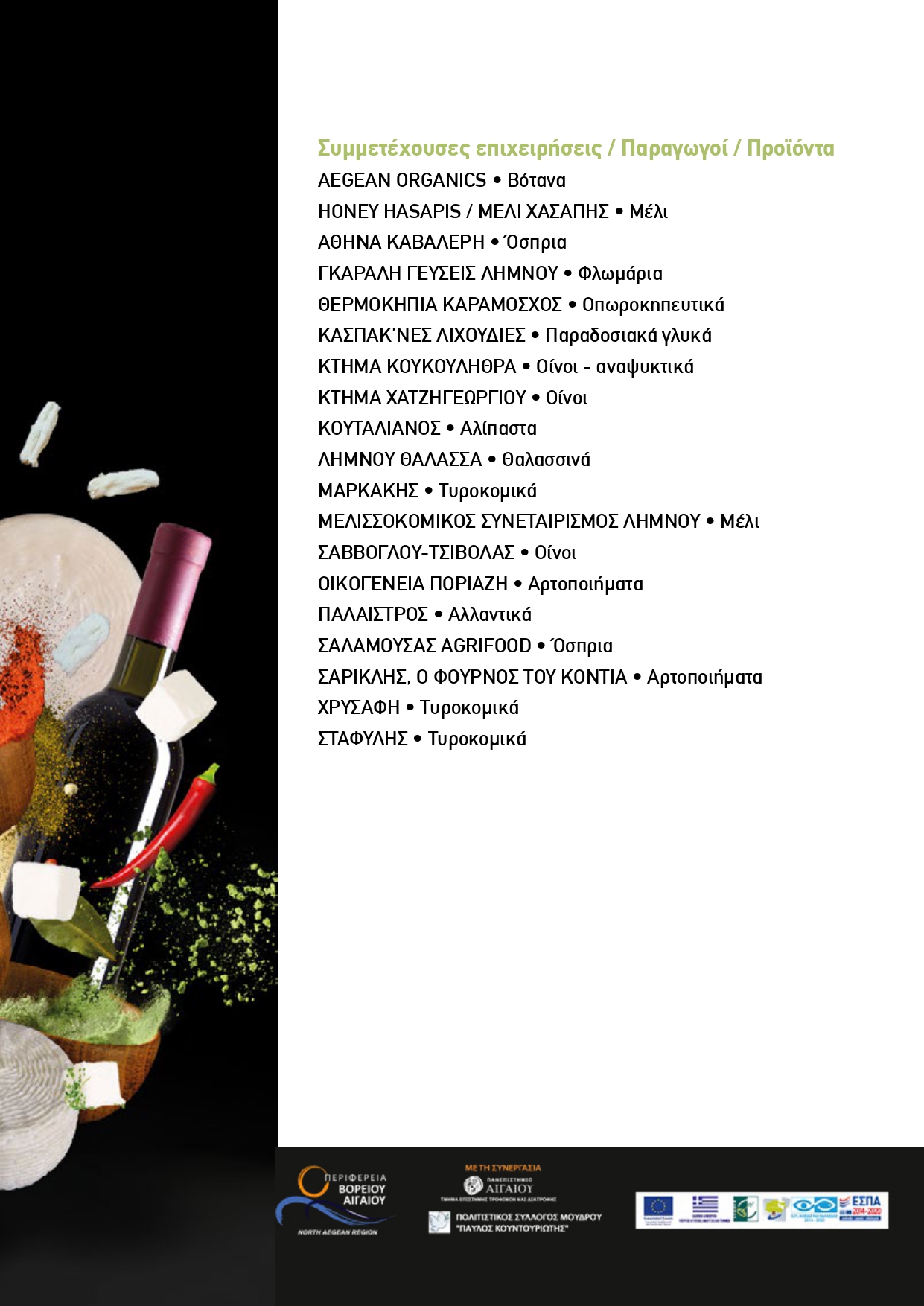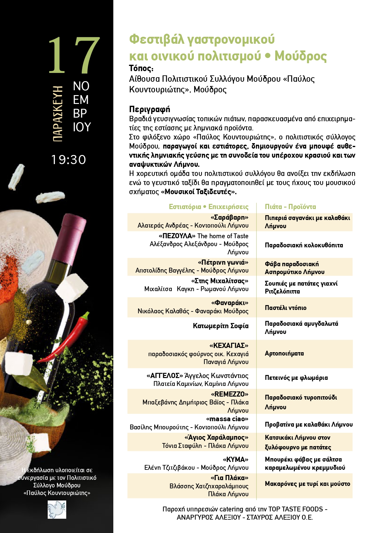 “Σας προσκαλούμε στις εκδηλώσεις που σκοπό έχουν να αναδείξουν τα προϊόντα της Λήμνου καθώς και τις προοπτικές ανάπτυξης του κλάδου αυτού και να ανοίξουν νέους γαστρονομικούς ορίζοντες. Για εμάς η γαστρονομία αποτελεί ένα ξεχωριστό κεφάλαιο για τον Πολιτισμό ενός τόπου που συνεισφέρει στην οικοδόμηση της Ταυτότητας του και δημιουργεί προοπτικές ανάπτυξης.