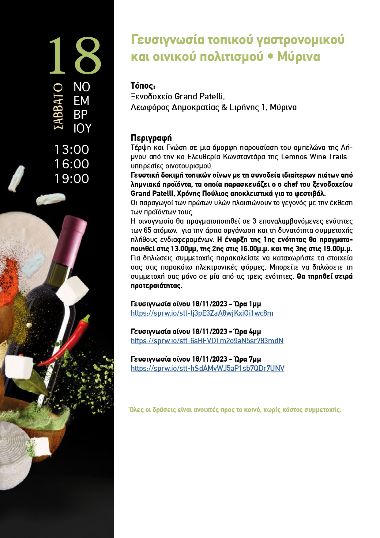 Το Σάββατο 18 Νοεμβρίου θα πραγματοποιηθεί δράση οινογευσίας με την συνοδεία τοπικών εδεσμάτων στο ξενοδοχείο Grand Patelli στην Μύρινα. Η εκδήλωση αυτή θα περιλαμβάνει έκθεση των προϊόντων και ετικετών των οινοπαραγωγών, αλλά και λοιπών τοπικών προϊόντων με τη συμμετοχή τοπικών παραγωγών. Για την συγκεκριμένη δράση θα οργανωθούν τρείς (3) ομάδες δοκιμών των 65 ατόμων με ώρες έναρξης 13:00, 16:00, 19:00.