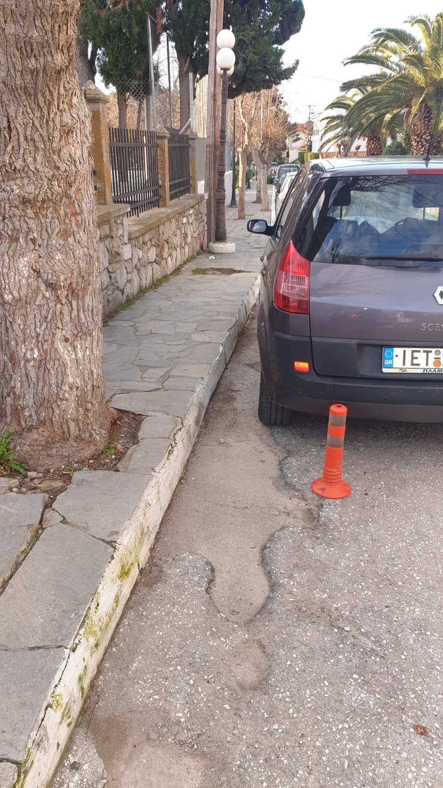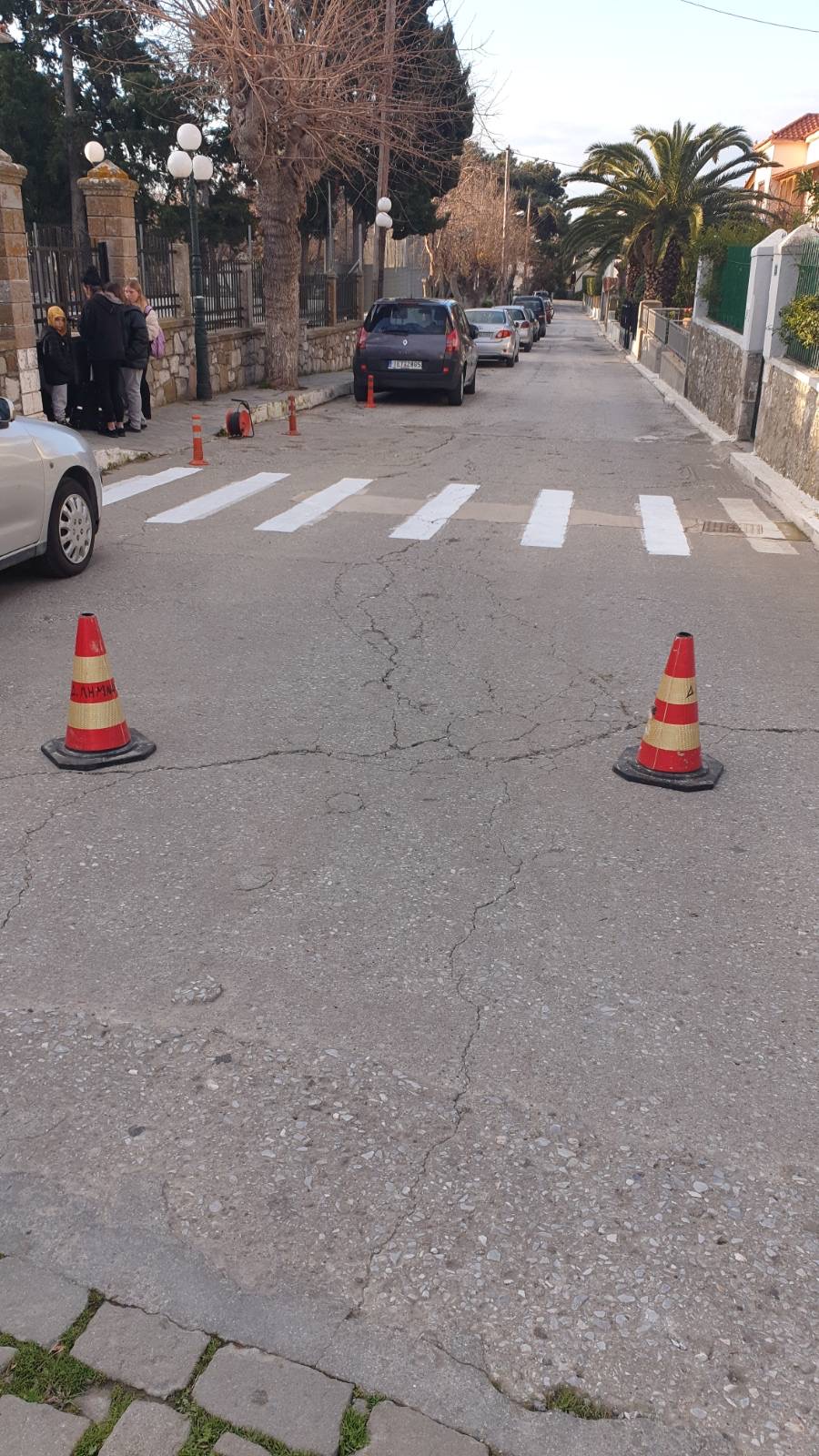 Στο σημείο τοποθετούνται κολωνάκια, ώστε να αποφεύγεται το παρκάρισμα και να μην αναγκάζονται τα παιδιά, να περπατούν στο οδόστρωμα.