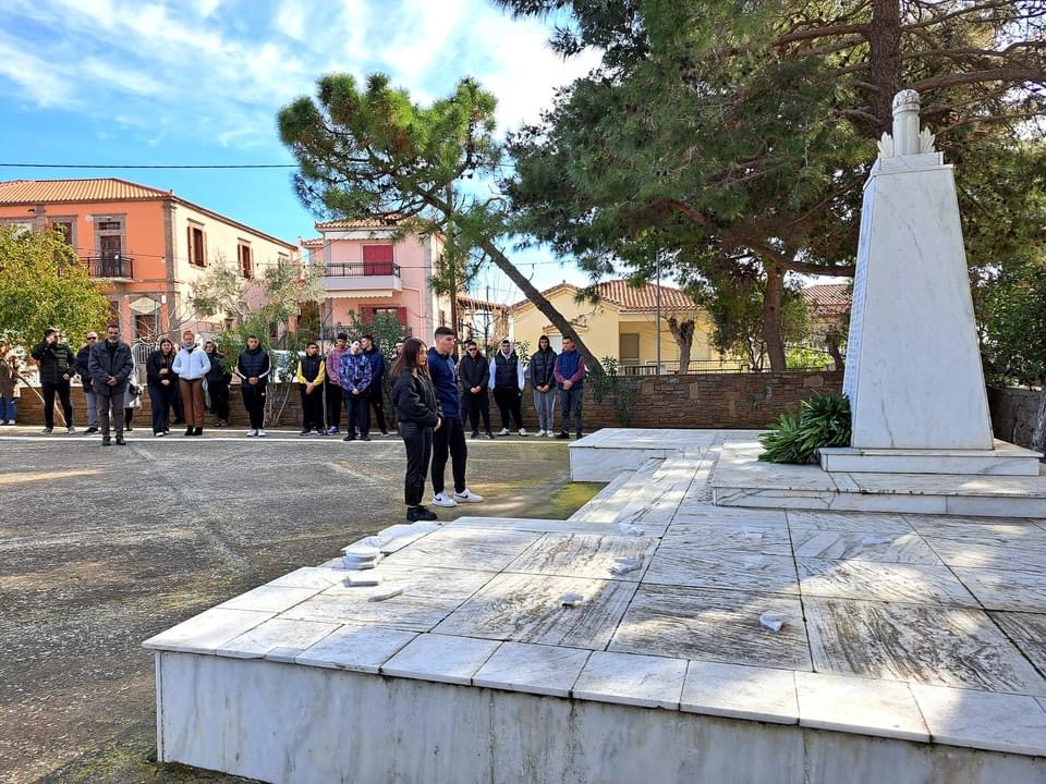 Μετά το τέλος της παράστασης, οι μαθητές κατέθεσαν στεφάνι στο μνημείο των Ηρώων του Μούδρου.