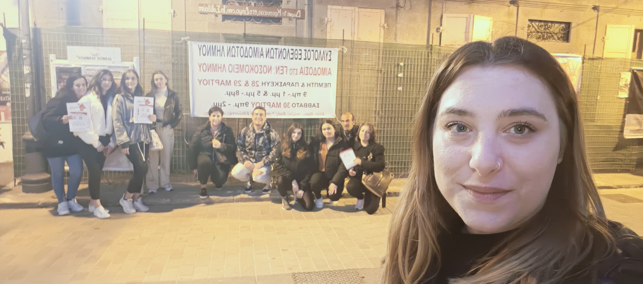 Οι σπουδαστές του Τμήματος Βοηθός Νοσηλευτικής Γενικής Νοσηλείας Δ εξαμήνου της Σχολής Ανώτερης Επαγγελματικής Κατάρτισης Λήμνου, την Τετάρτη 27 Μαρτίου το απόγευμα, πραγματοποίησαν μια επιτυχημένη εκστρατεία στην αγορά της Μύρινας, με σκοπό την ενημέρωση και ευαισθητοποίηση του κοινού σχετικά με το θέμα της αιμοδοσίας.