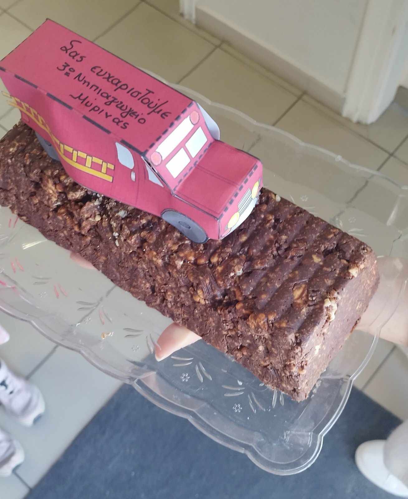 Τέλος μαθητές και εκπαιδευτικοί ευχαρίστησαν τους Πυροσβέστες και τους προσέφεραν ατομικά γλυκά κι έναν μοναδικό κορμό ειδικά για εκείνους!