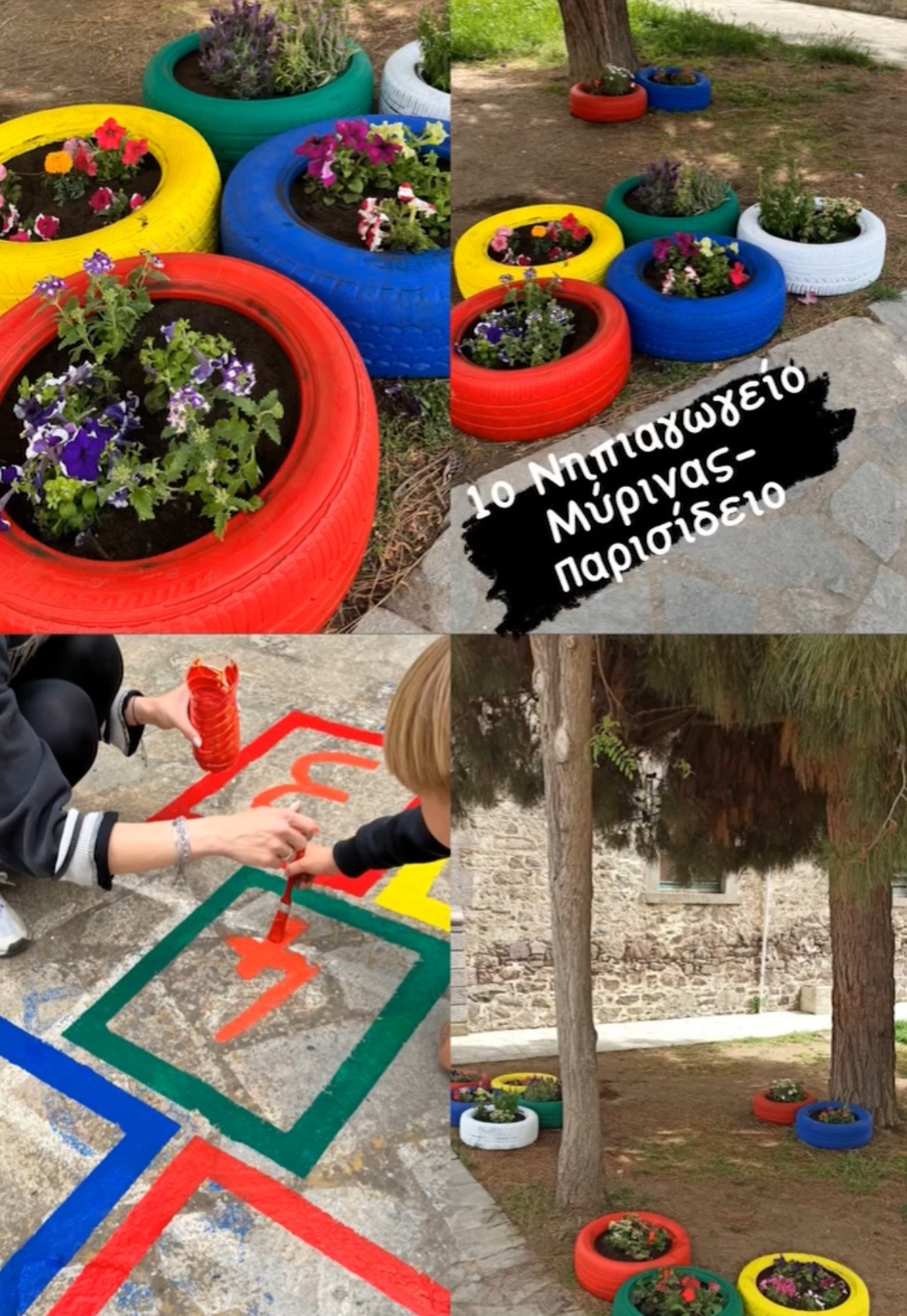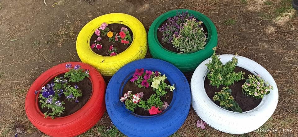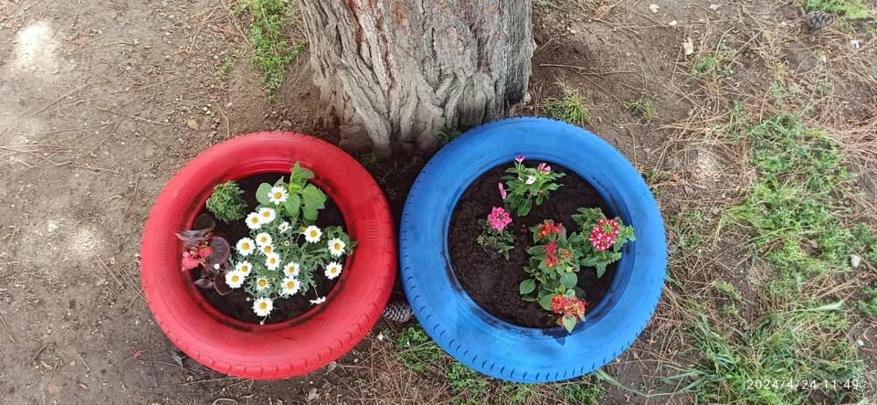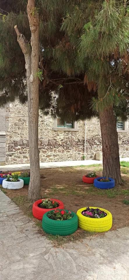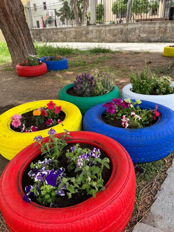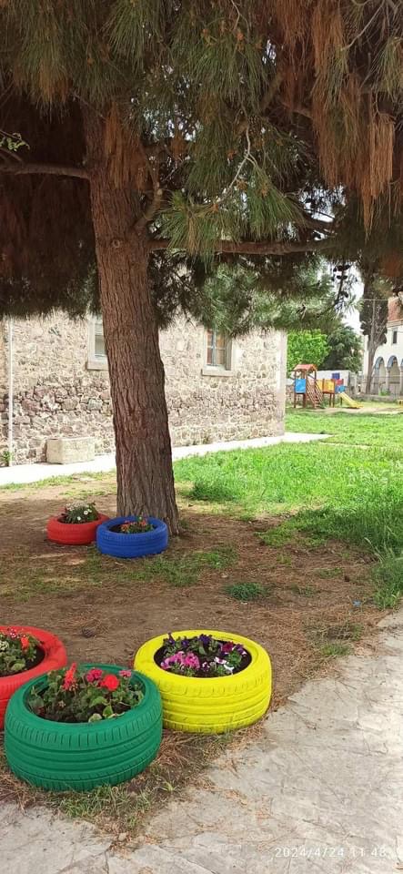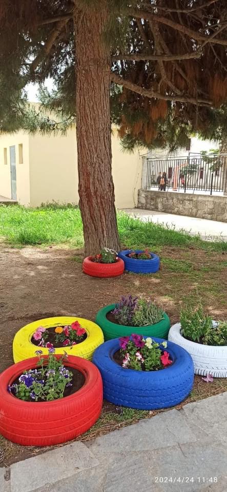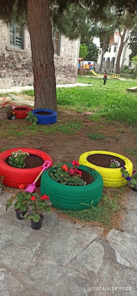 Από την μια τα χρώματα των λουλουδιών, από την άλλη η ευφάνταστη μεταμόρφωση λαστιχένιες αυτοκινήτων το προαύλιο του νηπιαγωγείου γέμισε χρώμα.