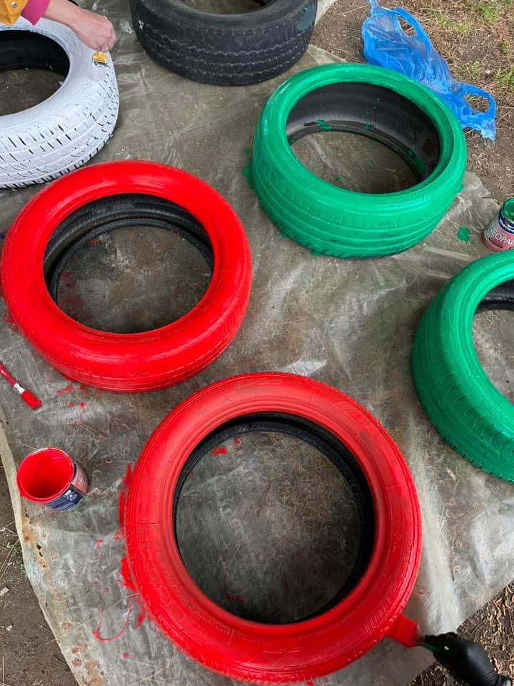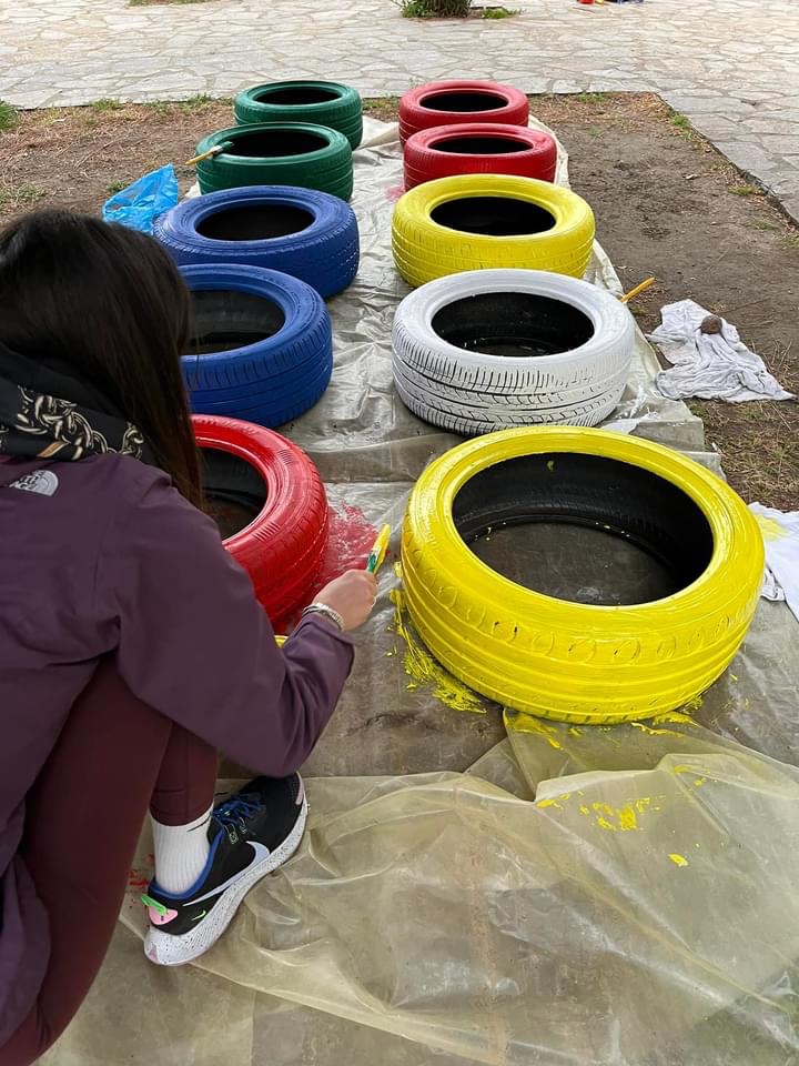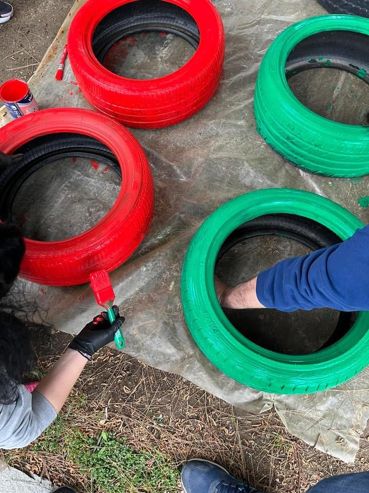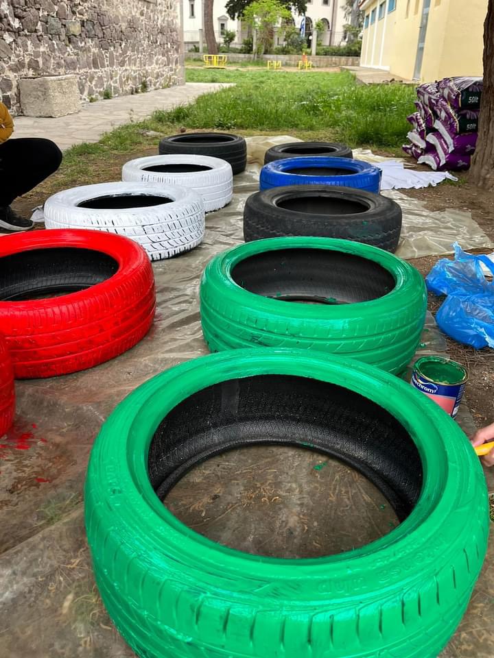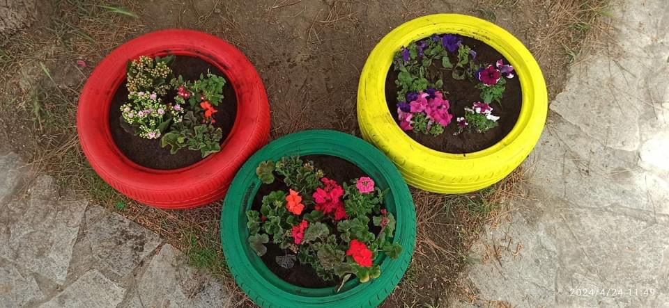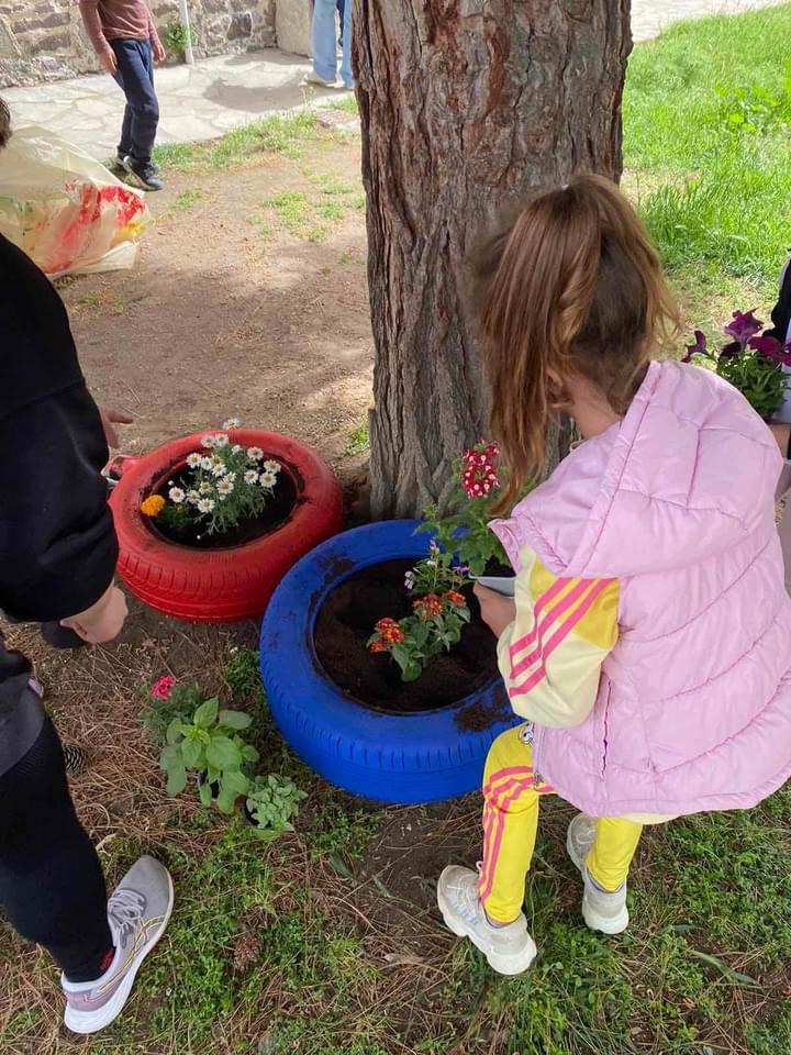 Από την μια τα χρώματα των λουλουδιών, από την άλλη η ευφάνταστη μεταμόρφωση λαστιχένιες αυτοκινήτων το προαύλιο του νηπιαγωγείου γέμισε χρώμα.