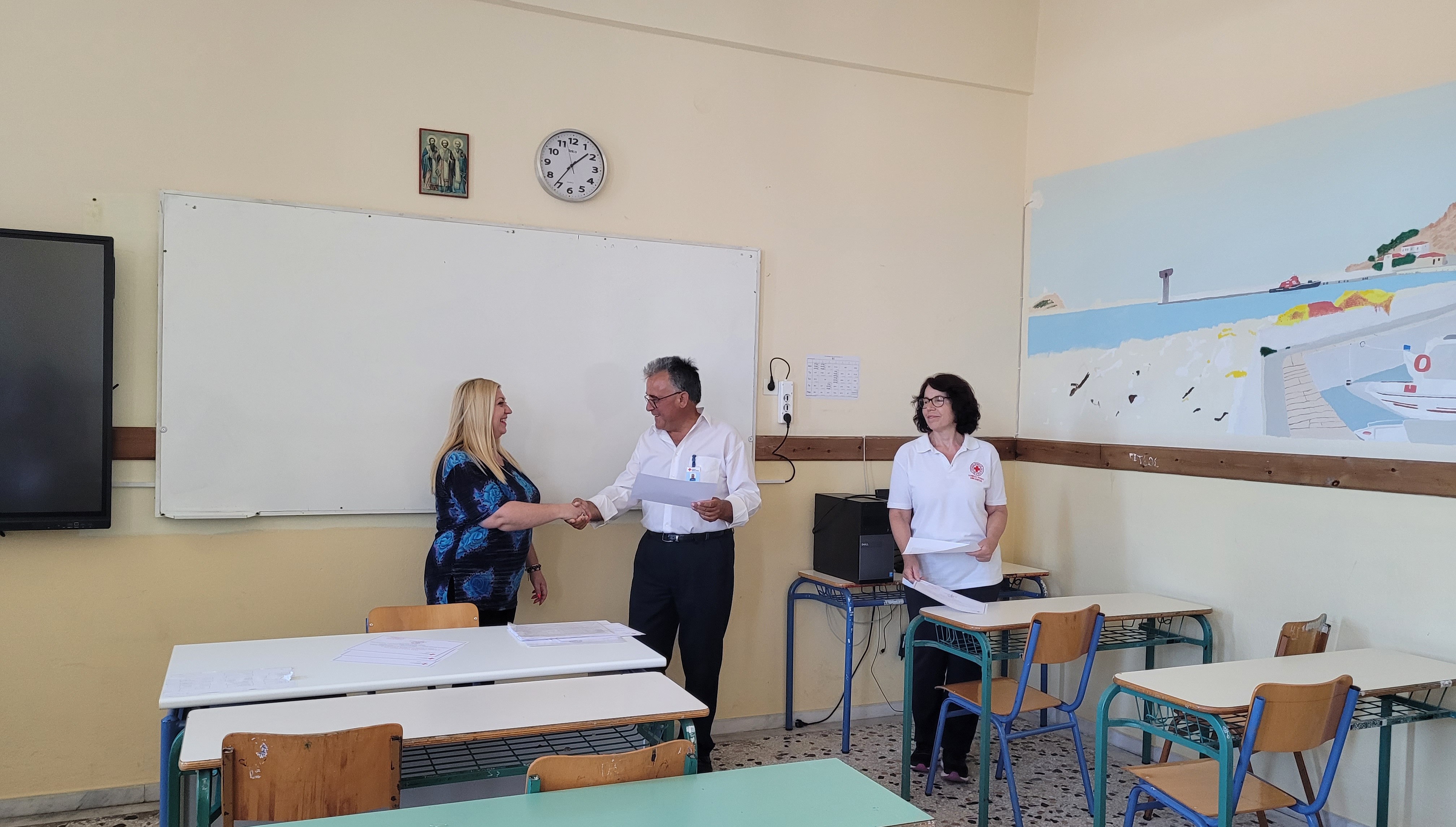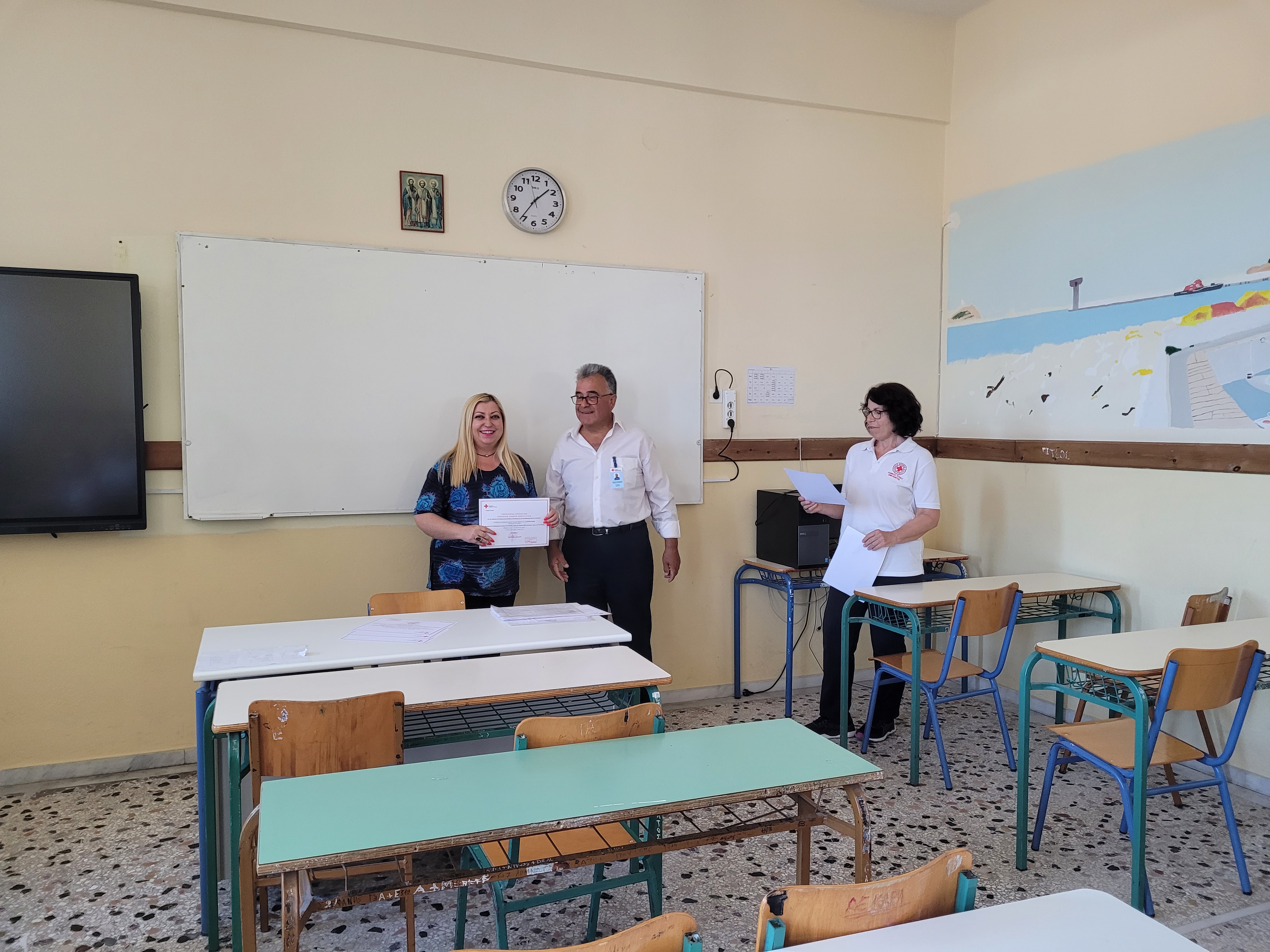 Στη συνέχεια, η κα Λυγδά, επαίνεσε τους εκπαιδευόμενους για την επιτυχή εκπαίδευσή τους στο πρόγραμμα και την εθελοντική τους διάθεση για προσφορά. Εξέφρασε την ευγνωμοσύνη της προς τον Ερυθρό Σταυρό για τη συνεργασία και την υποστήριξη και τόνισε την αναγκαιότητα συνέχισης τέτοιων εκπαιδευτικών προγραμμάτων που ενισχύουν την ετοιμότητα και την ικανότητα αντιμετώπισης επειγόντων περιστατικών.
