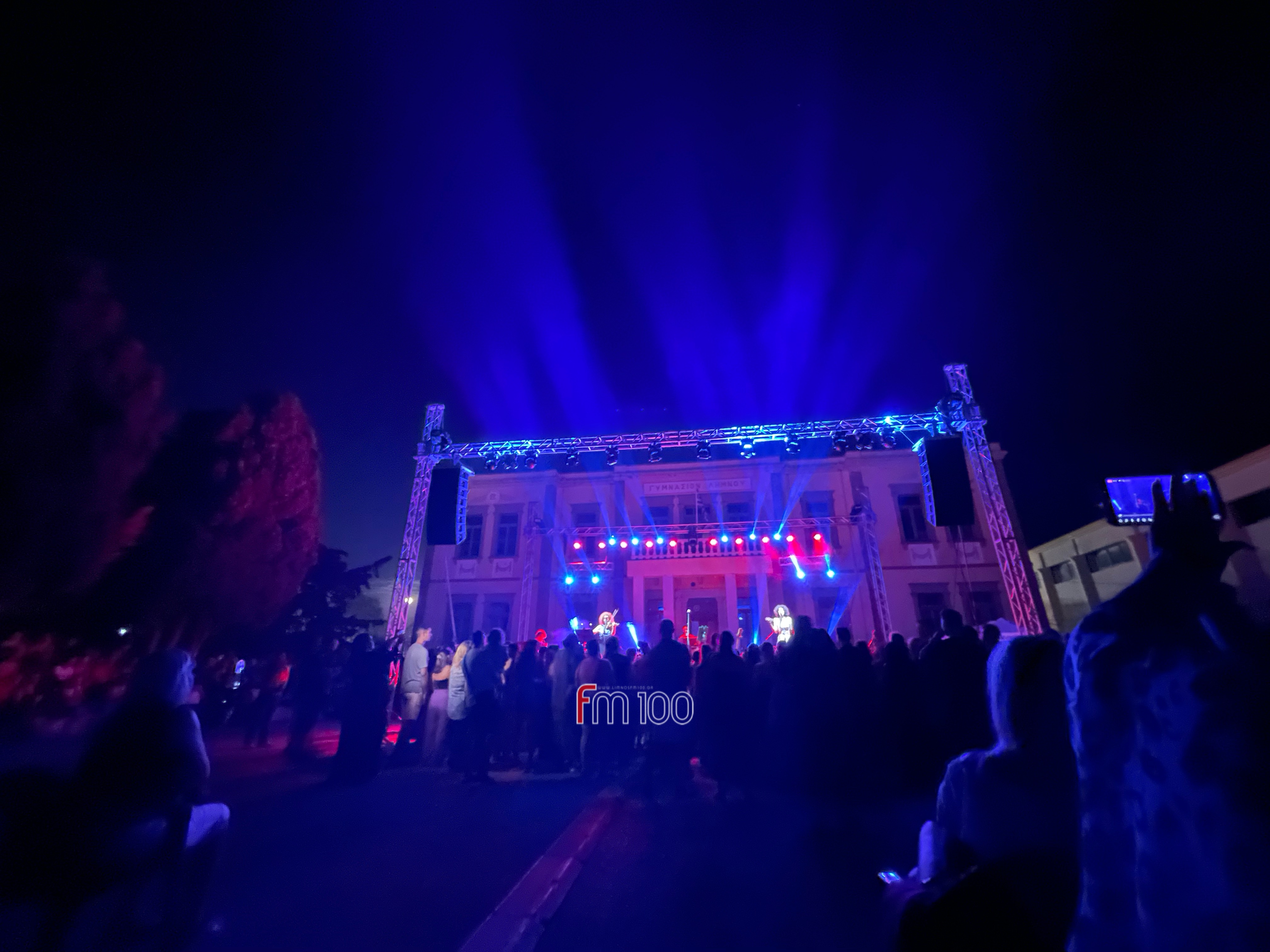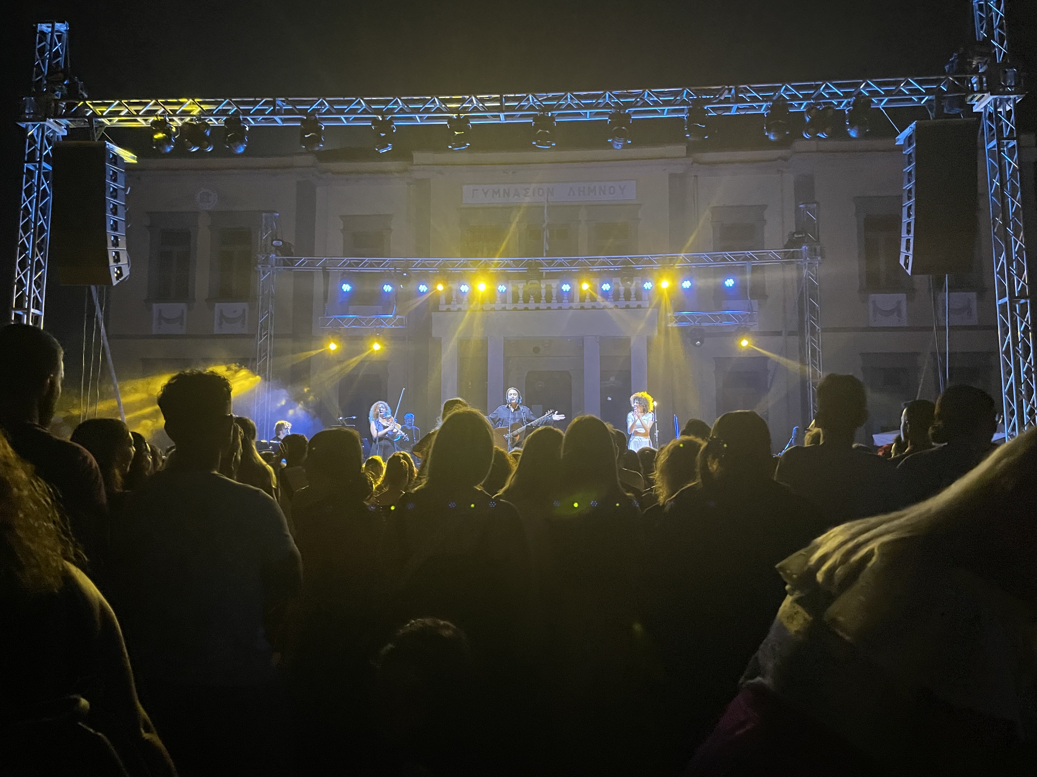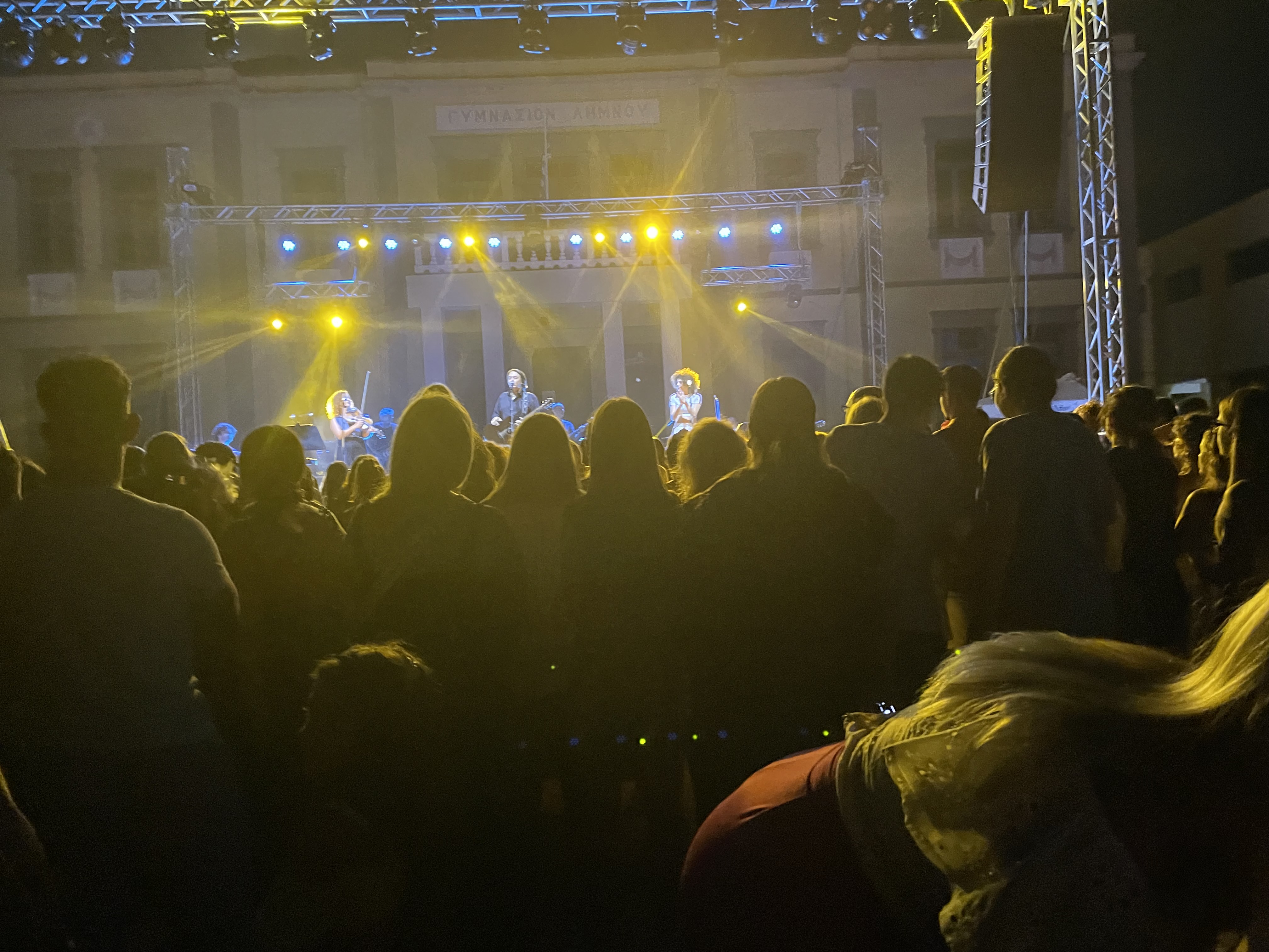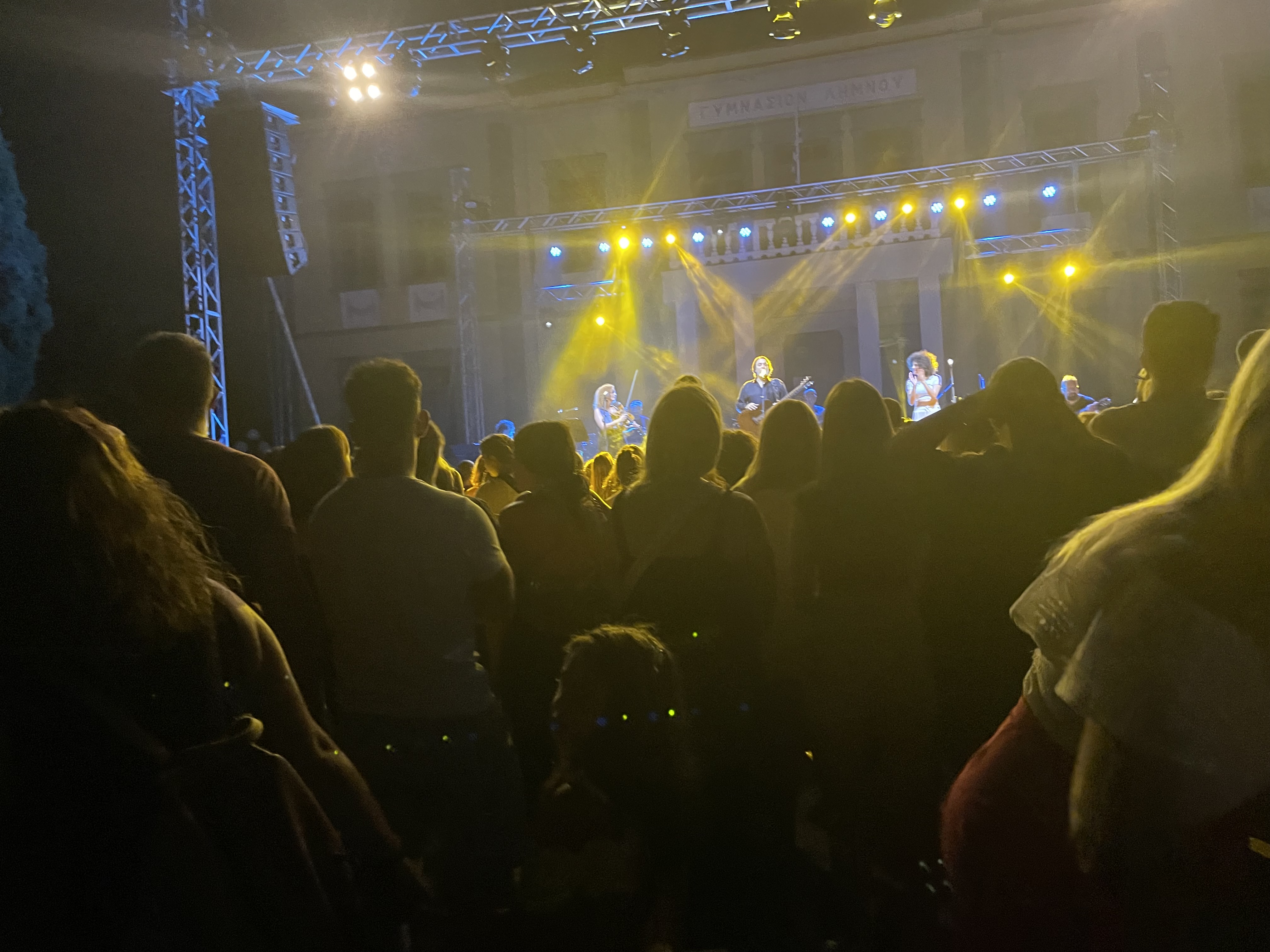 Το γκαζόν απέναντι από την είσοδο του Γυμνασίου φιλοξένησε παρέες με τραπεζάκια, καρεκλίτσες, κρασί, εδέσματα! Όμορφο και το έξω σκηνικό, συμπλήρωνε το μέσα. Τώρα που είπα εδέσματα. Από την αρχή της συναυλίας μας "έσπαγαν τη μύτη" αδιαλείπτως και χωρίς οίκτο τα καλούδια που ετοίμαζε η Δήμητρα στην καντίνα.