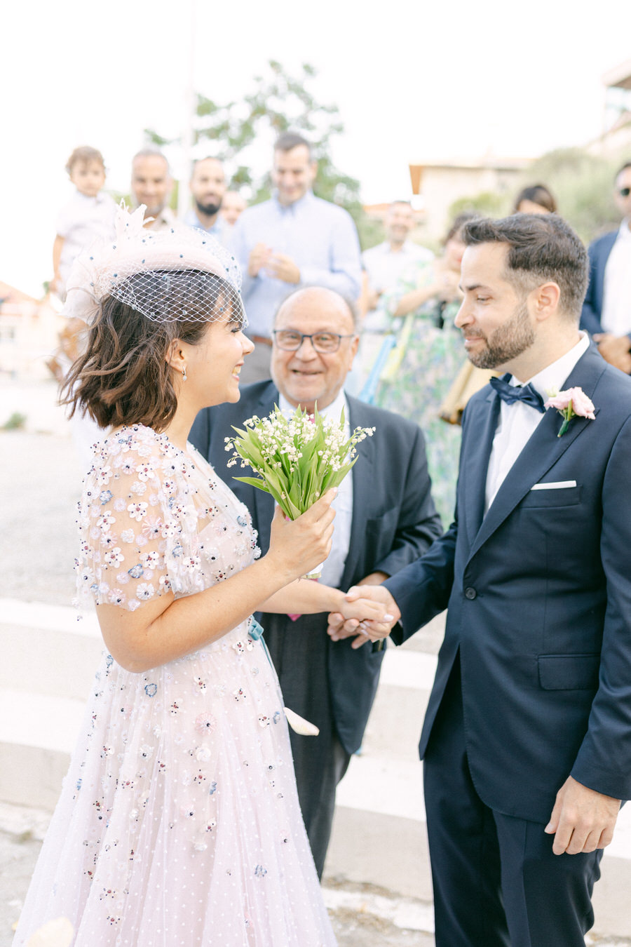 Η τελετή στην Αγία Παρασκευή Βόντελα, στη Μύρινα, ήταν μαγική. Η αγάπη στον αέρα ήταν αισθητή καθώς το ζευγάρι στεκόταν μπροστά στους πιο στενούς φίλους και την οικογένειά του. Η Θάλεια έλαμπε μέσα στο μεγαλοπρεπές δαντελένιο φλοράλ νυφικό της, με το χαμόγελό της να αντανακλά τη χαρά της στιγμής. Στεκόμενος ψηλά και περήφανος, ο Γιάννης δεν μπορούσε να πάρει τα μάτια του από τη νύφη του.