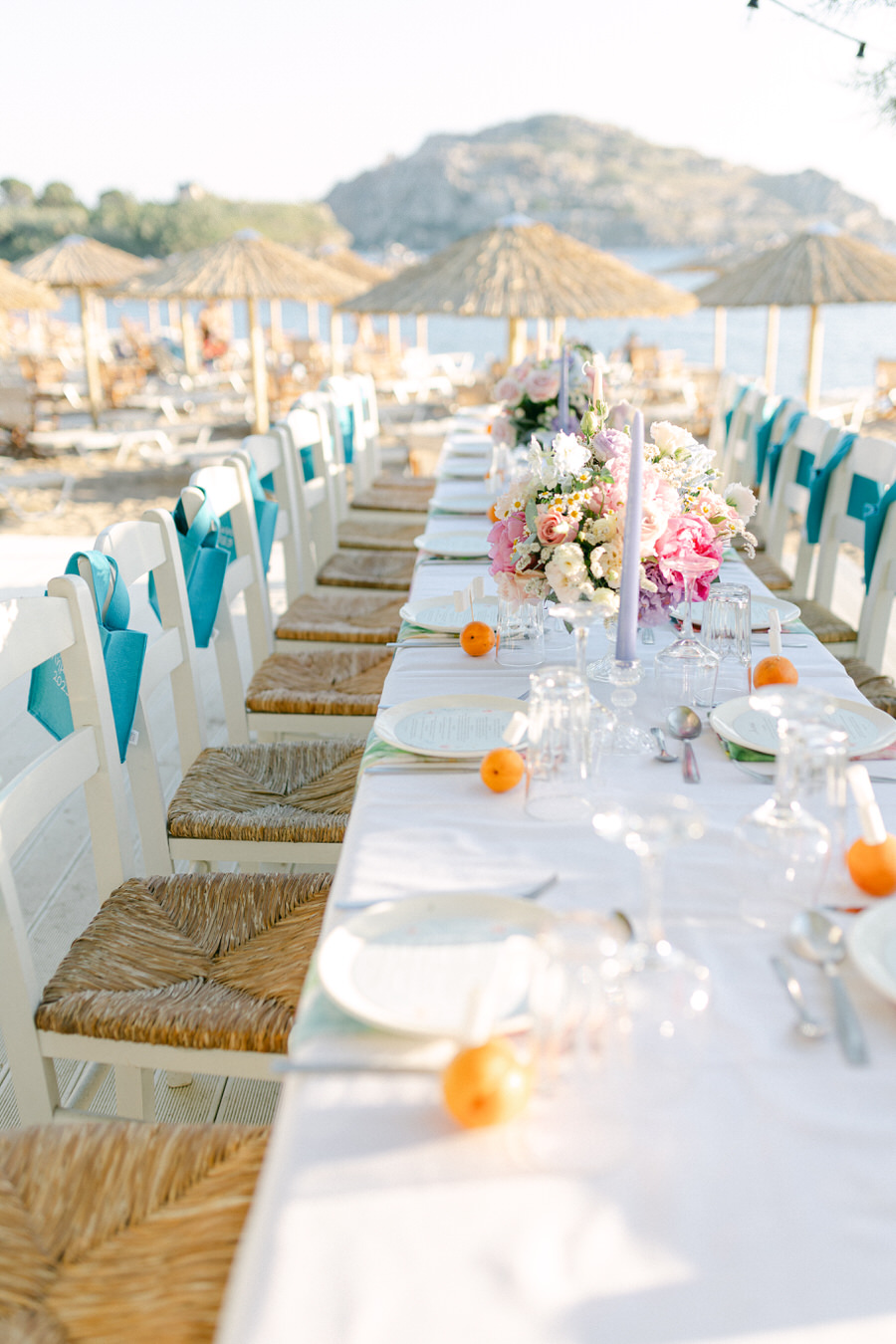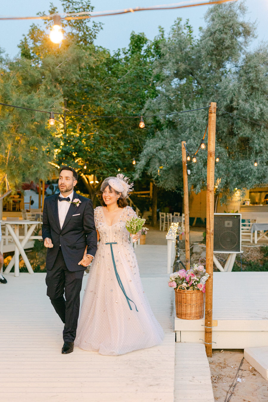 Η δεξίωση έγινε σε έναν γοητευτικό παραθαλάσσιο χώρο, το Manos Beach Bar, στο Richa Nera. Οι καλεσμένοι δείπνησαν κάτω από τα αστέρια, με τον απαλό ήχο των κυμάτων να αποτελεί το τέλειο soundtrack της βραδιάς. Τα τραπέζια ήταν στολισμένα με απλά αλλά όμορφα κεντρικά κομμάτια από τοπικά λουλούδια, προσθέτοντας μια μυρωδάτη νότα στον αέρα. Το μενού περιελάμβανε τις καλύτερες γαστρονομικές προτάσεις της Λήμνου, από φρέσκα θαλασσινά μέχρι τοπικά κρασιά.