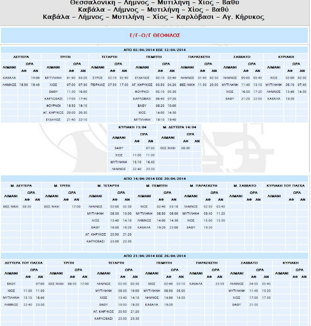 1. Το Ε/Γ-Ο/Γ ΘΕΟΦΙΛΟΣ θα αναχωρήσει αύριο Πέμπτη 03/04 από Πειραιά στις 17:00 εκτελώντας το δρομολόγιο της Τετάρτης 02/04 προς Εύδηλο - Άγιο Κήρυκο - Φούρνους - Καρλόβασι - Βαθύ - Χίο - Μυτιλήνη - Λήμνο - Θεσσαλονίκη και έπειτα για τα υπόλοιπα δρομολόγια ως εξής: