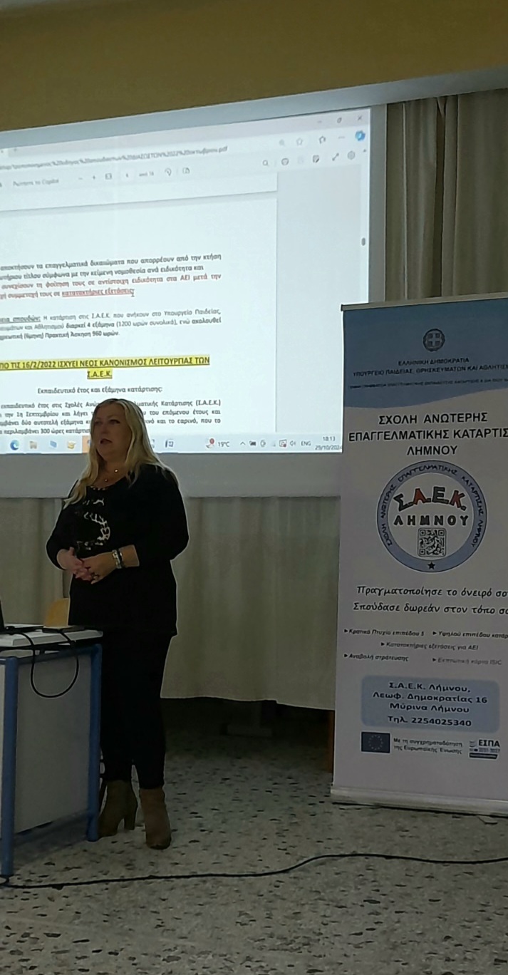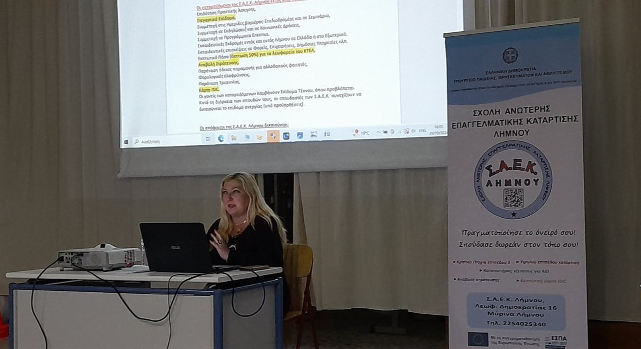 Η Ομάδα της ΣΑΕΚ ΛΗΜΝΟΥ (διοικητικό και εκπαιδευτικό προσωπικό) δεσμεύτηκε ότι θα είναι κοντά τους, με στόχο πάντα την αναβάθμιση της κατάρτισης, την υψηλού επιπέδου εκπαίδευση, την προσέγγιση σε ανθρώπινο επίπεδο και τη διασύνδεσή τους με την αγορά εργασίας και την τοπική κοινωνία!»