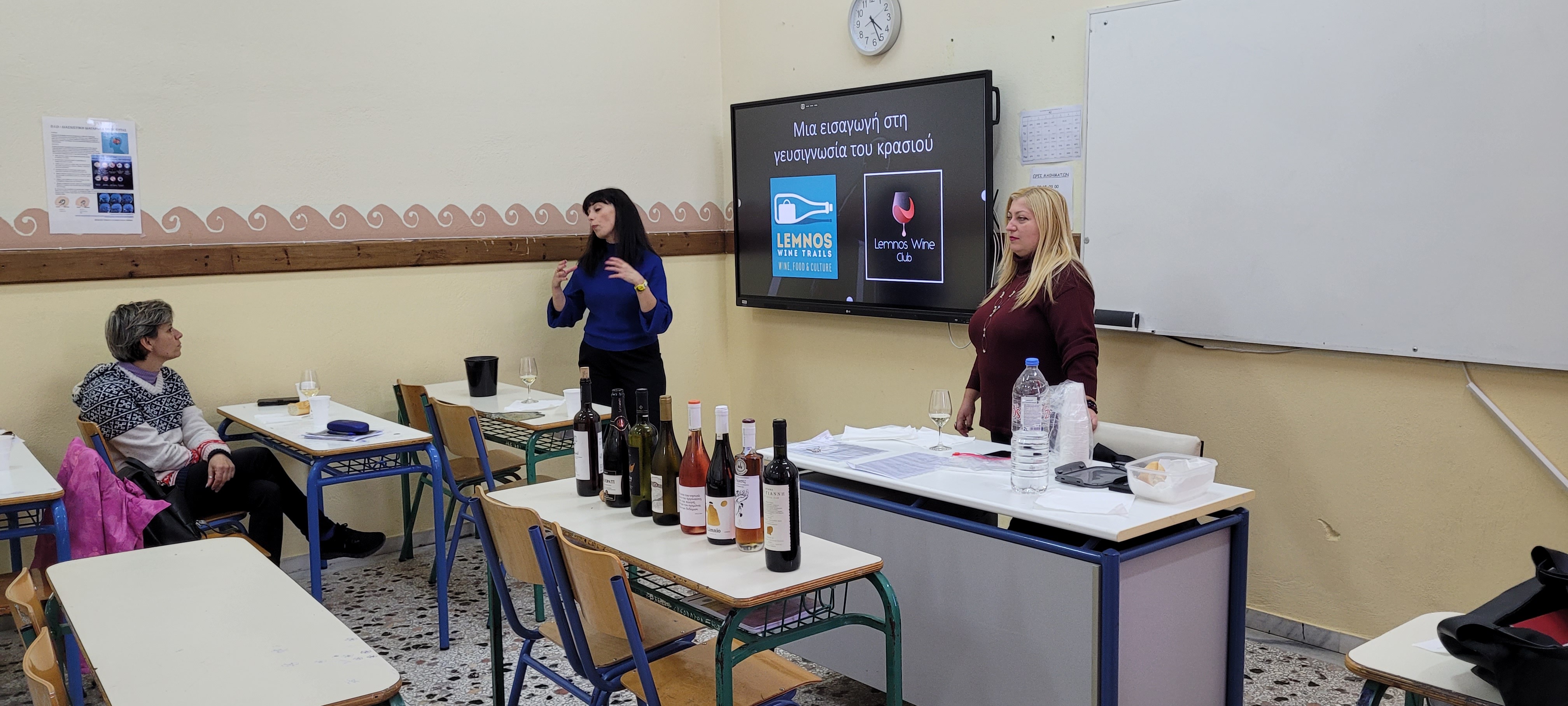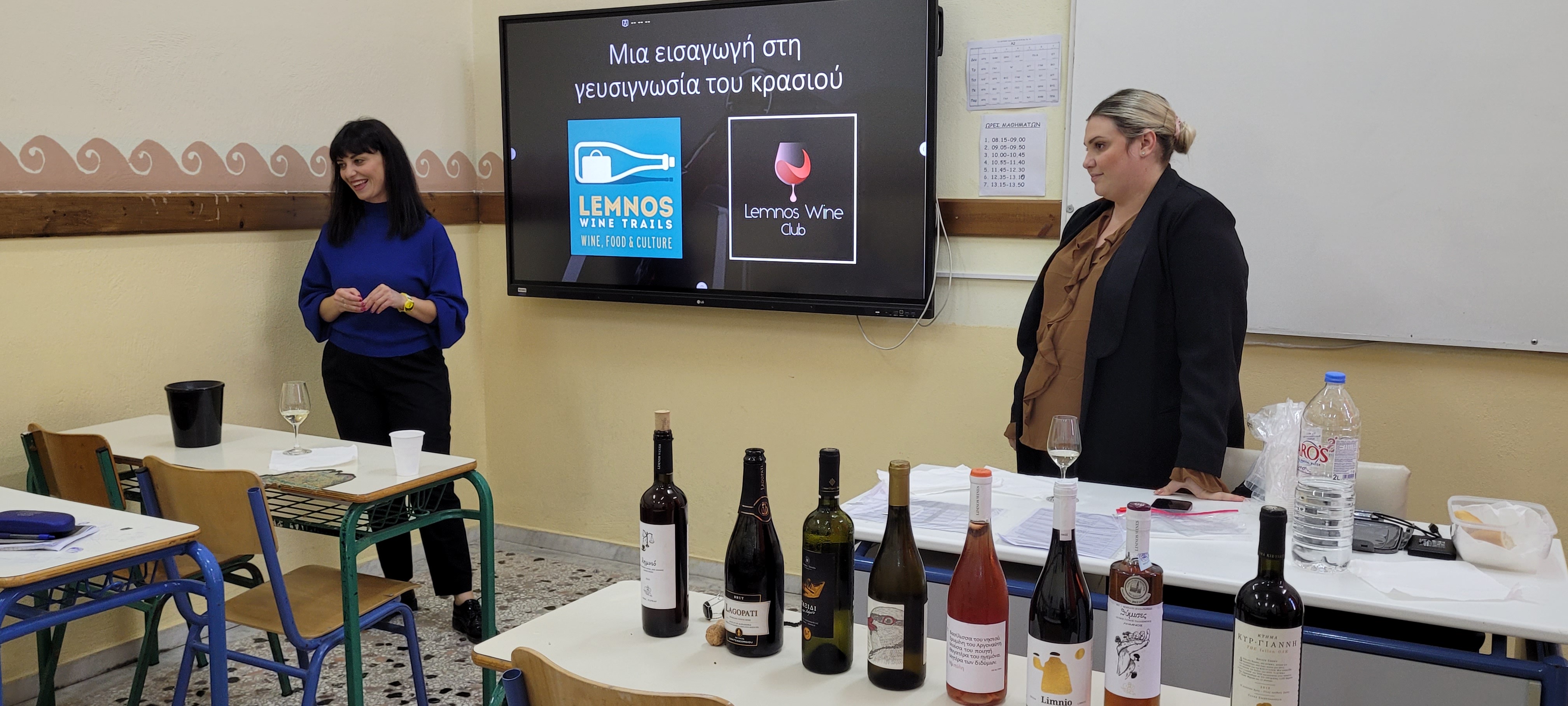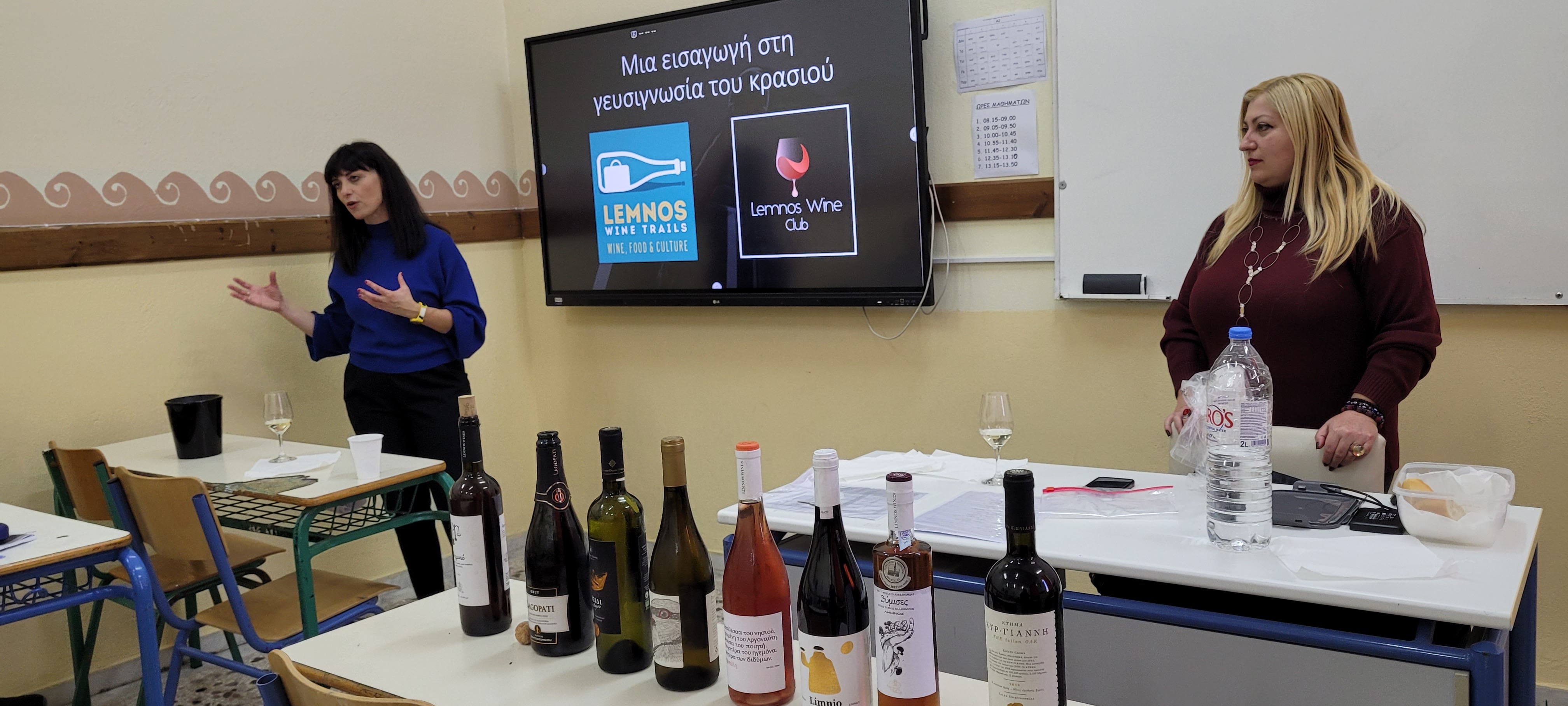 Η κα Κωνσταντάρα, εκ μέρους του Limnos Wine Trails και Limnos Wine Club, έφτιαξε μια λίστα Λημνιών οίνων, διαφορετικών τύπων, τους οποίους παρουσίασε και στη συνέχεια δοκίμασε μαζί με τους σπουδαστές, την εκπαιδεύτρια και την Διευθύντρια της Σχολής. Επεξήγησε ποιες γνώσεις οφείλει να έχει ένας αμπελουργός-οινοποιός για να δοκιμάσει και να αξιολογήσει το προϊόν του και δίδαξε στους σπουδαστές πως να πραγματοποιήσουν σωστά και τεχνικά οργανοληπτικό έλεγχο οπτικά, οσφρητικά και γευστικά.