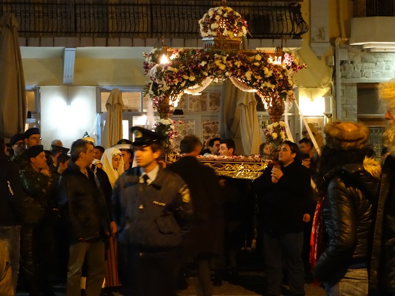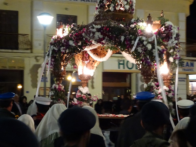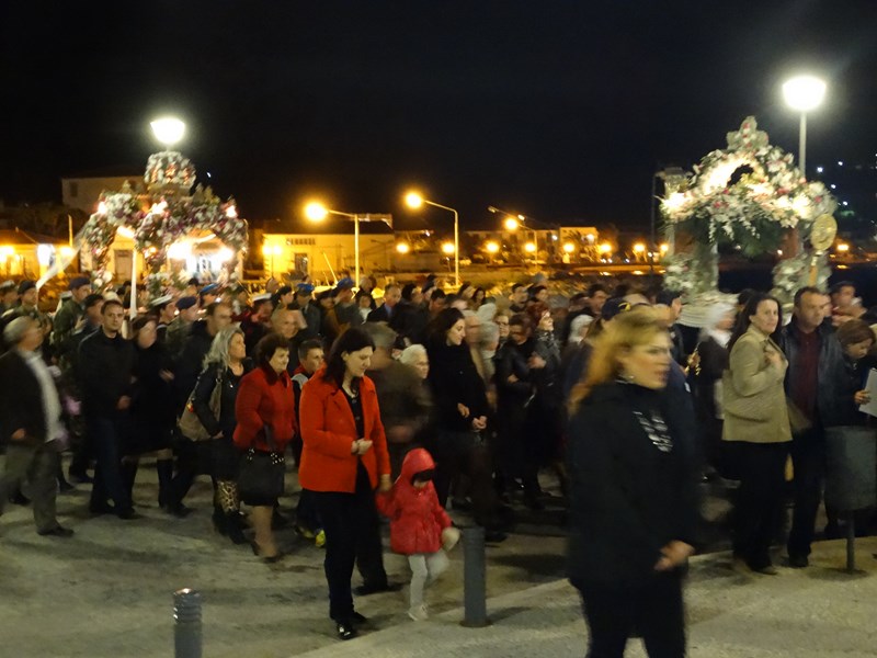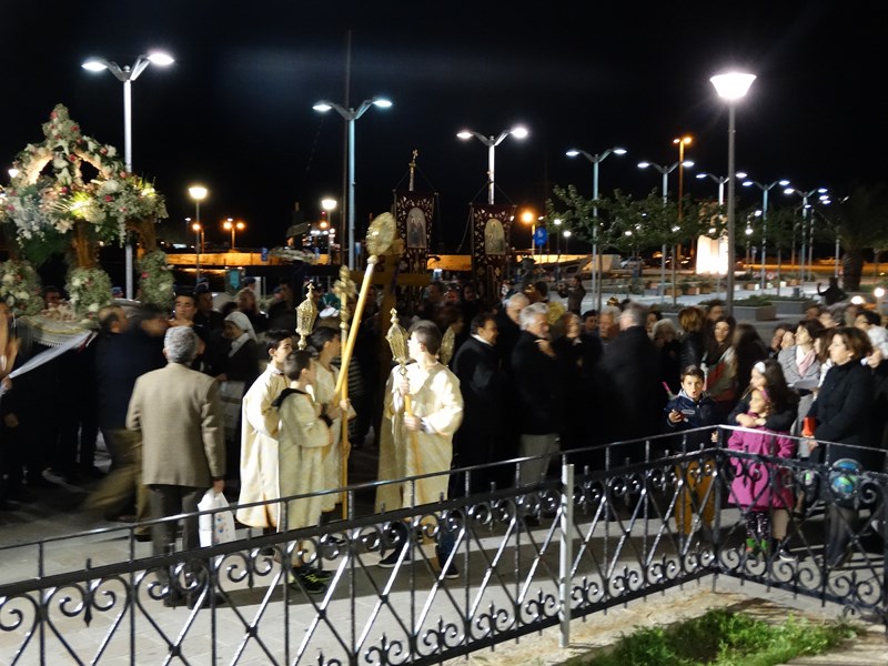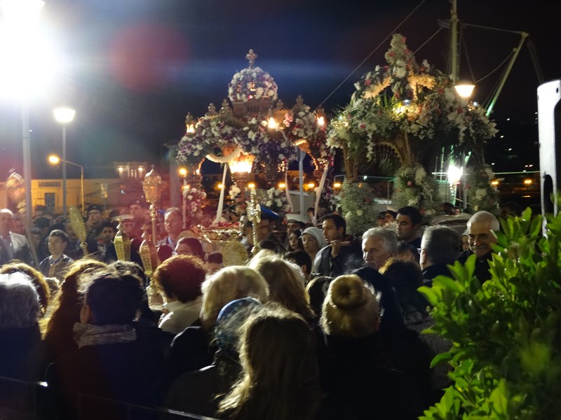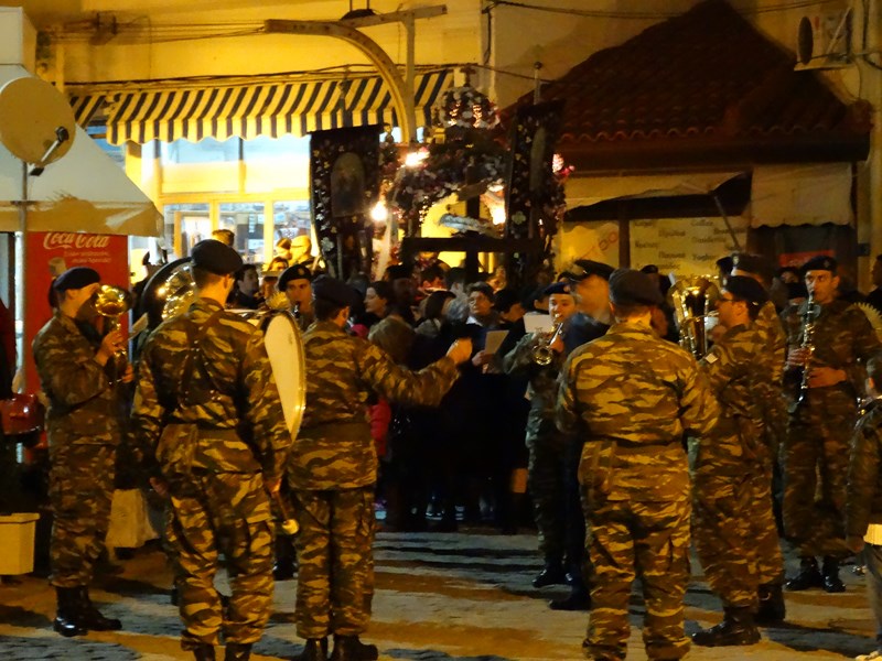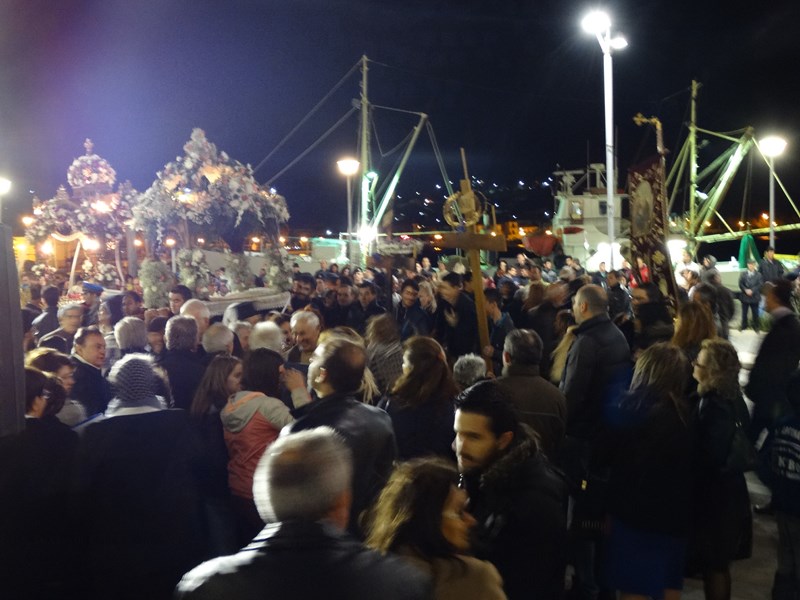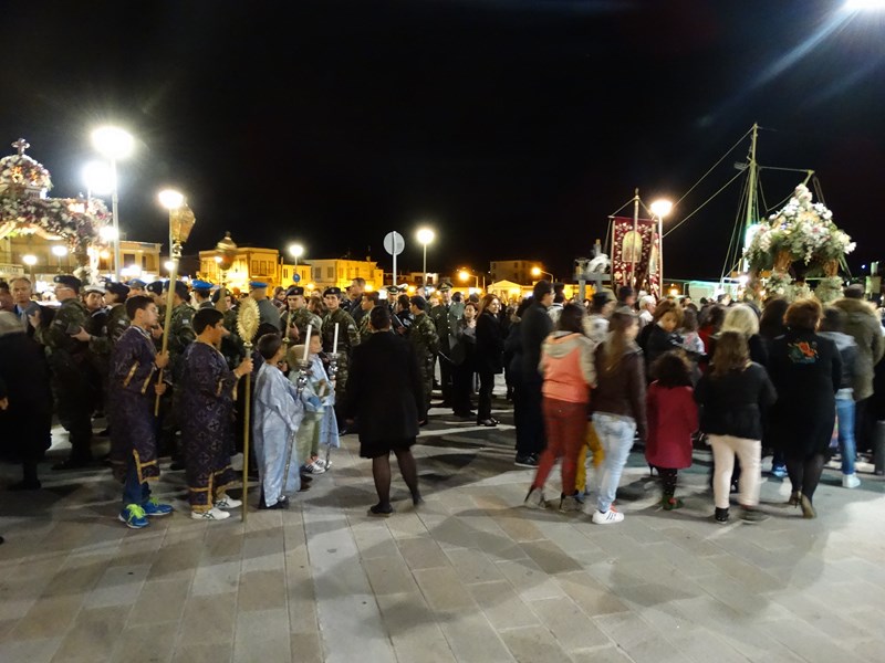 Οι επιτάφιοι της Αγίας Τριάδος και της Παναγίας του Τσας, μεγαλόπρεποι και ιδιαιτέρως φροντισμένοι, με τη συνοδεία της μπάντας του στρατού, της φιλαρμονικής και της χορωδίας του Δήμου οι οποίοι παιάνιζαν πένθιμους ήχους, συναντήθηκαν όπως θέλει το έθιμο εδώ και πολλά χρόνια, στο λιμάνι της Μύρινας.