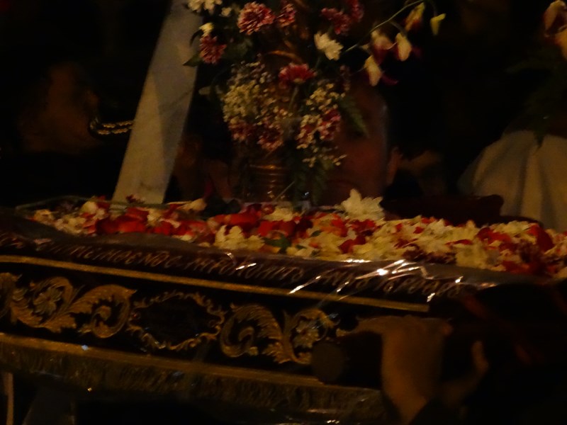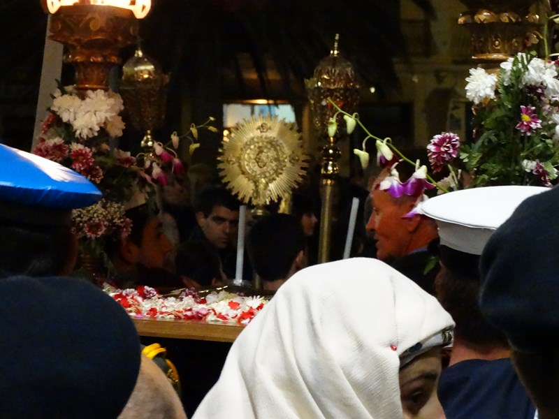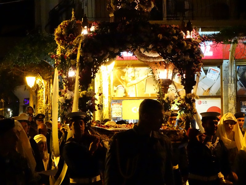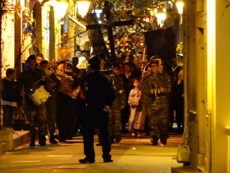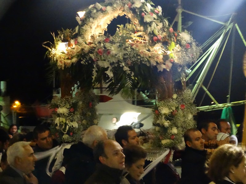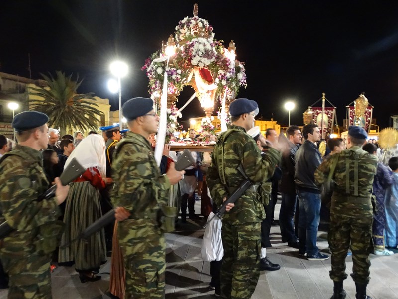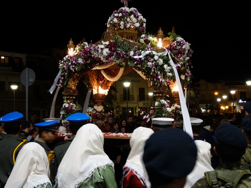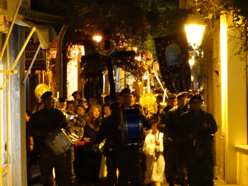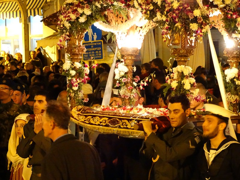 Οι επιτάφιοι της Αγίας Τριάδος και της Παναγίας του Τσας, μεγαλόπρεποι και ιδιαιτέρως φροντισμένοι, με τη συνοδεία της μπάντας του στρατού, της φιλαρμονικής και της χορωδίας του Δήμου οι οποίοι παιάνιζαν πένθιμους ήχους, συναντήθηκαν όπως θέλει το έθιμο εδώ και πολλά χρόνια, στο λιμάνι της Μύρινας.