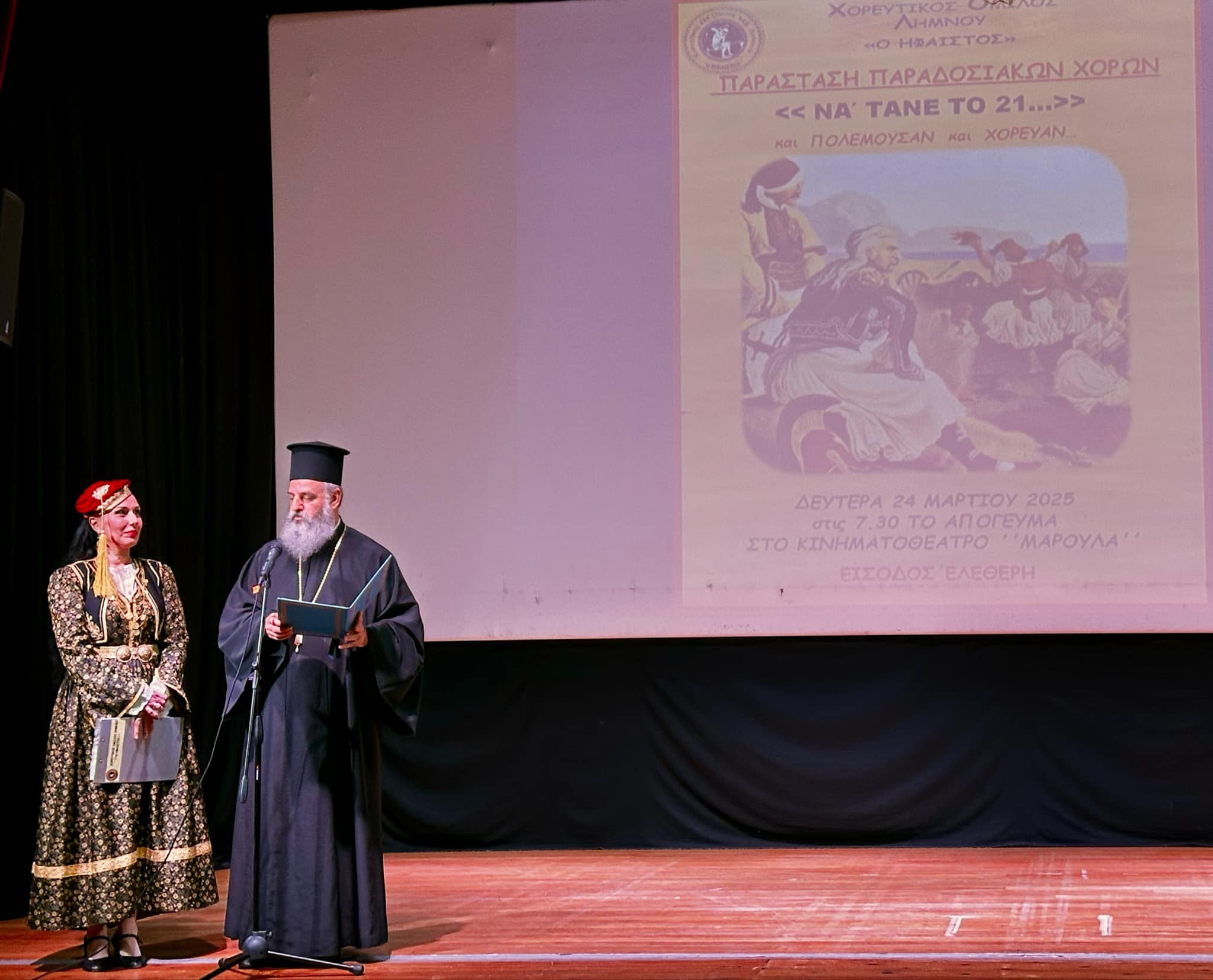 Ο Σεβασμιώτατος Μητροπολίτης Λήμνου και Αγ.Ευστρατίου κκ ΙΕΡΟΘΕΟΣ αν και αυτή τη φορά δεν ήταν κοντά μας λόγω σοβαρής υποχρέωσης, απηύθυνε έγγραφο χαιρετισμό τον οποίο διάβασε ο Αρχιμανδρίτης π.Κύριλλος Αλεξανδρόπουλος στην έναρξη της εκδήλωσης.