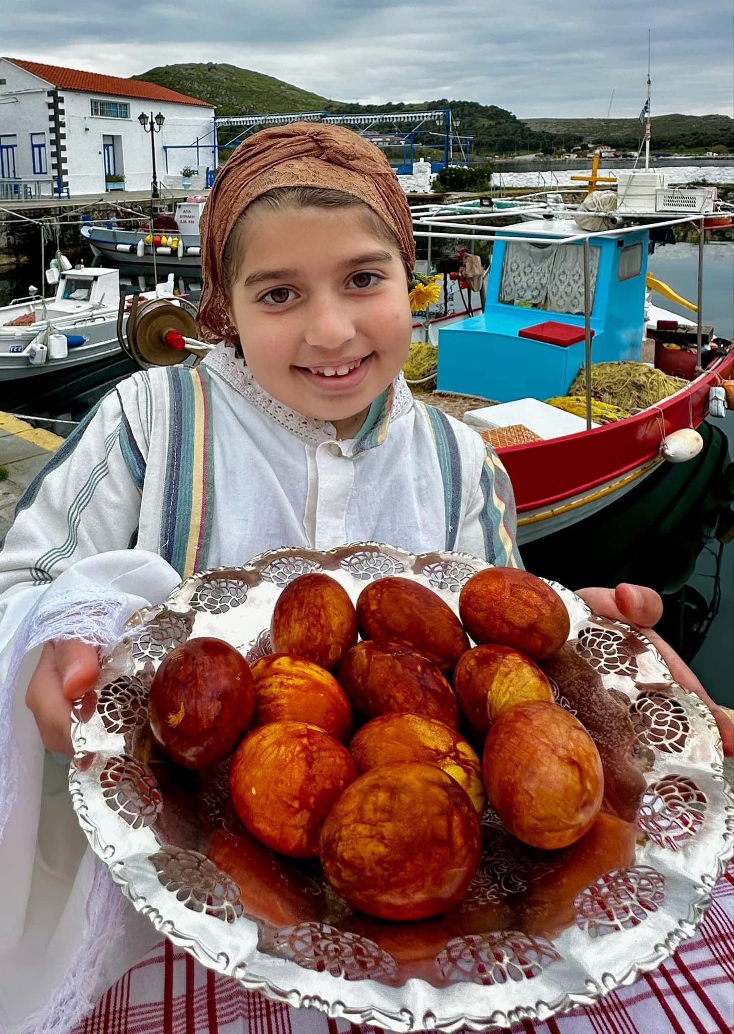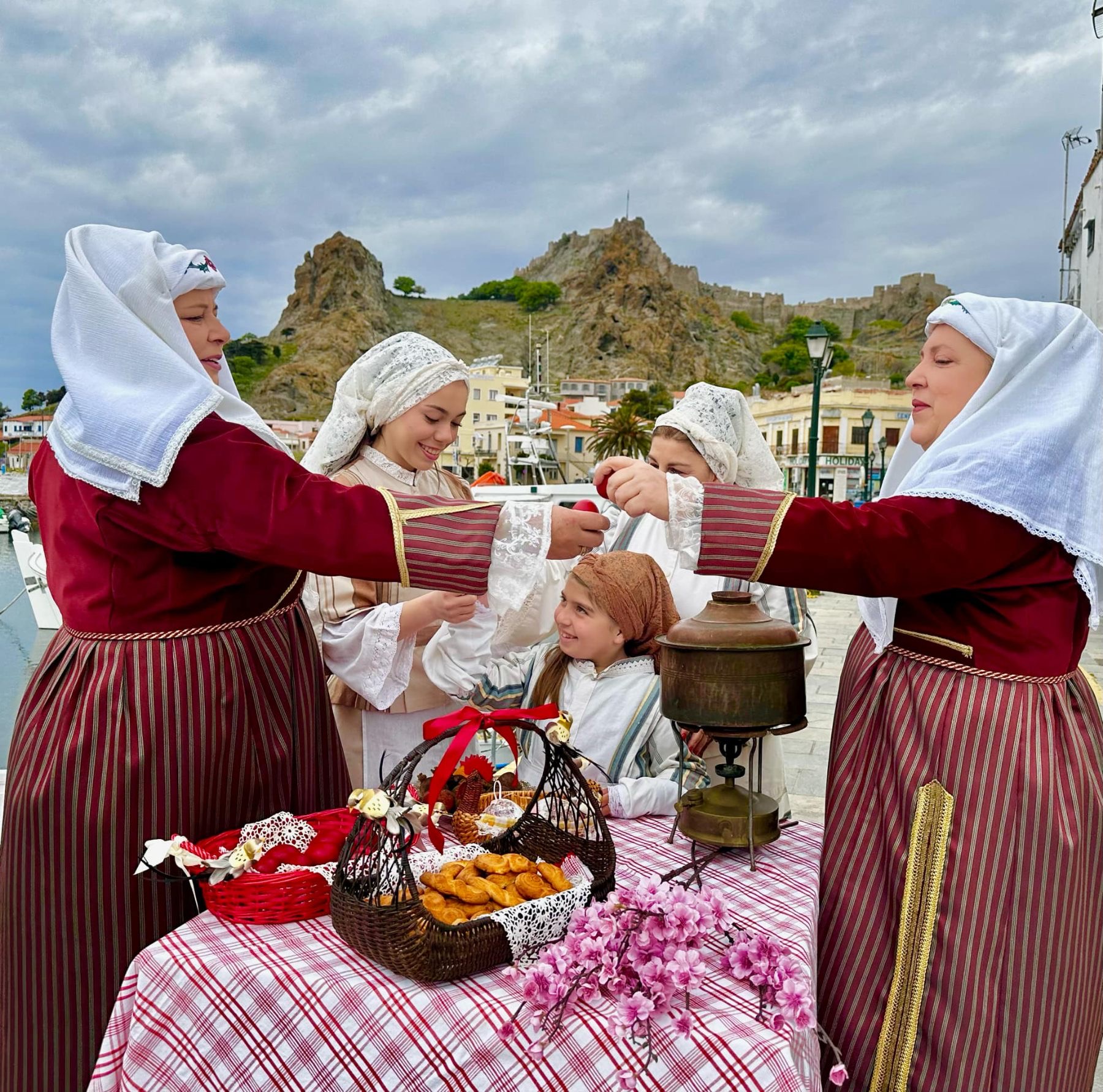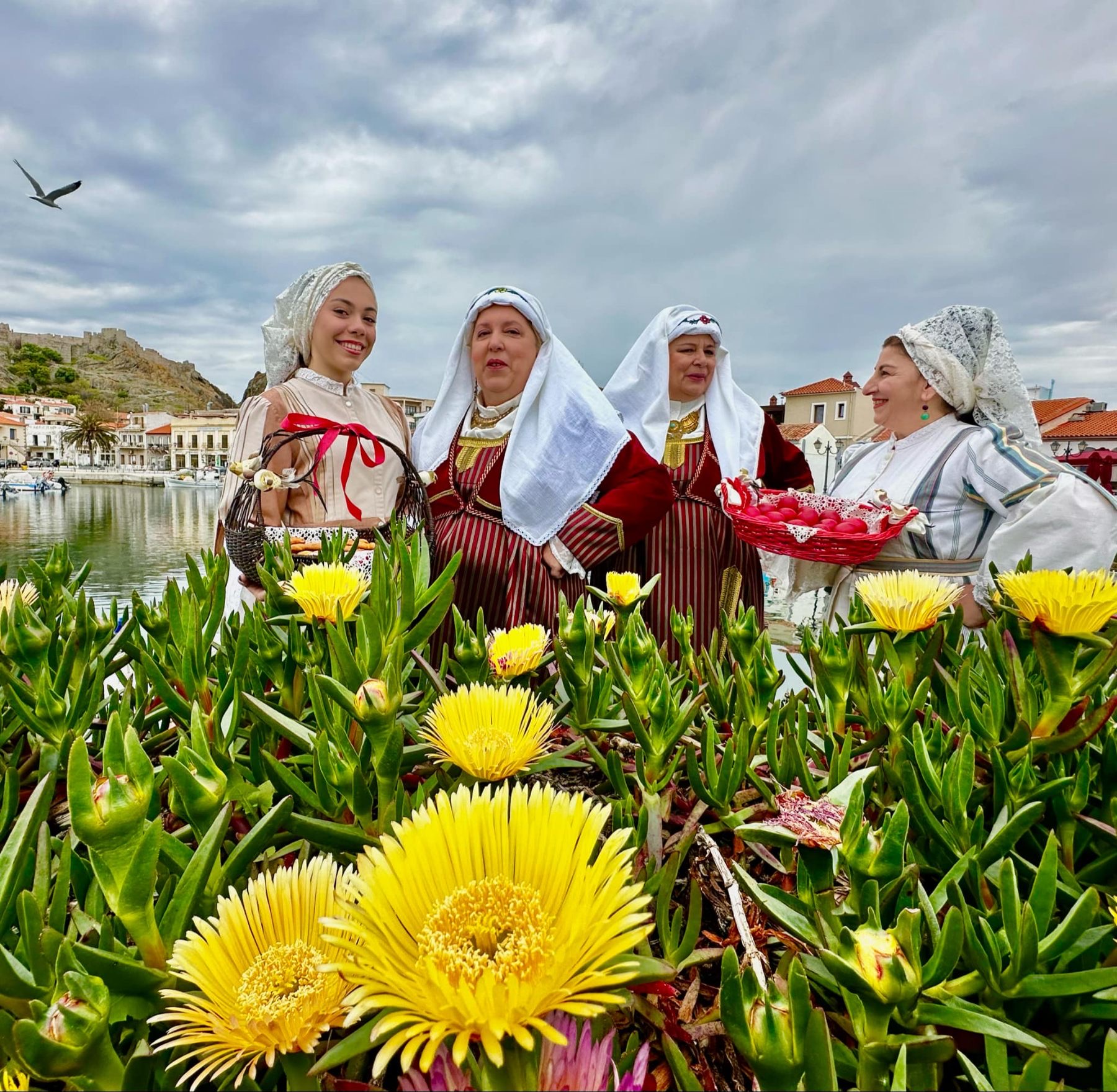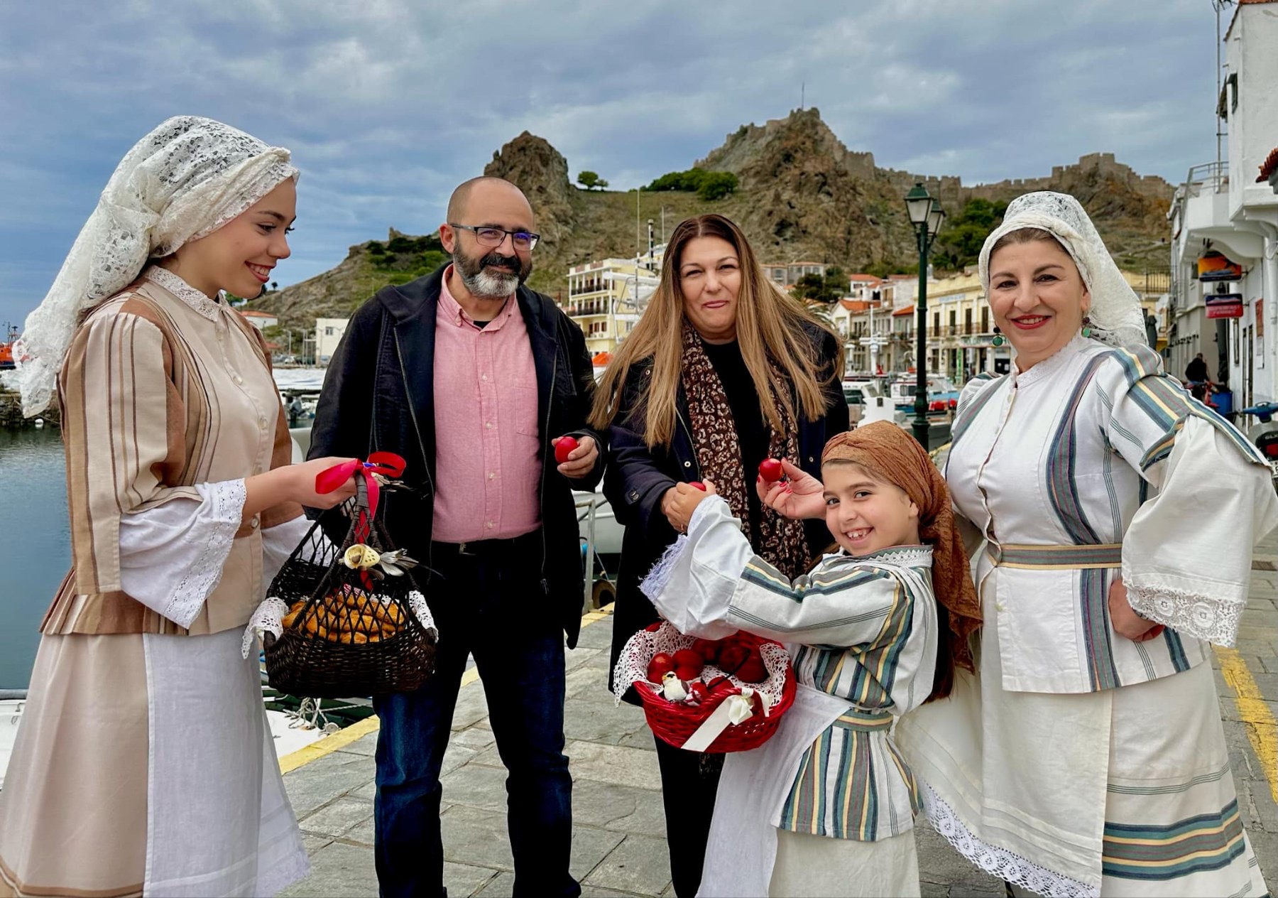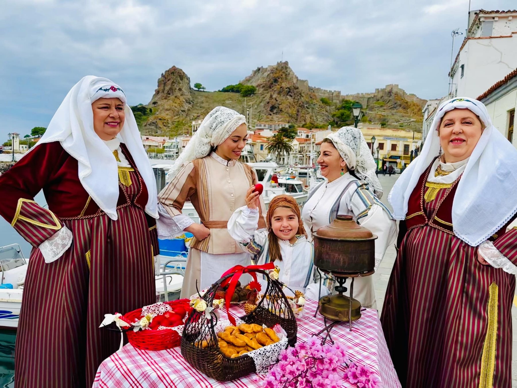Μέλη του Ομίλου ντύθηκαν με τις παραδοσιακές τους φορεσιές και φωτογραφήθηκαν στο γραφικό λιμανάκι της Μύρινας, με φόντο την πασχαλινή αύρα και τα στολισμένα καλαθάκια γεμάτα κόκκινα αυγά και χειροποίητα κουλούρια.