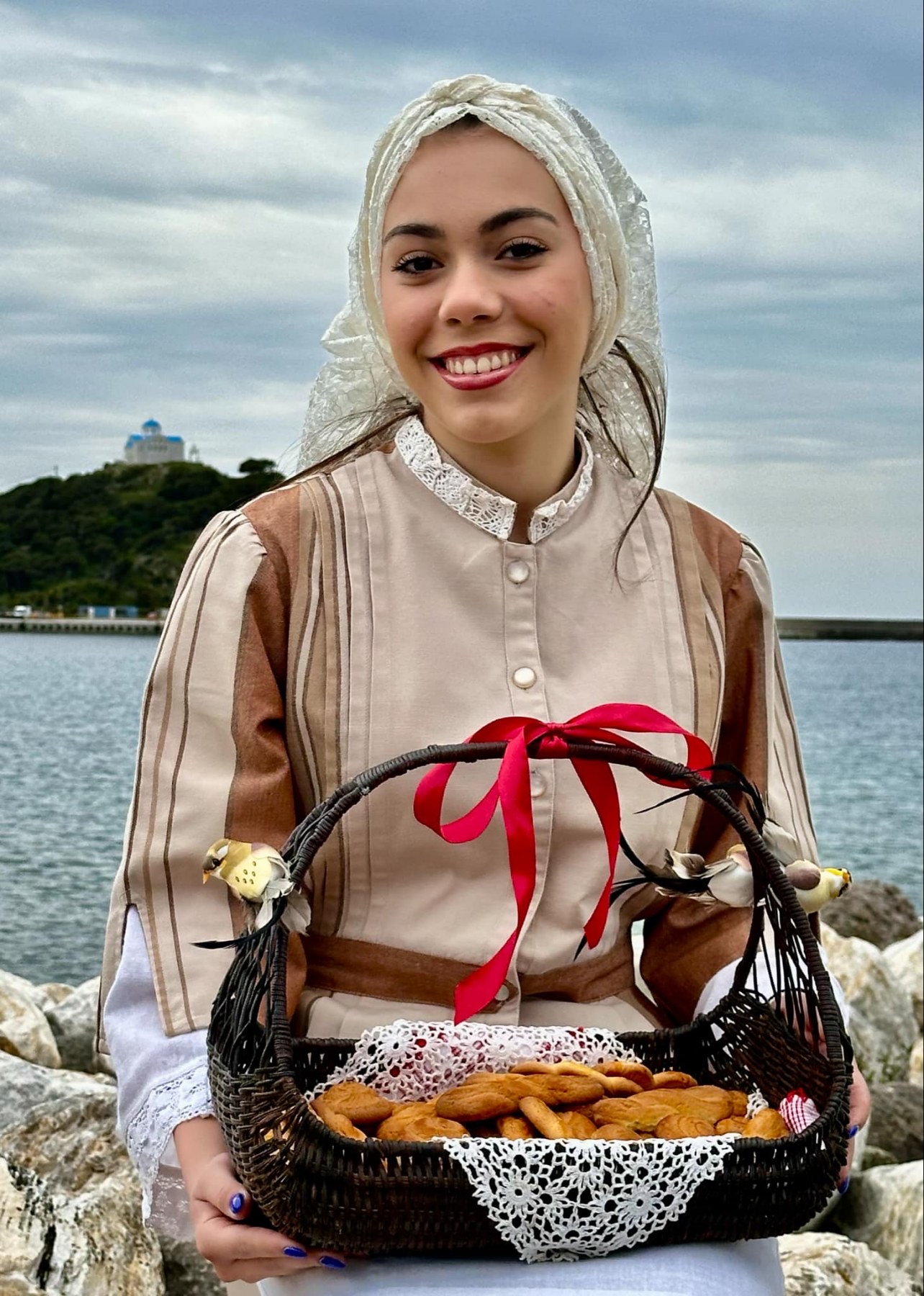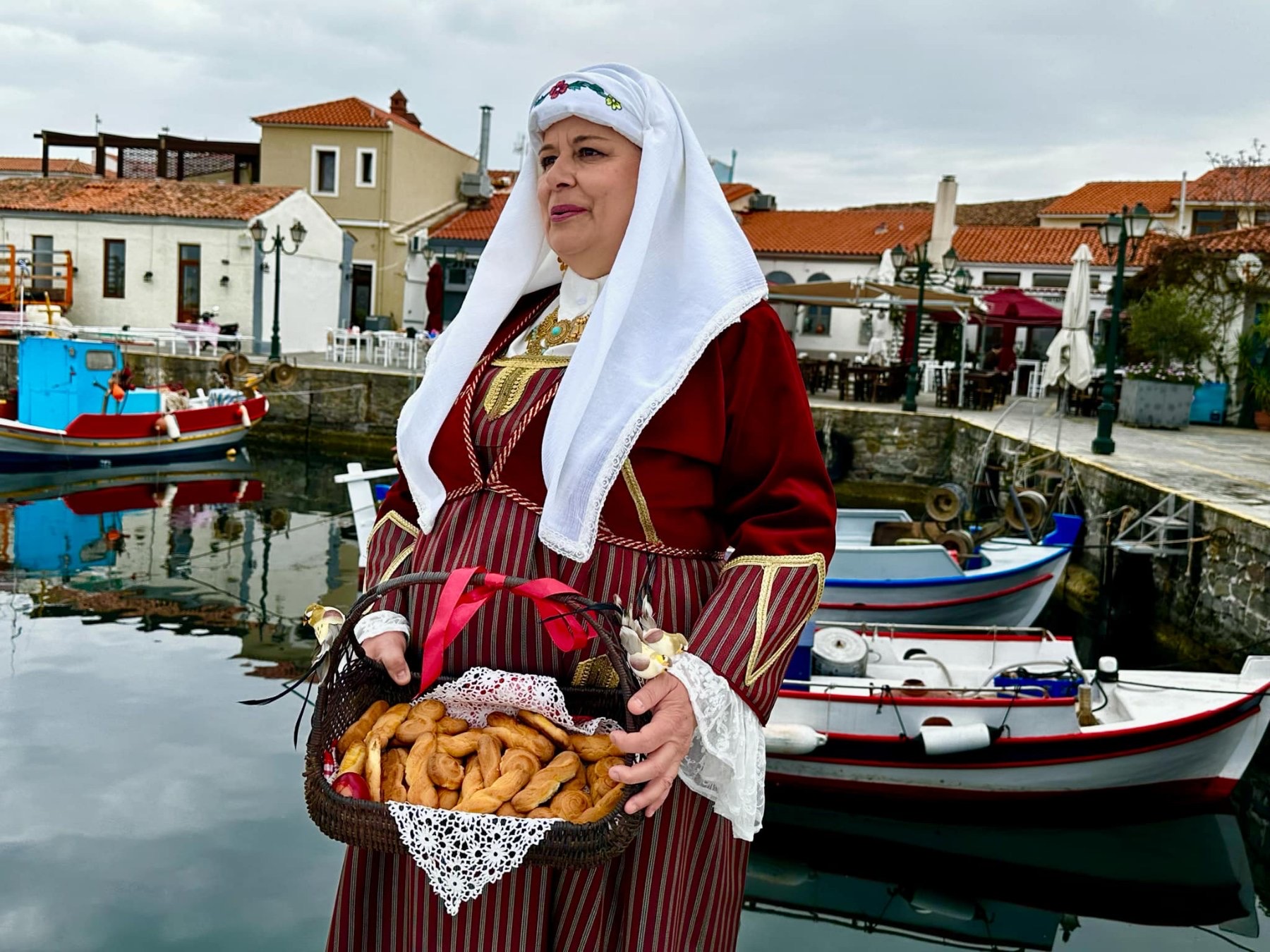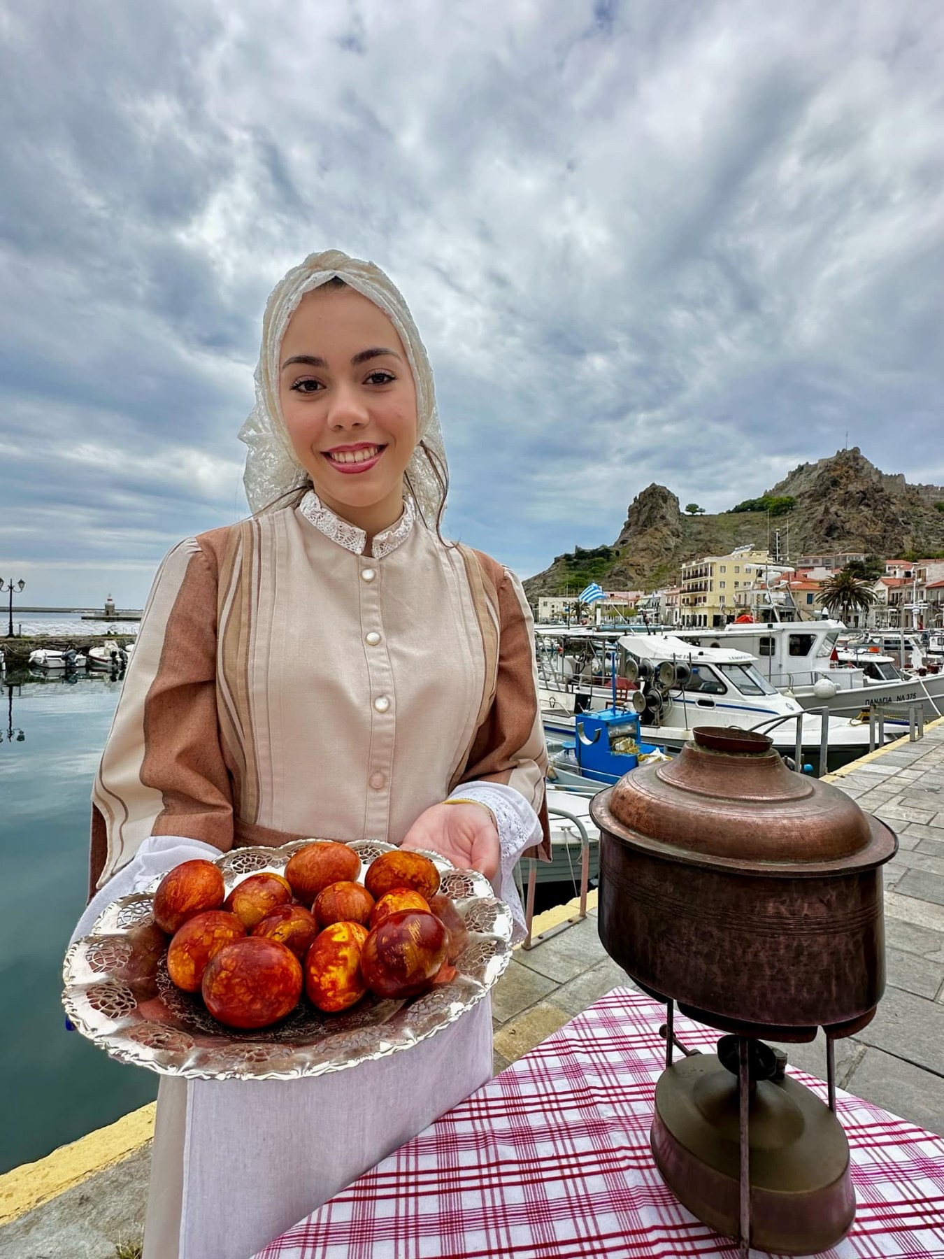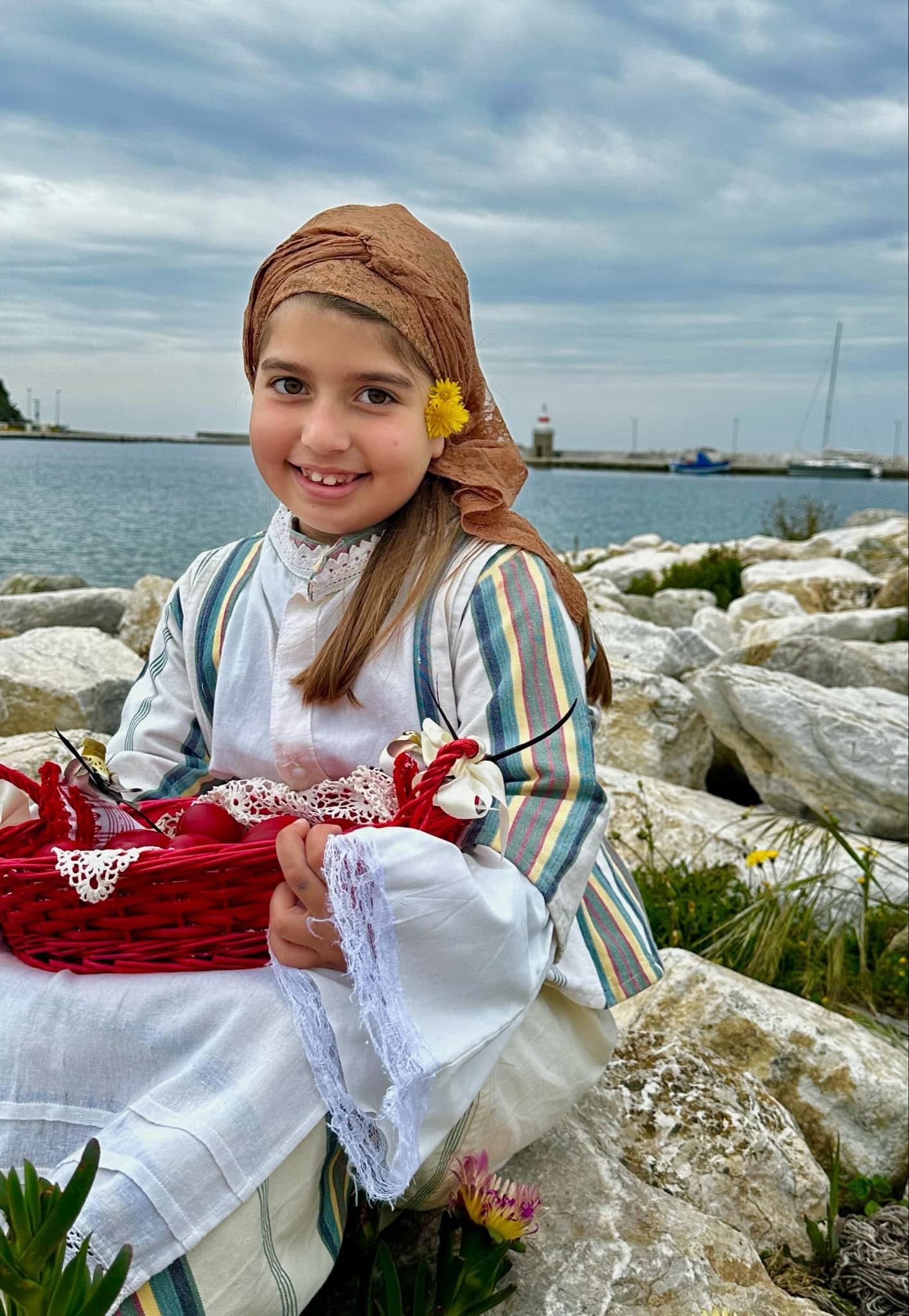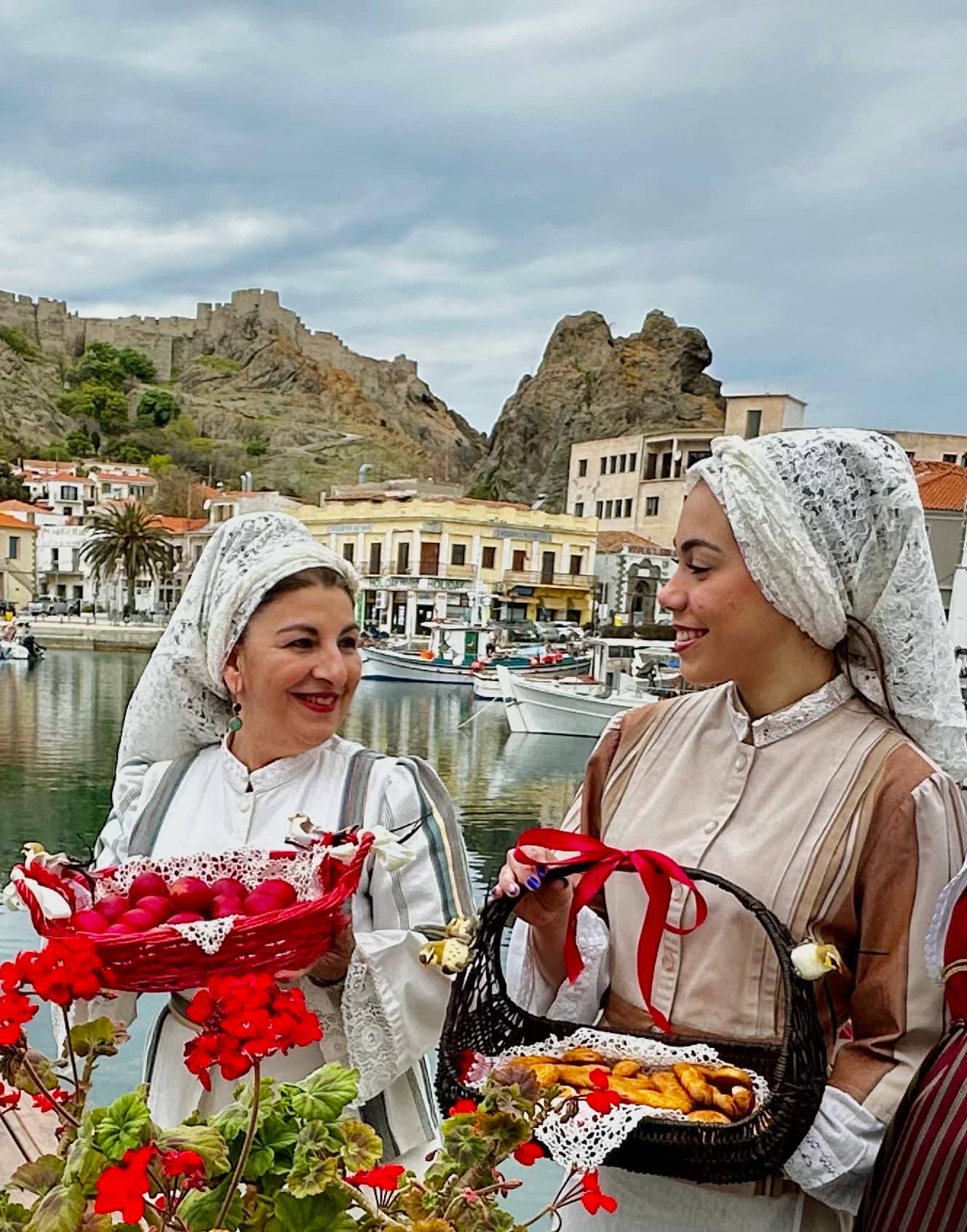 Μέλη του Ομίλου ντύθηκαν με τις παραδοσιακές τους φορεσιές και φωτογραφήθηκαν στο γραφικό λιμανάκι της Μύρινας, με φόντο την πασχαλινή αύρα και τα στολισμένα καλαθάκια γεμάτα κόκκινα αυγά και χειροποίητα κουλούρια.