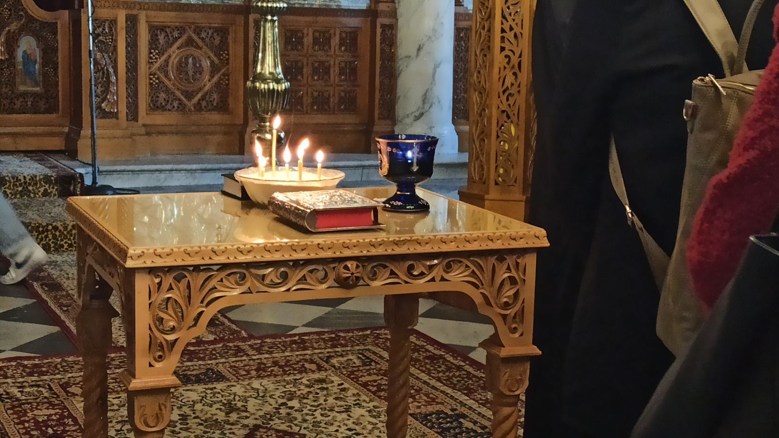 Ο ιερέας που σταυρώνει τους πιστούς με λάδι στο μέτωπο, τα μάγουλα και τα χέρια, πιστοί που περιμένουν καρτερικά, ανάμεσά στα πορφυρά υφάσματα της Μεγάλης Εβδομάδας.
