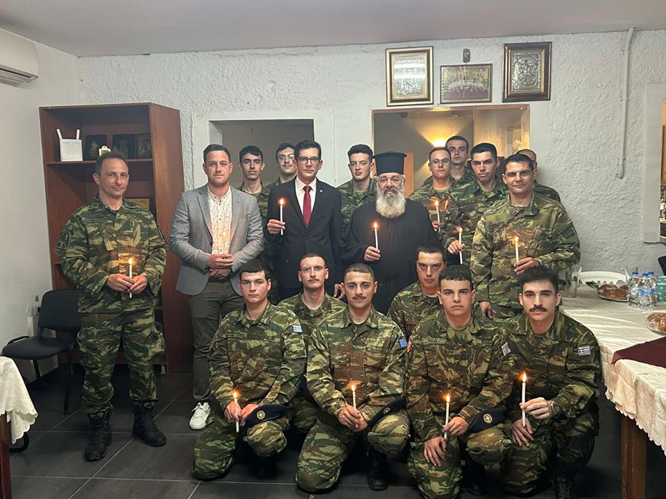 Ο Δήμαρχος και ο Πρόεδρος του Δ.Σ. παρακολούθησαν τη λειτουργία μαζί με τους οπλίτες και τα στελέχη που υπηρετούν στο νησί, εκφράζοντας έμπρακτα τη στήριξή τους σε όσους κρατούν «Θερμοπύλες» αυτές τις άγιες ημέρες, μακριά από τις οικογένειές τους.