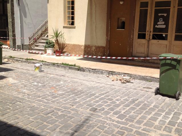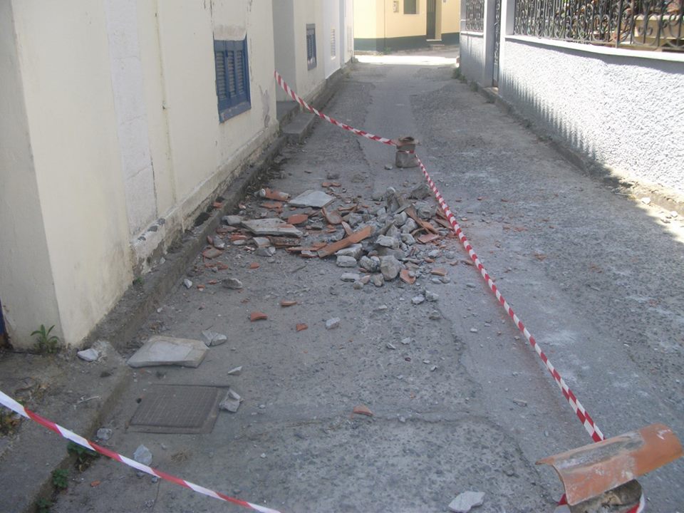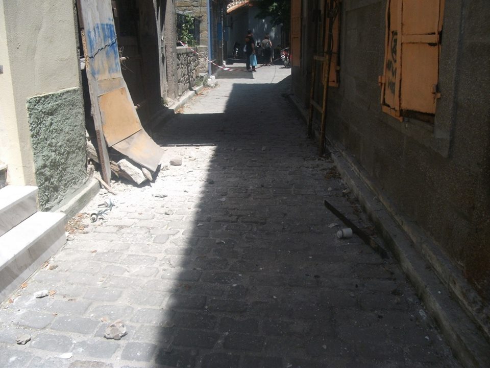 Αυτή την ώρα συνεργεία του Δήμου κλείνουν σημεία δρόμων μέσα στη Μύρινα, όπου έχουν καταρρεύσει κομμάτια παλαιών κτιρίων.