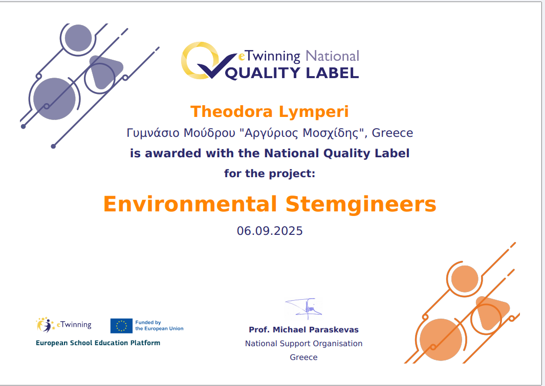 Η εθνική ετικέτα ποιότητας απονεμήθηκε για το σχολείο στη συντονίστρια και διευθύντριά του Θεοδώρα Λυμπέρη και στους εκπαιδευτικούς Ευαγγελία Τσάκου, καθηγήτρια Γαλλικής γλώσσας και Χρήστο Κουκούμη, χημικό ειδικής αγωγής, που εργάστηκαν για πολλούς μήνες και συμμετείχαν ενεργά στο έργο, καθοδηγώντας μαθητές και μαθήτριες της Β΄ τάξης του σχολείου. Στα παιδιά πρόκειται να απονεμηθεί η ετικέτα τις επόμενες ημέρες, με την έναρξη του νέου σχολικού έτους.