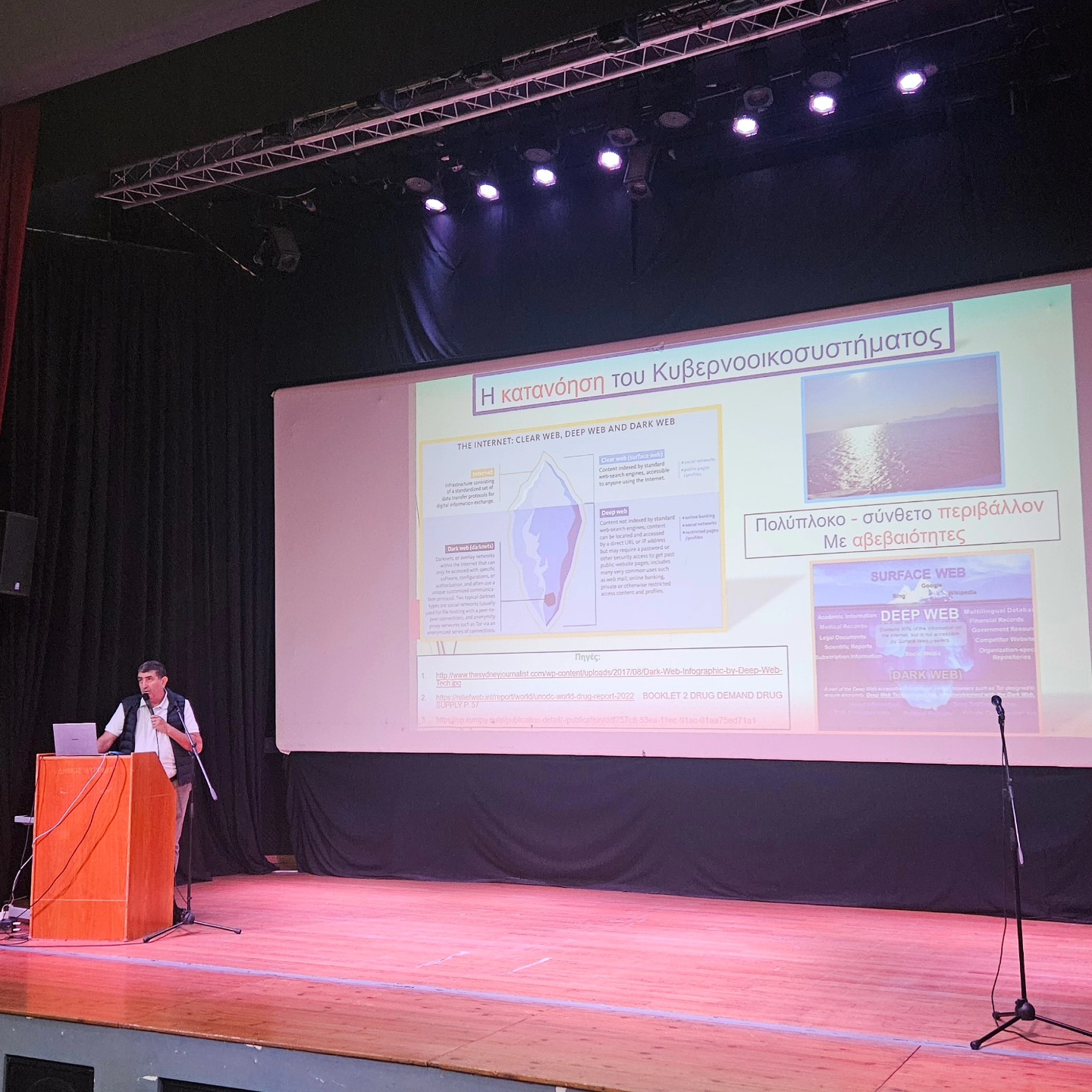 Κεντρικός ομιλητής ήταν ο κ. Γεώργιος Παπαπροδρόμου, Αντιστράτηγος ε.α. της Ελληνικής Αστυνομίας και πρώην Διευθυντής της Δίωξης Ηλεκτρονικού Εγκλήματος, ο οποίος ανέπτυξε το θέμα: «Κυβερνοχώρος: Μια νέα πραγματικότητα και οι προκλήσεις της».
