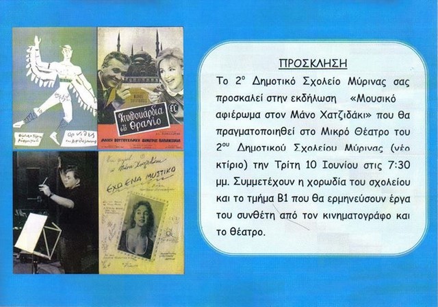 Συγκεκριμένα, σήμερα Τρίτη 10 Ιουνίου στις 7.30 μ.μ θα πραγματοποιηθεί «Μουσικό Αφιέρωμα στον Μάνο Χατζιδάκι» με τη συμμετοχή της χορωδίας του σχολείου.