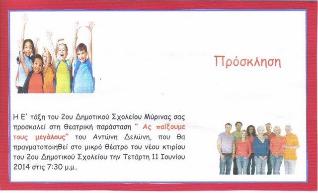 Αύριο, Τετάρτη 11 Ιουνίου στις 7.30 μ.μ θα πραγματοποιηθεί η θεατρική παράσταση «Ας παίξουμε τους μεγάλους» του Αντώνη Δελώνη, ενώ την Πέμπτη 12 Ιουνίου στις 11.00 το πρωί για τους μαθητές και στις 7.00 μ.μ για τους ενήλικες θα δούμε ακόμη μια θεατρική παράσταση από τους μαθητές της ΣΤ΄τάξης.