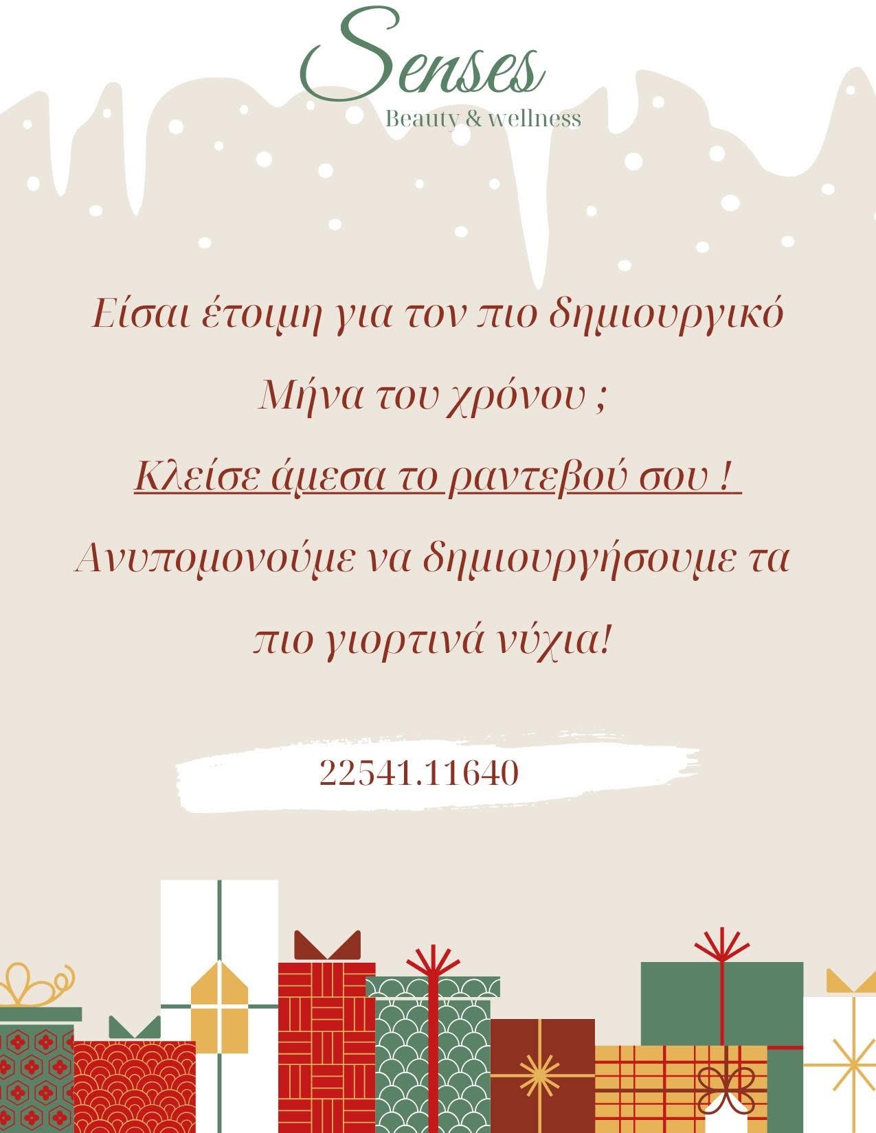 Κλείσε άμεσα το ραντεβού σου στο 22541 11640 και άφησε την ομάδα του Senses να επιμεληθεί τα πιο γιορτινά σου νύχια!