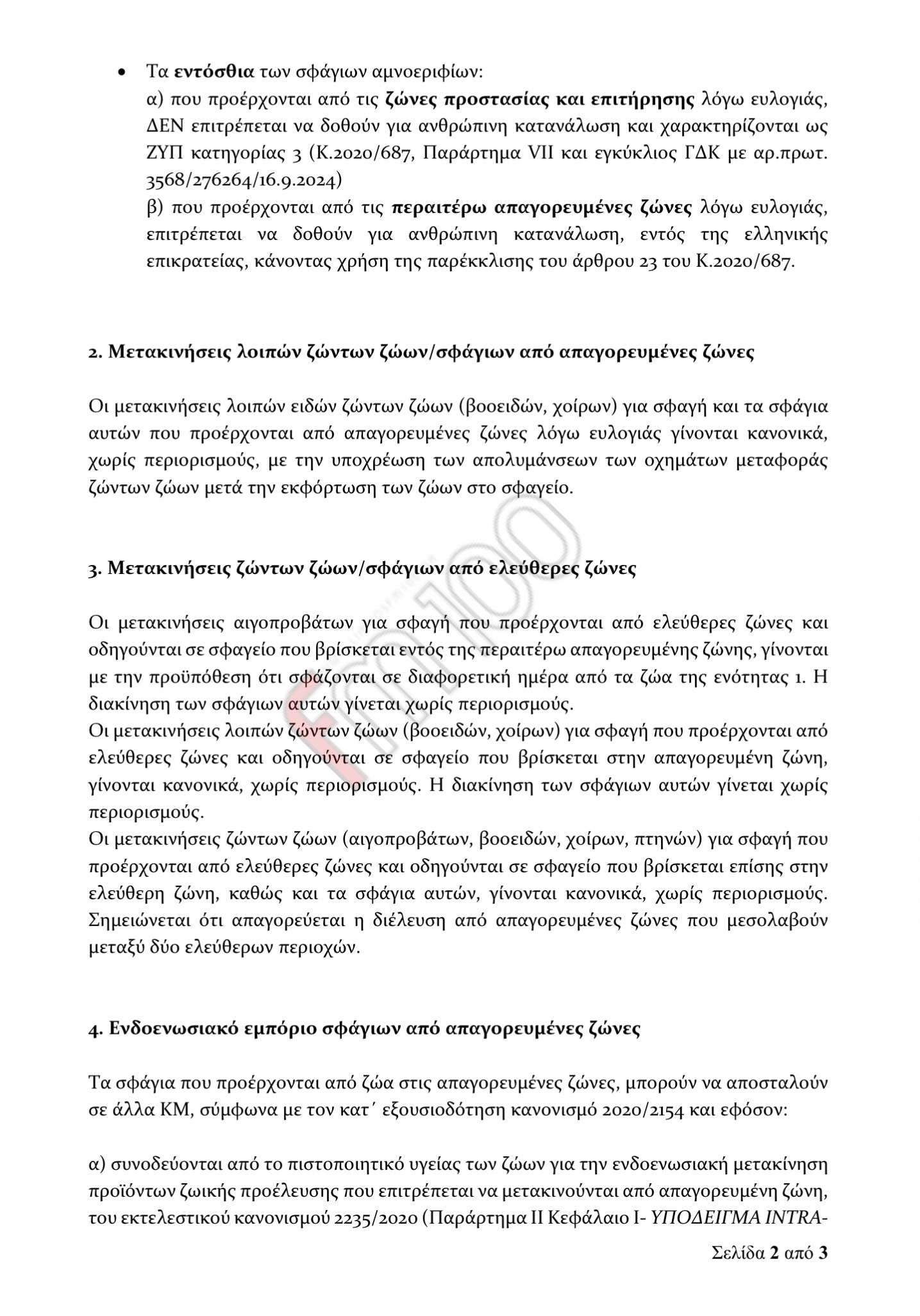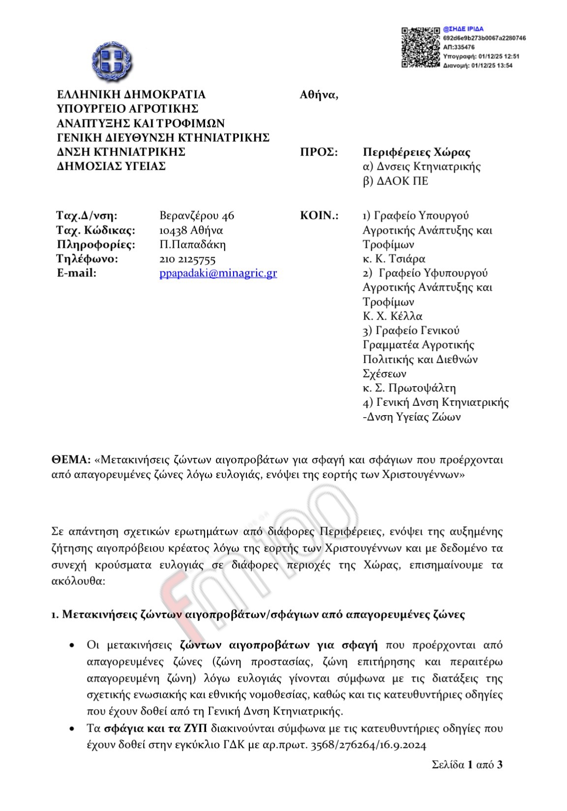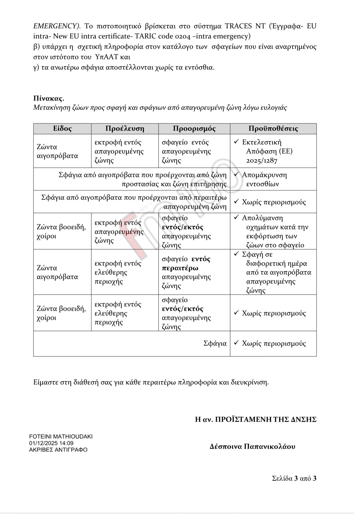 Παρακάτω η εγκύκλιος/διευκρινιστική οδηγία που εκδόθηκε από τη Γενική Διεύθυνση Κτηνιατρικής και στάλθηκε στις Περιφέρειες, στις ΔΑΟΚ και στις Κτηνιατρικές Υπηρεσίες, ώστε να εφαρμόσουν ενιαία το πλαίσιο για τις μετακινήσεις ζώων ενόψει Χριστουγέννων!
