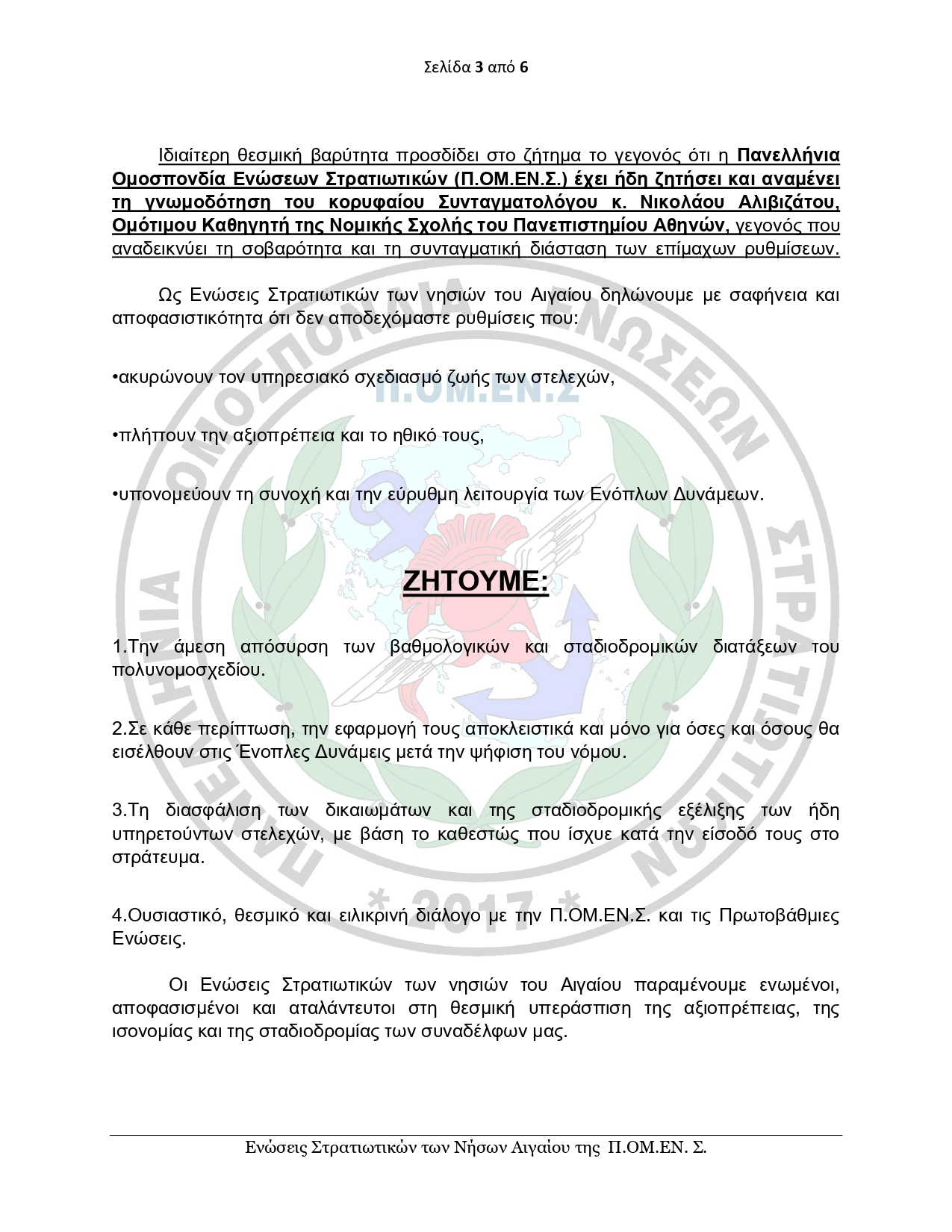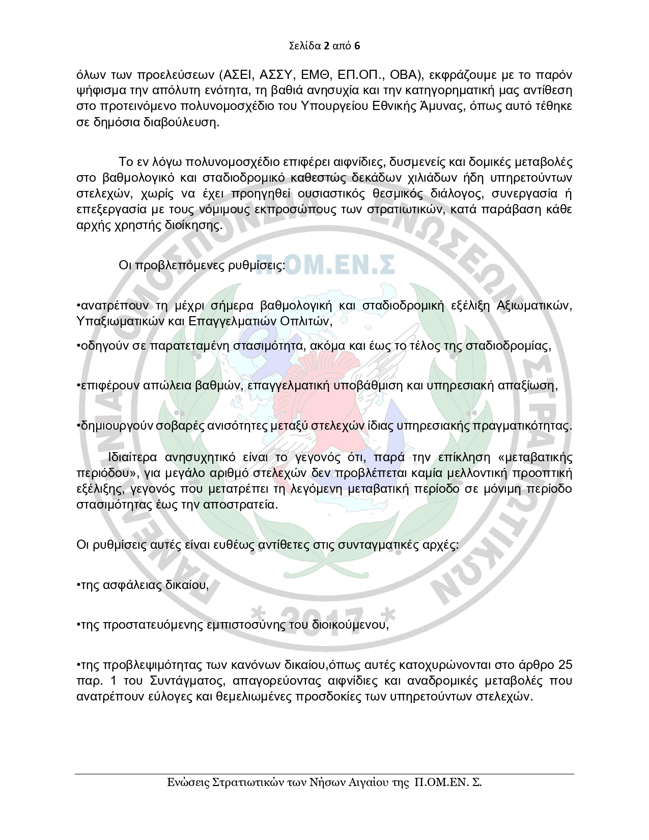 Ιδιαίτερη αναφορά γίνεται στη συνταγματική διάσταση του ζητήματος, καθώς, όπως επισημαίνεται, οι προβλεπόμενες αλλαγές παραβιάζουν βασικές αρχές, όπως η ασφάλεια δικαίου και η προστατευόμενη εμπιστοσύνη των υπηρετούντων. Παράλληλα, γνωστοποιείται ότι η Πανελλήνια Ομοσπονδία Ενώσεων Στρατιωτικών έχει ζητήσει γνωμοδότηση από τον συνταγματολόγο Νίκο Αλιβιζάτο, γεγονός που υπογραμμίζει τη σοβαρότητα των ενστάσεων.